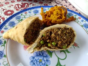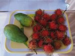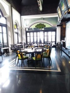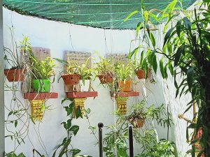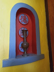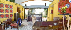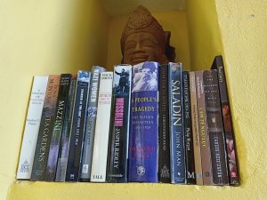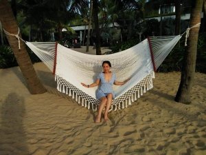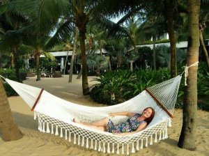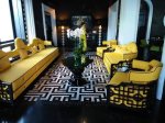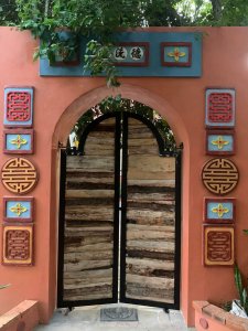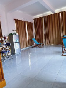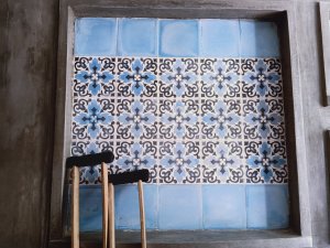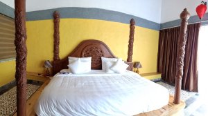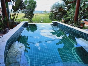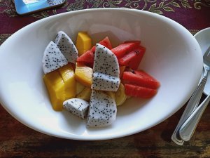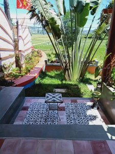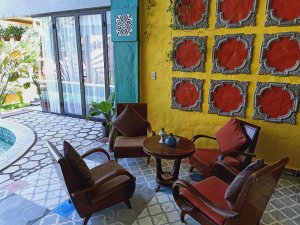 You could be forgiven for thinking the decorator was radically colour blind and that he had borrowed someone else’s paints, at first, but it did have the wow factor. The private pool had non-slip stone edges and integral steps, there was a full size fridge, the high ceilings and outside living area were impressive. The bed and linen were the best I’d encountered in Vietnam and I had to ask Bich (the owner) where it can be bought. There were fresh flowers on the dining table, a kitchenette and the bathroom was fantastic. The concrete, non-slip sunken bath was my favourite thing in there and ideal for my injuries. The internal doors are wonderfully carved as well as great at keeping out noise and light but Captain Caveman favoured the book collection the most.