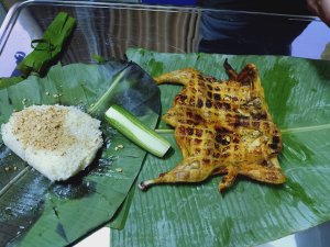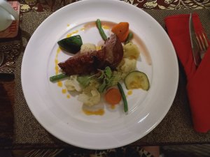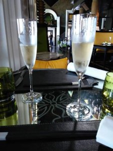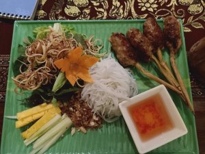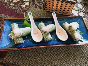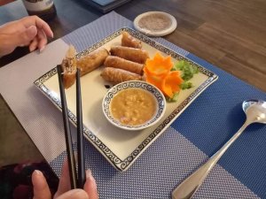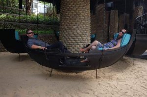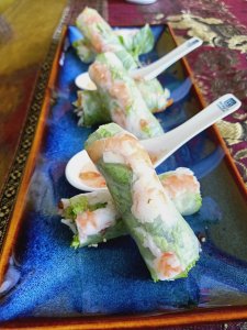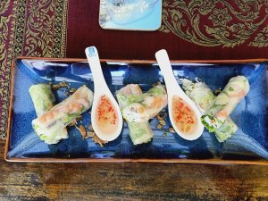 We had a swim and then ordered lunch which is brought by the lovely kitchen and bar staff, directly to the dining table in the villa. I had the spring rolls which were good quality while Captain Caveman enjoyed his sausage baguette (hot dog to us lot) and chips. We had lots of water already in the fridge, with chilled glasses and it’s reassuring to see that plastic bottles are a no-no in this establishment. From the outside of the pool villas there is a monster set of limestone junk boat sails which could be interpreted as a set of dragon wings or maybe even butterfly wings from a distance – an ideal Instagram spot just begging for the opportunity to be hashtagged!