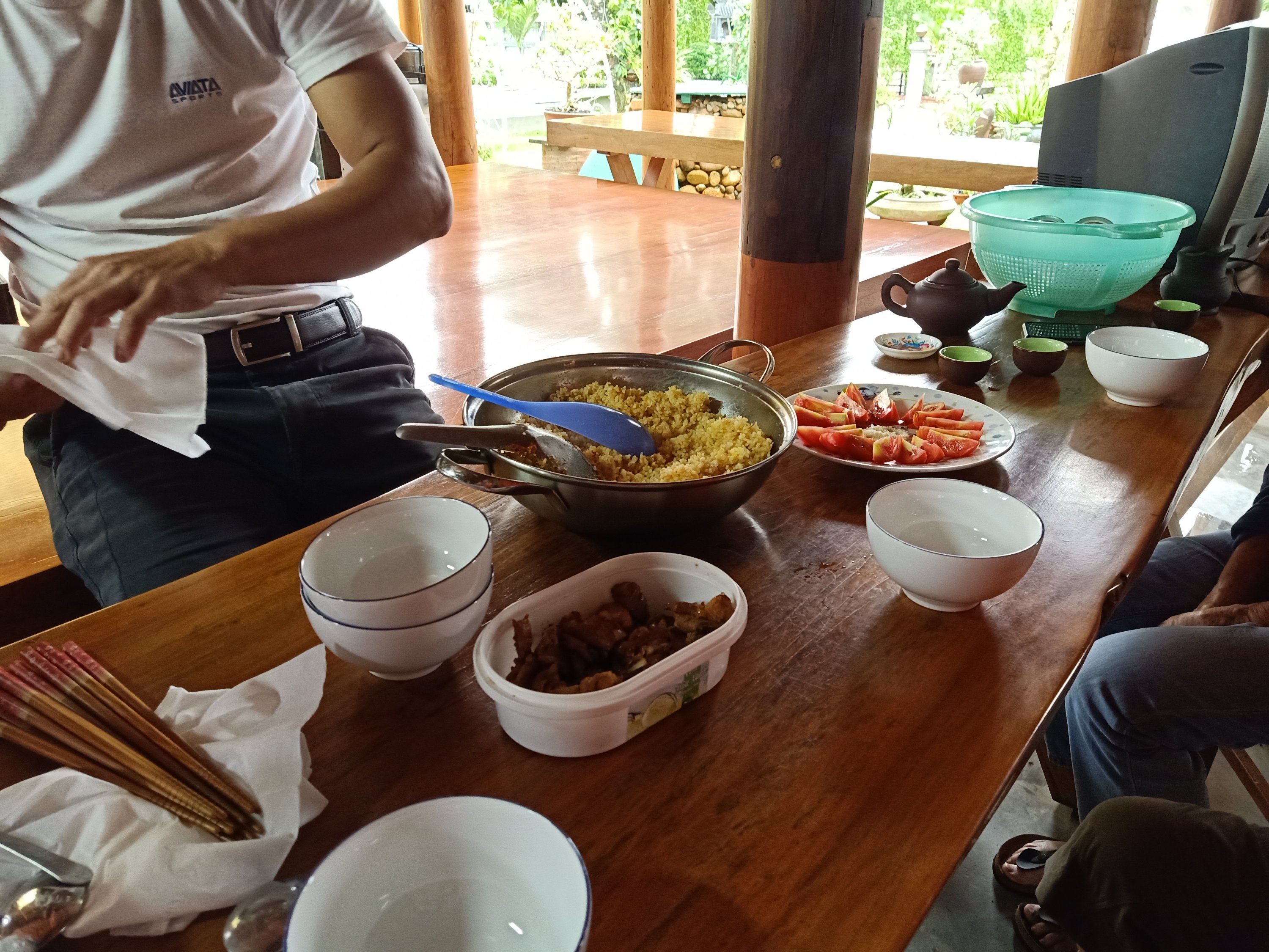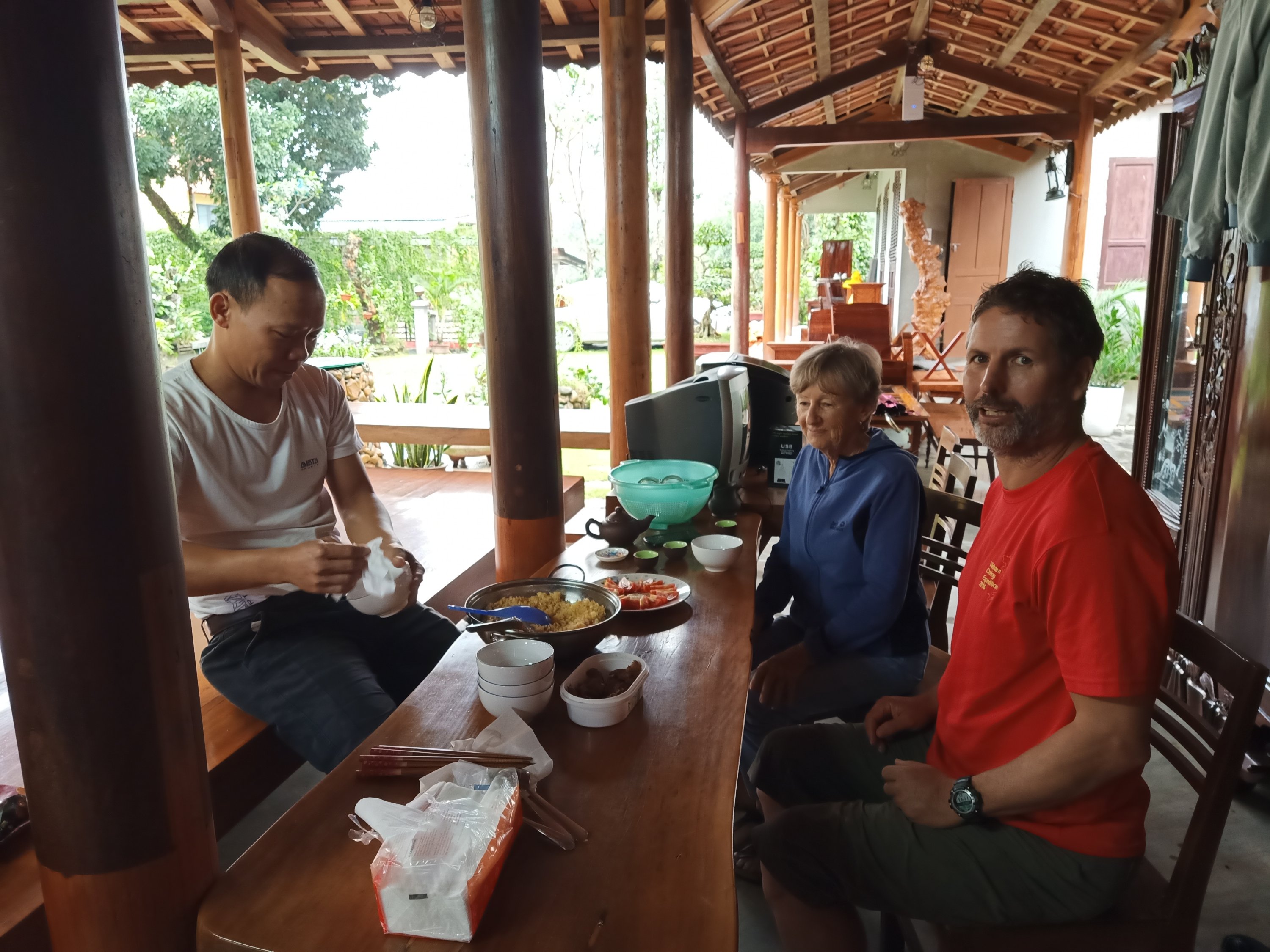 While I sat safely indoors imagining the clean up catastrophe out in various locations in Phong Nha and feeling slightly guilty that I wasn’t even helping, Veronika and I had managed to get invited on a lunch date. Co had invited us, via translating with Michael, to join him for some fried rice at the staff house and, because we had already turned down the offer of a beer the day before, we thought we should accept. We speculated that it may be a thank you for putting the neighbours up during the floods so we took some snacks and a bottle of sparkling wine. Captain Caveman made it back just in time and we all sat and watched Co cook, it smelled lovely and even though I’d had a significant amount of breakfast I knew I could always eat fried rice. Mr Ky, the dog, was there and Captain Caveman was able to pet him but because of being unsteady on my leg still, I didn’t. We had some really tasty pork with fried rice, we used Google translate to chat a bit with Co and Duyet. The food was really good and we left believing the reason we were invited was because they were worried we weren’t getting enough food! So now, not only were we the most privileged people in Phong Nha we had the staff feeling sorry for us and making us a meal – how embarrassing! We would find out much later that this was not the case but it was no less embarrassing.