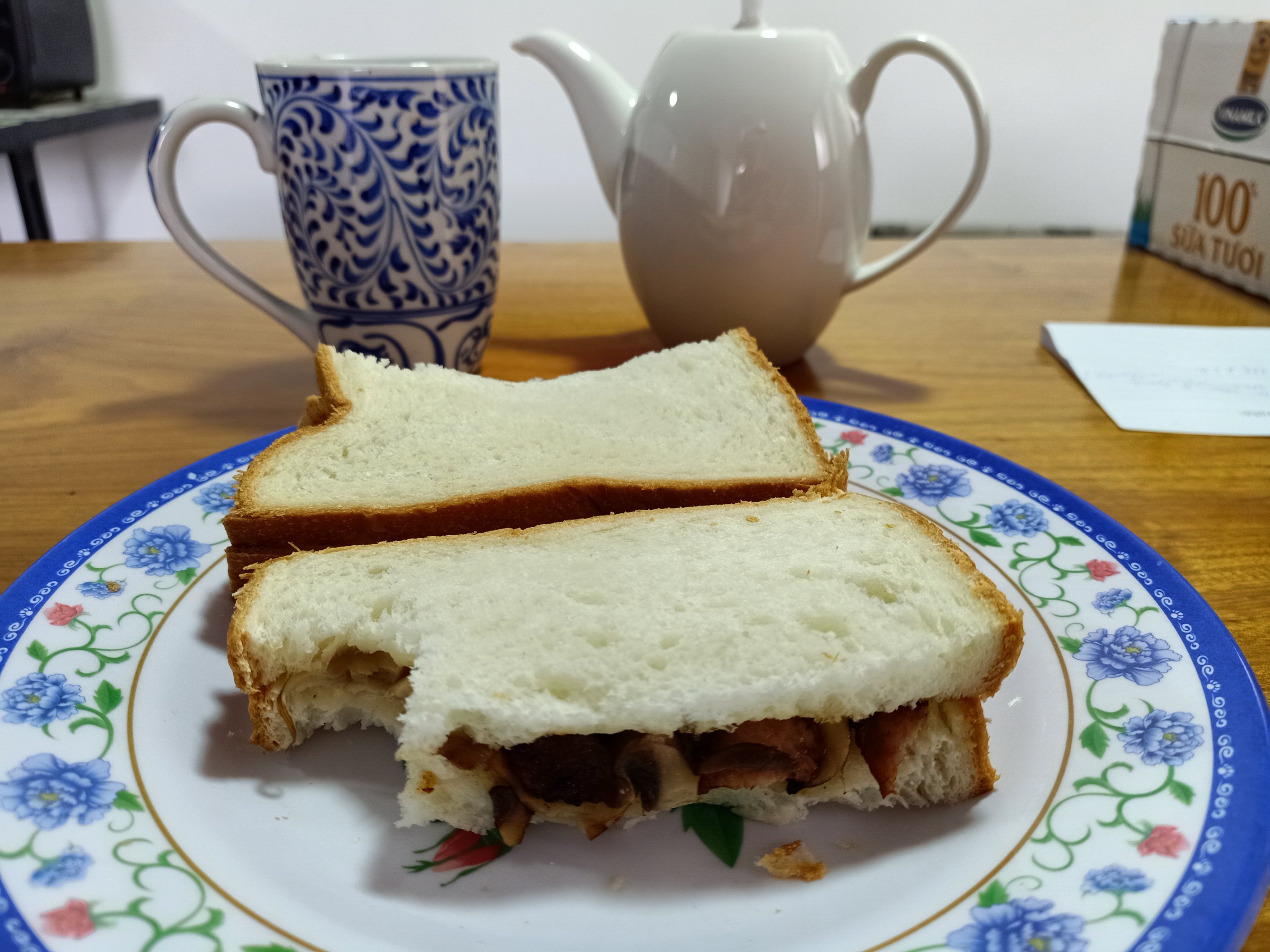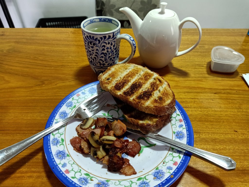Typhoon Molave had caused quite a bit of damage in the Philippines and it was on course to hit central Vietnam this week! On Tuesday 27th October people were genuinely worried that the storm to next hit could be a big one and were doing all they could to prepare for the worst. Meanwhile, in our ‘ivory tower’ and privileged position we were doing ok. Except for the fact that I was now definitely sick with this incredibly snotty cold, sore throat and a bad head everything at our home was pretty tickety boo. Captain Caveman made breakfast and I had bacon, mushrooms and 2 slices of buttered sourdough with a pot of jasmine tea while Captain Caveman made himself a huge omelette in a sandwich!!!