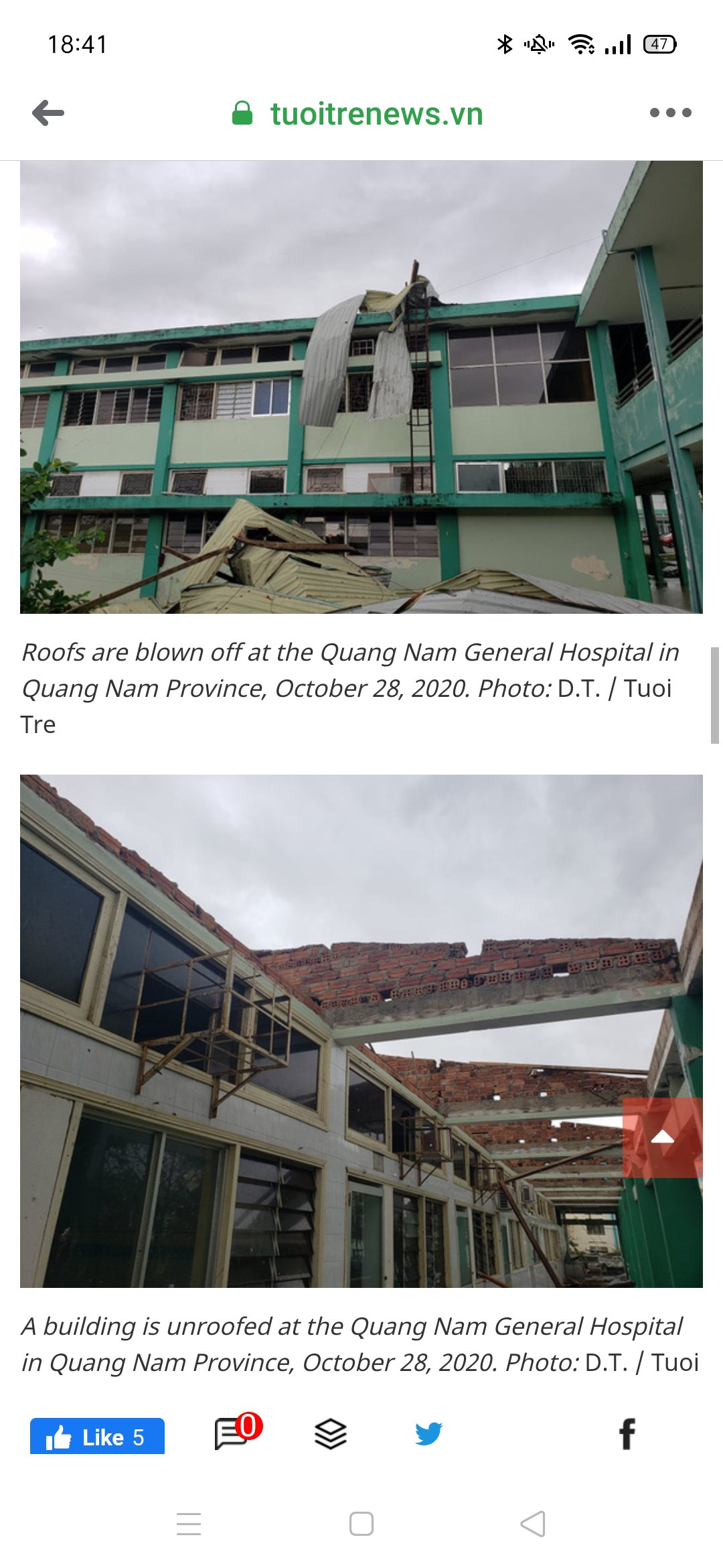 Before 8am on Thursday 29th October the tropical storm Molave had passed and, once again, we were extremely lucky. There was some damage in Phong Nha and flood water had come in at certain places but it was not the devastating results that had been predicted. Obviously our place was absolutely fine except for Ky, the dog, now had nothing left of his shelter and the odd plant pot had blown off and broken. The Farmstay water levels were high but the building had not flooded and we all breathed a sigh of relief. Elsewhere in Phong Nha town, where the market usually is, it was flooded again and some of the people who had vulnerable properties had some damage but on the whole people had been evacuated and considered themselves very lucky. In Danang and Hoi An they had been battered by Molave with significant damage, trees blown over and wind damage to property. In Quang Nam a whole roof had blown off the central hospital and there had been an horrendous landslide burying 53 people of which 15 bodies had already been recovered and a dangerous search continued.