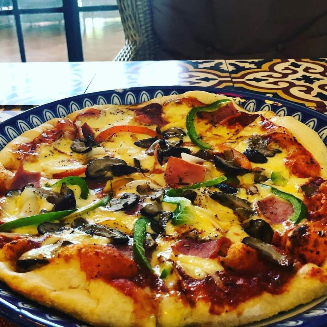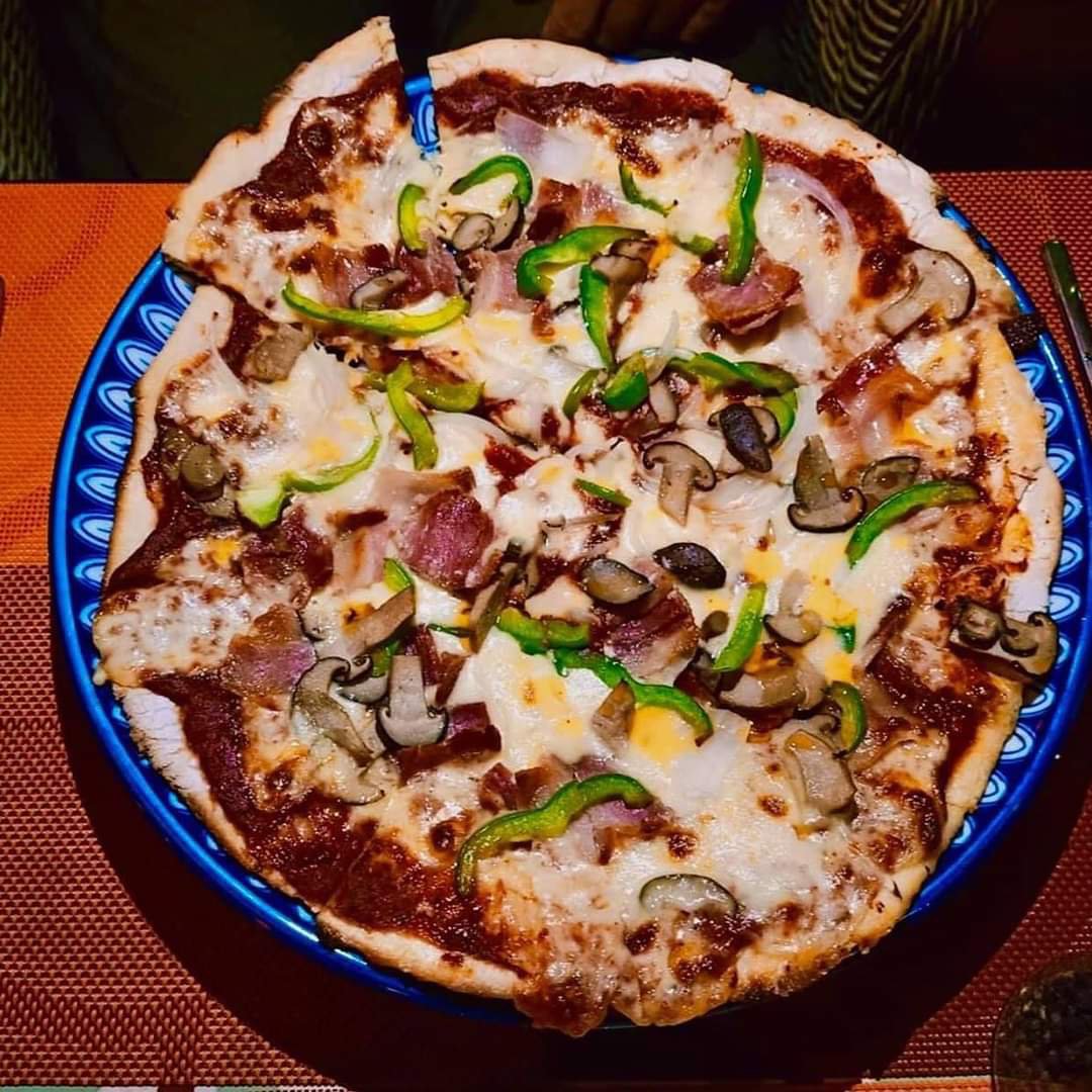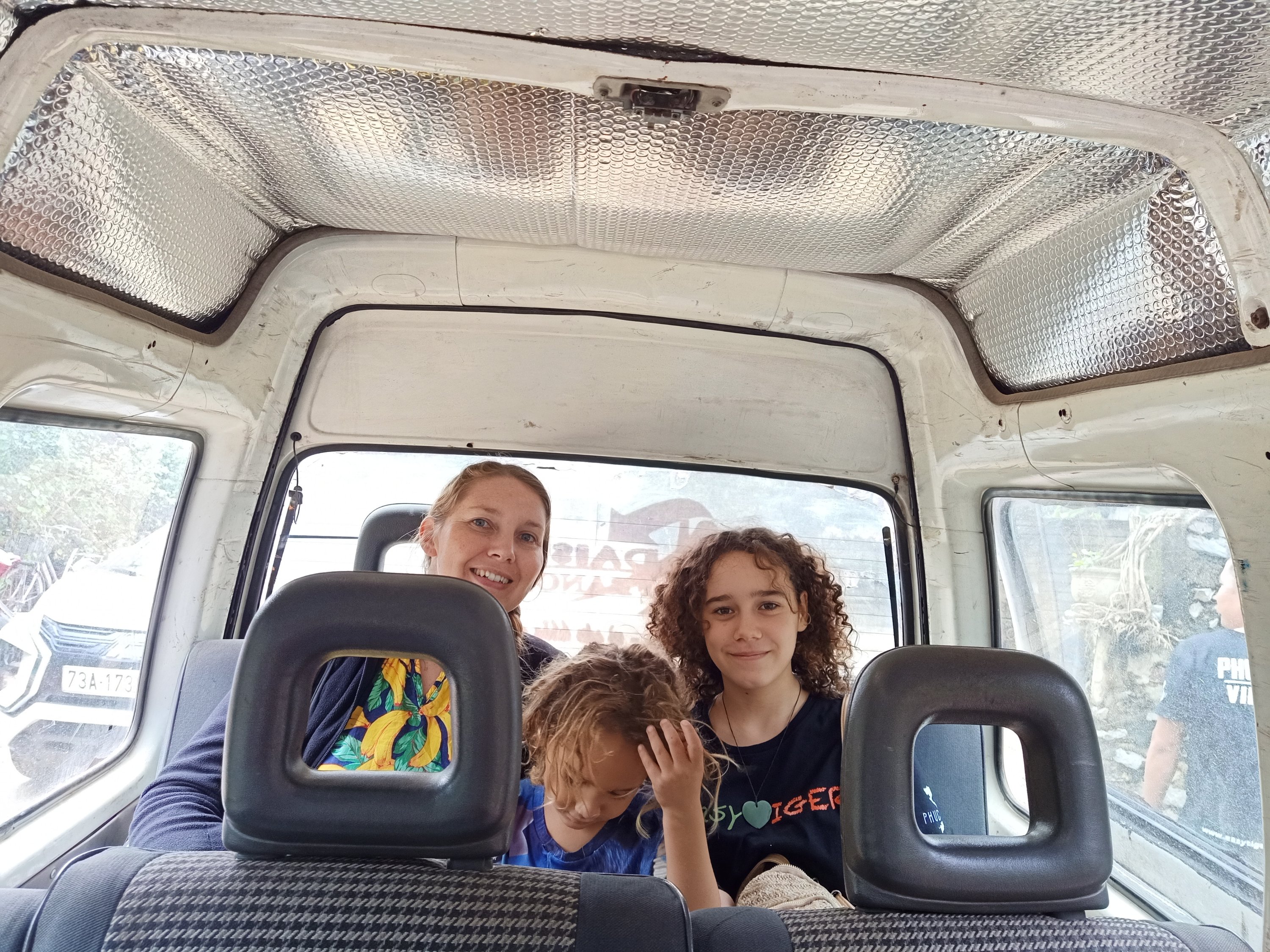 Ben, Bich, the kids and all the Farmstay guests picked up the 3 of us and the 5 neighbours and we had a full sunshine bus to The Villas for all you can eat pizza. When we arrived a large table was set up ready for us all and it was pouring with rain. The staff came out with umbrellas and I was helped up the wet steps. Captain Caveman and I shared a bottle of wine and the pizzas were excellent. The night went well and we all had a great time. I checked my exercise plan from Ruth which looked impressive and I decided to start it tomorrow, not after a wine or two!