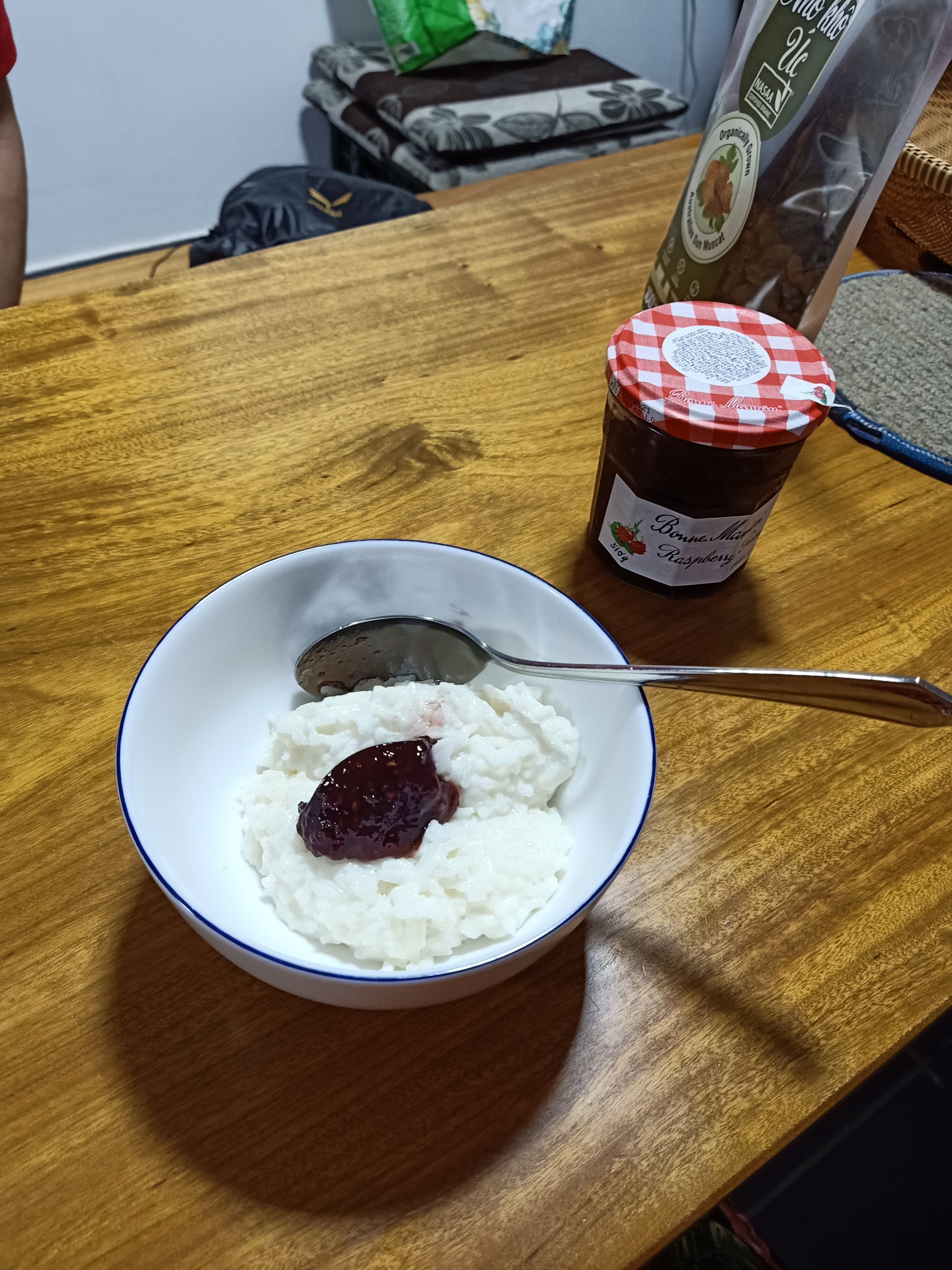 Captain Caveman decided that we wouldn’t have breakfast together on Tuesday 10th November and instead he went for coffee at Tree House cafe (formerly Capture cafe) and petted a nice puppy. As I was left at home I treated myself to another crisp sandwich, this time with balsamic vinegar flavour, for breakfast. I was looking a bit rough and tired so I decided to have a bit of a pamper after my hot shower and put on some moisturiser – I left it on as a facemask to soak in and it felt really nice. I put lavender moisturiser and socks on my feet and some nice hand cream I bought in Dong Hoi on my hands and elbows. By the time Captain Caveman got back for lunch I was looking loads better and feeling good. He made us asparagus with salami and parmesan for lunch which was really tasty and then I made some rice pudding for a mid afternoon treat, I even had jam in mine. Duyet and Co came and moved our fridge back in to the kitchen (now that the floods had gone)so now we had 2 fridges, which made it easier for the weekly shop. After a bit of work on the laptop, which I had finally got out so that I could brush up my CV, and register on some online job sites, it was already wine o’clock. Captain Caveman and I shared a bottle of red and he cooked pasta with salami and peppers. We didn’t manage a walk today because of the rain but I did my exercises and then accidentally noticed I could almost bend my bad leg enough to cross my legs!