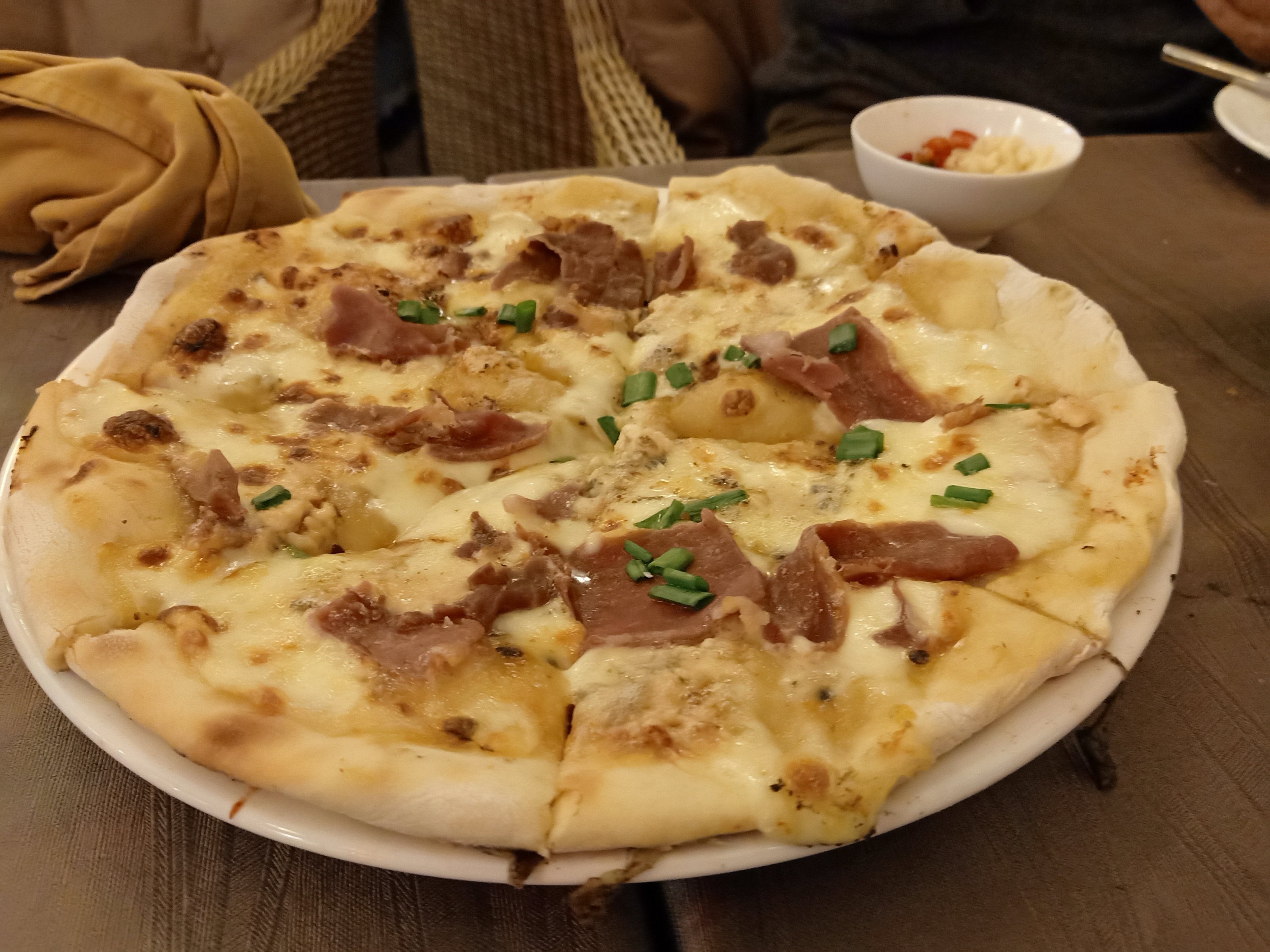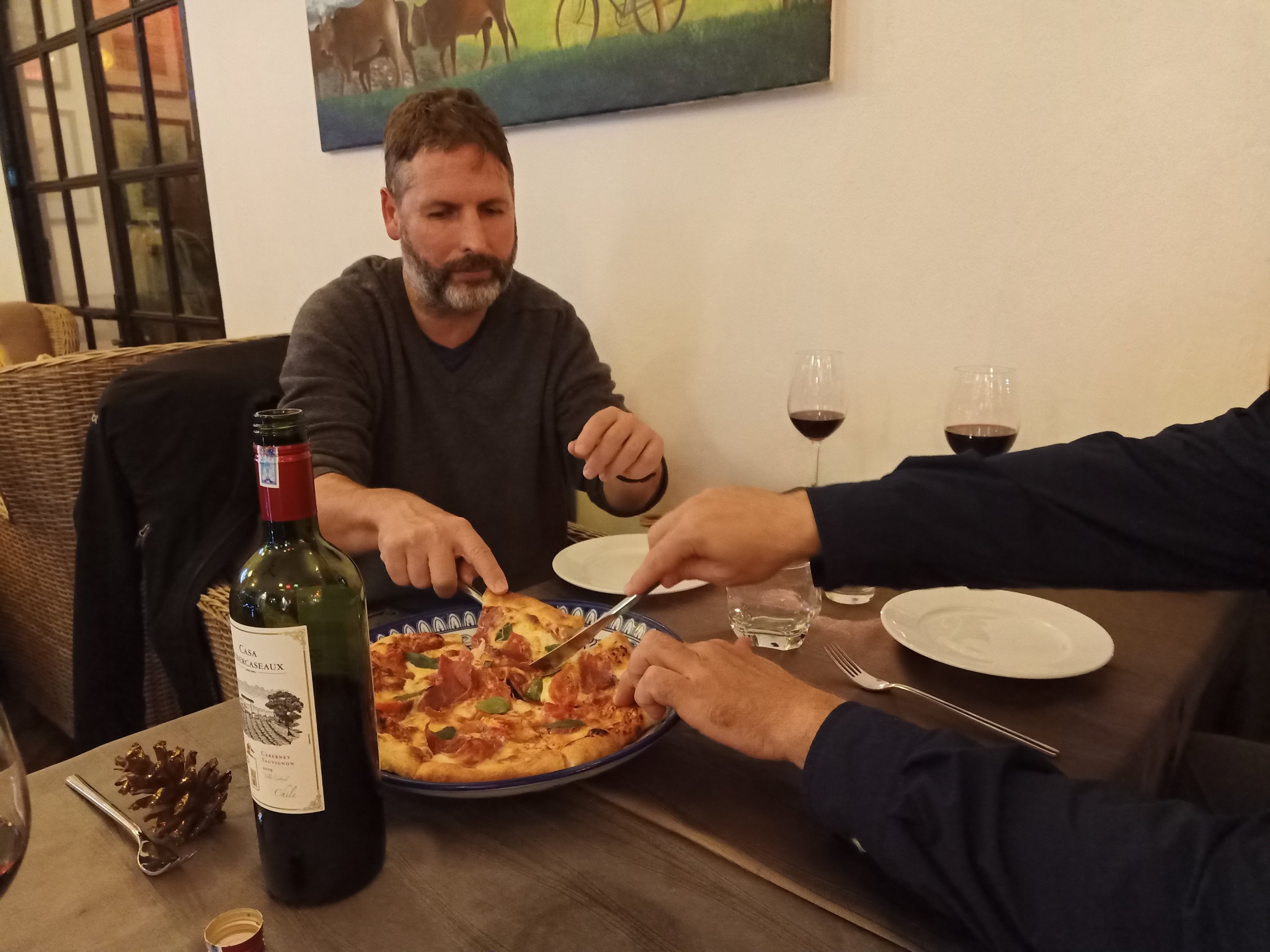On Friday 18th December I had a breakfast of dragon fruit and an apple. For lunch Captain Caveman made us salami and asparagus (he had egg) with parmesan and I had 2 pots of jasmine tea. In the afternoon, after a bit of work for me and some House of Cards on Netflix for Captain Caveman, we went to the Farmstay for a drink. It was pizza night at The Villas so transport was layed on to take us all there for 6pm. Veronika was due back from a few days away and went straight to The Villas, there was quite a crowd of us. Captain Caveman and I sat with Matty and shared a couple of bottles of wine. Momma D was there with the cavers, having ordered takeaway pizza and a salad as we arrived, she was excited to be having Watto and Martin (UK cave experts) back and she was preparing a special dinner for them at her rooftop bar after they had finished their quarantine in Hanoi. We welcomed a lovely new Farmstay guest, Annette, to our table, with Veronika, as Ben asked us all to try his buffalo pizza – a great new addition to the pizza menu. It was a great night and I thoroughly enjoyed our company as well as so much pizza. Back home I was excited to hear that my cushions were ready to collect in Dong Hoi!