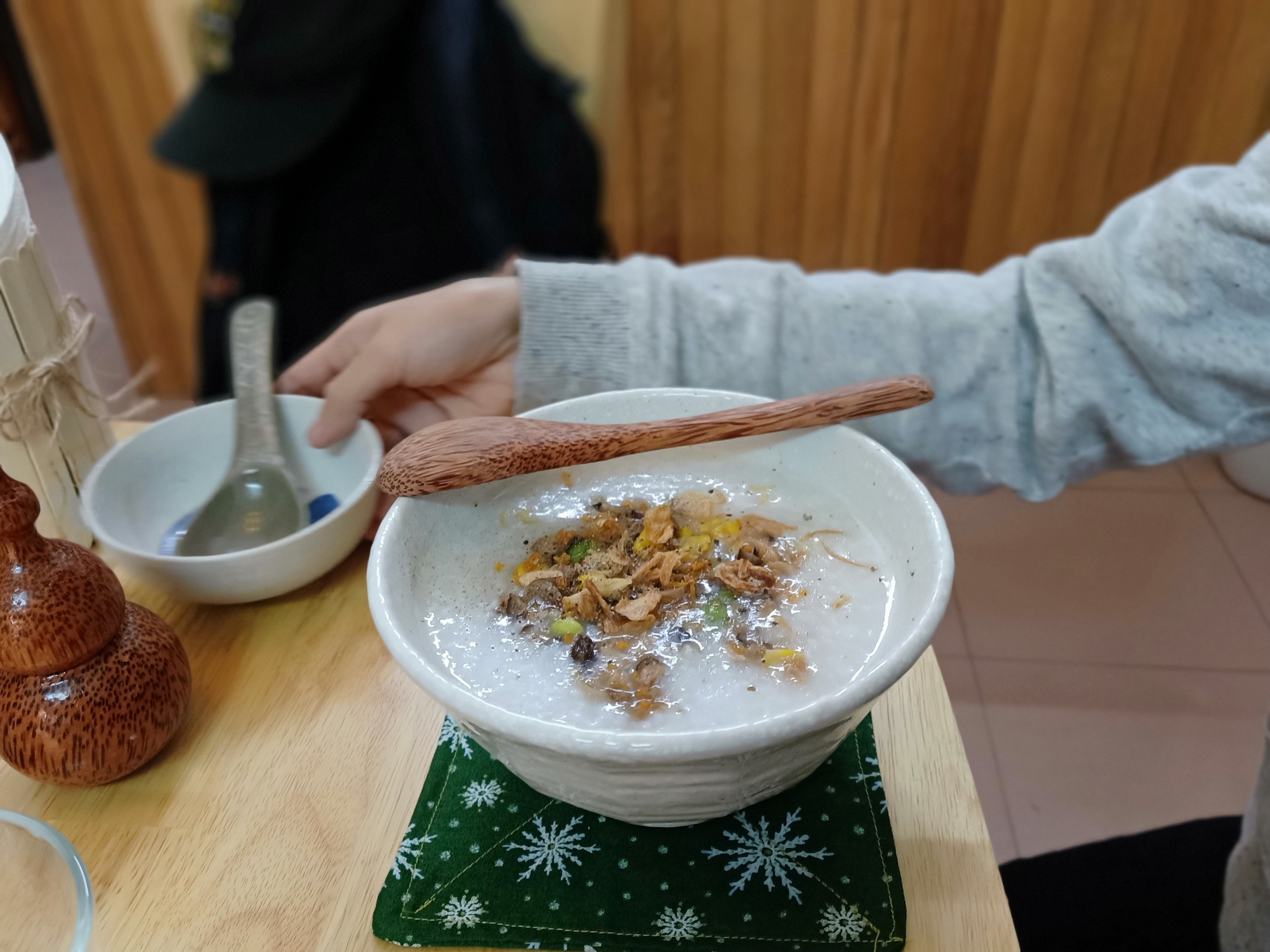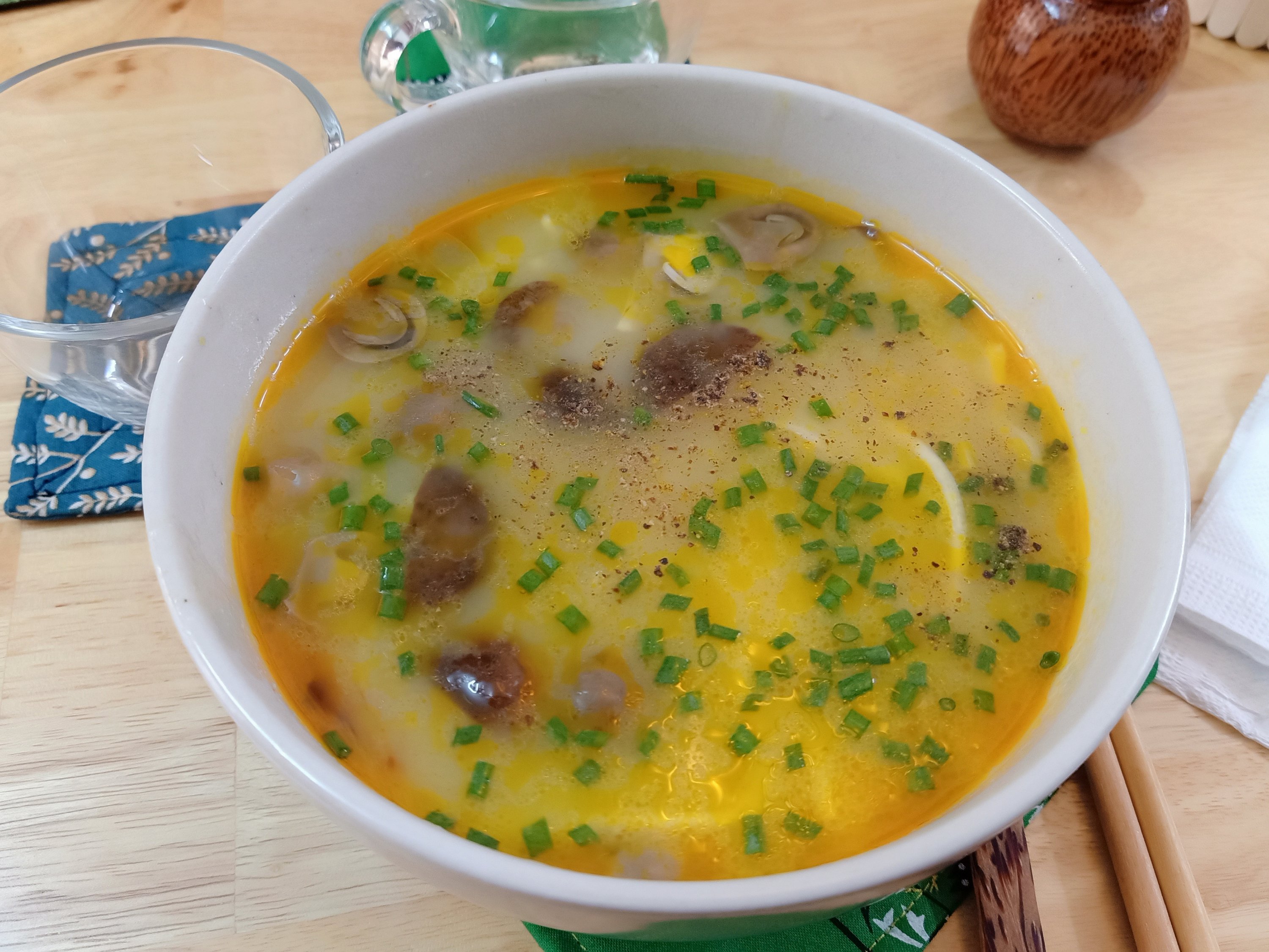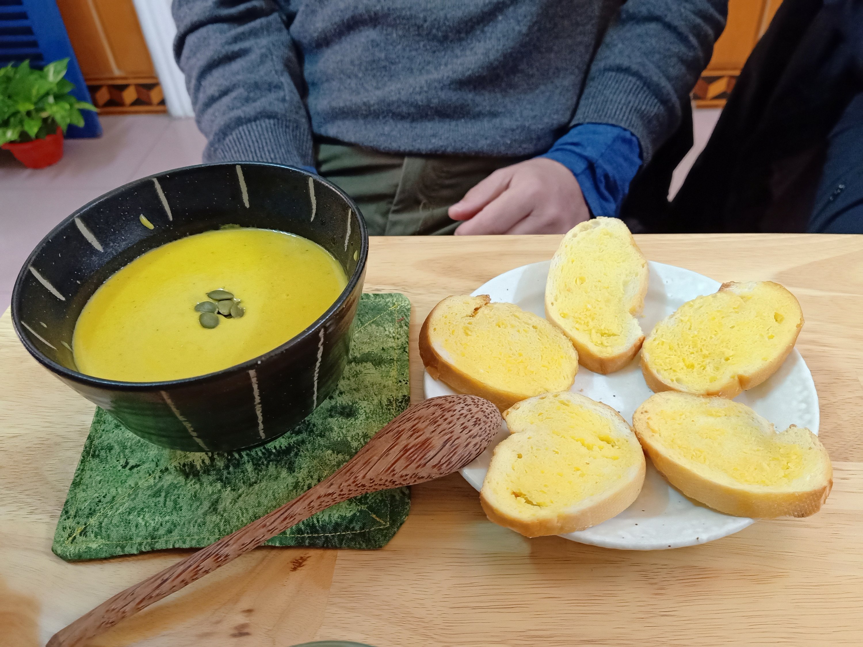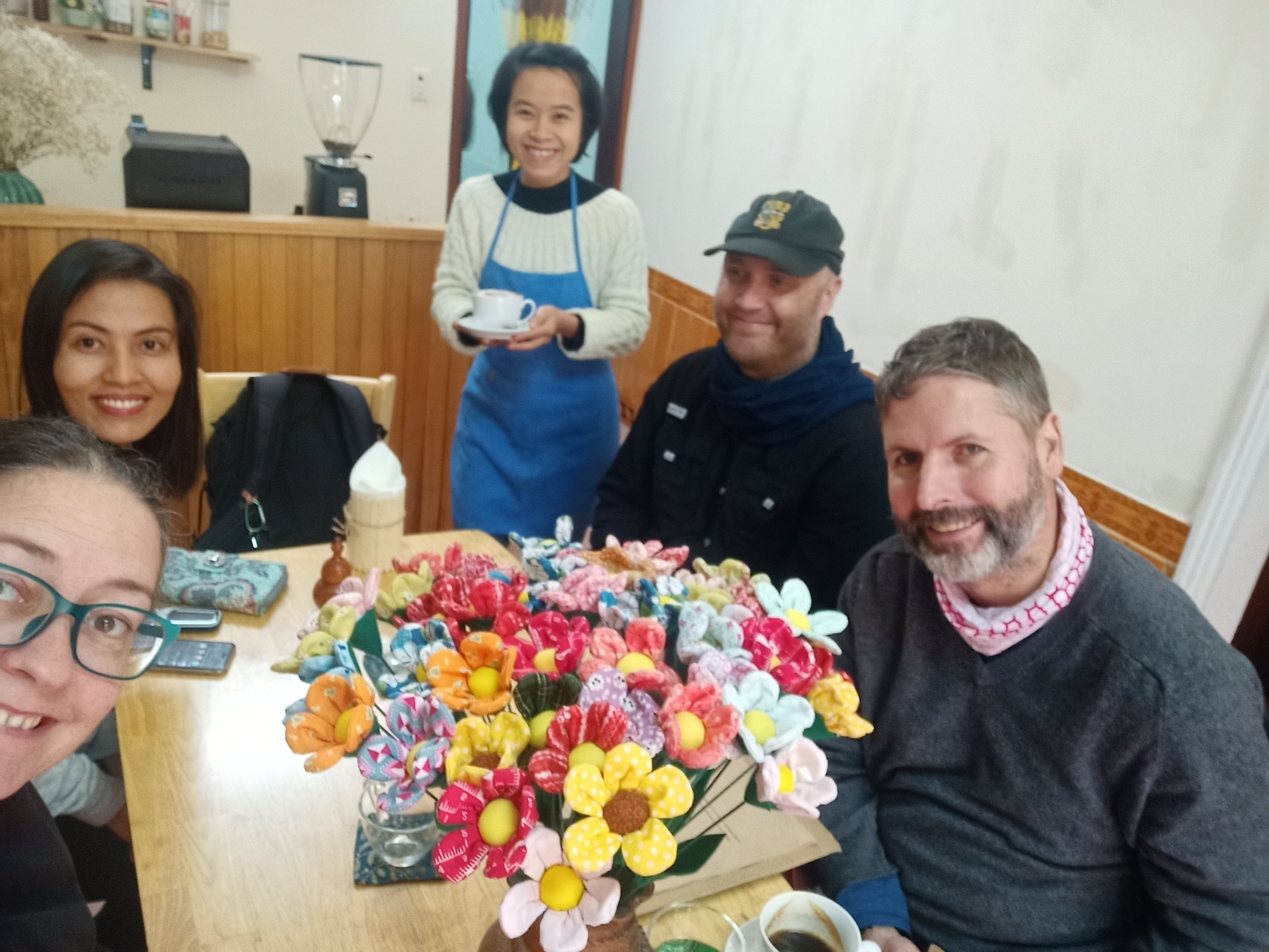 After the over indulgence of the previous night’s ‘all you can eat pizza’ I was looking forward to a healthier day on Saturday 19th December. When I woke up it was cold and it didn’t get much warmer which was a bit disappointing as I had to wear shorts for my physio visit because I had ran out of clean trousers that can be rolled to the top of my thigh when I’m at therapy. I had arranged to go to collect my cushions from Earth cafe and so I’d booked Phuong’s Transfers for a longer than usual day. Captain Caveman and Matty decided to come along too as we needed some provisions and it was only an extra £4 for us to go 2 hours earlier. Captain Caveman made me bacon and mushrooms for breakfast (we still can’t buy baked beans here again) and then we left for Dong Hoi at 11am. We got a warm welcome from Mo at Earth cafe and Thao was also there by coincidence so we all ate together. This time I ordered the mushroom and udon noodle soup, Matty and Thao had mushroom porridge and Captain Caveman had pumpkin soup. I tried a bit of everyone else’s and it was all good but mine was definitely the best dish!! I drank daisy tea which was really nice and a first time I had tried it. Word came that the cave experts had passed their Corona tests and were out of the Hanoi hotel with a flight booked that night to come to Dong Hoi and then home to Phong Nha.