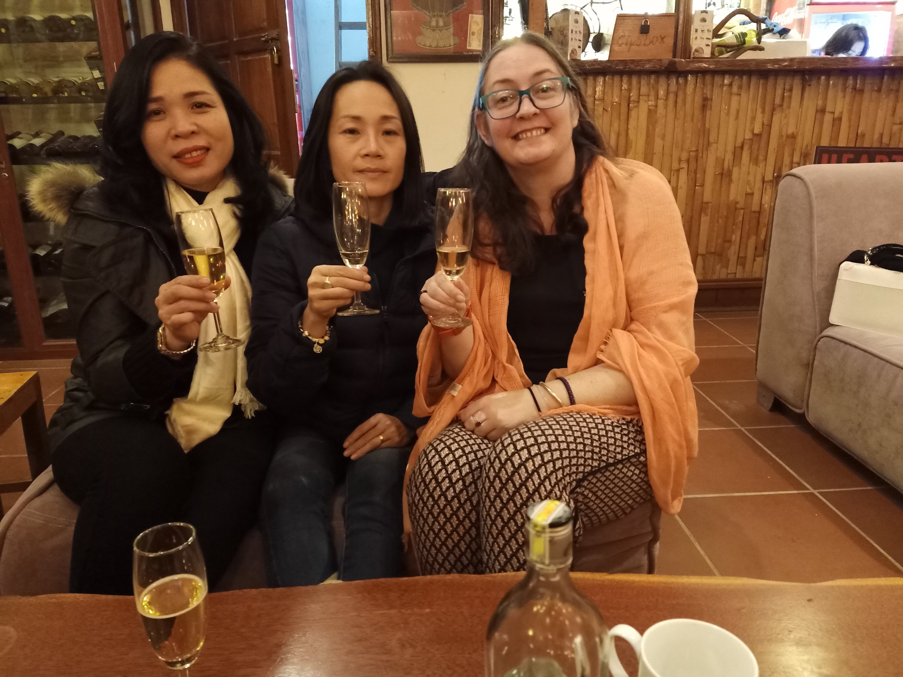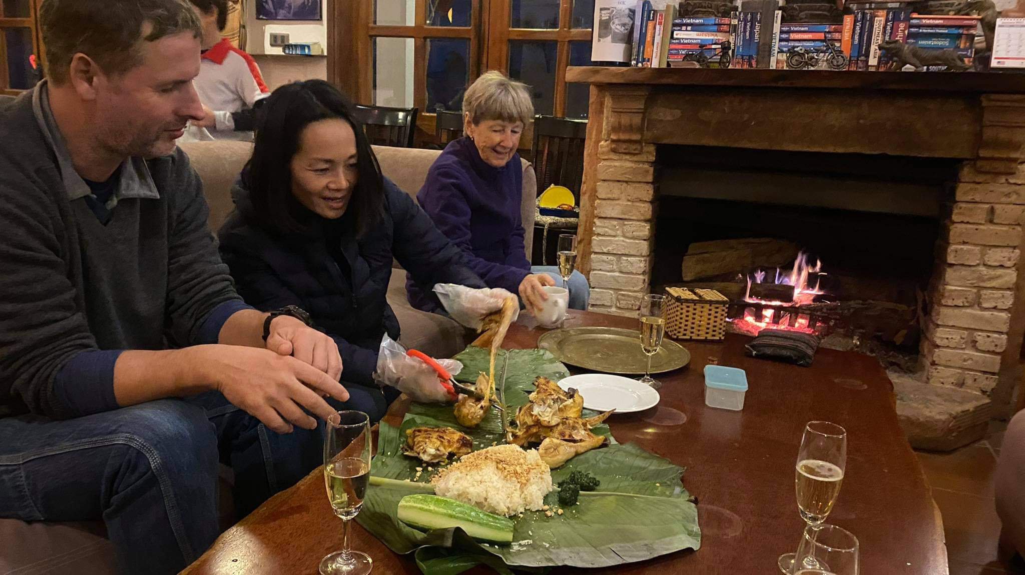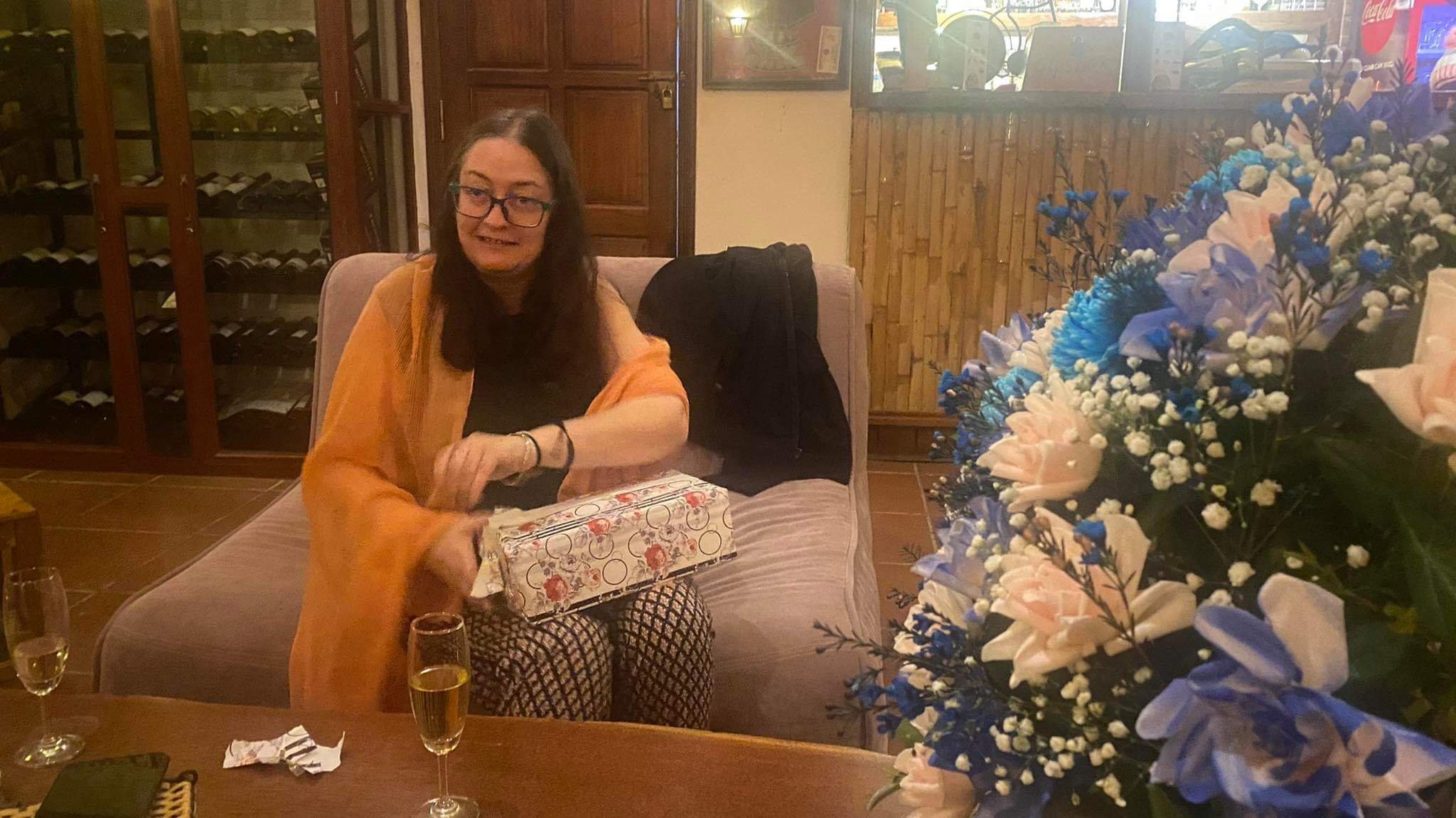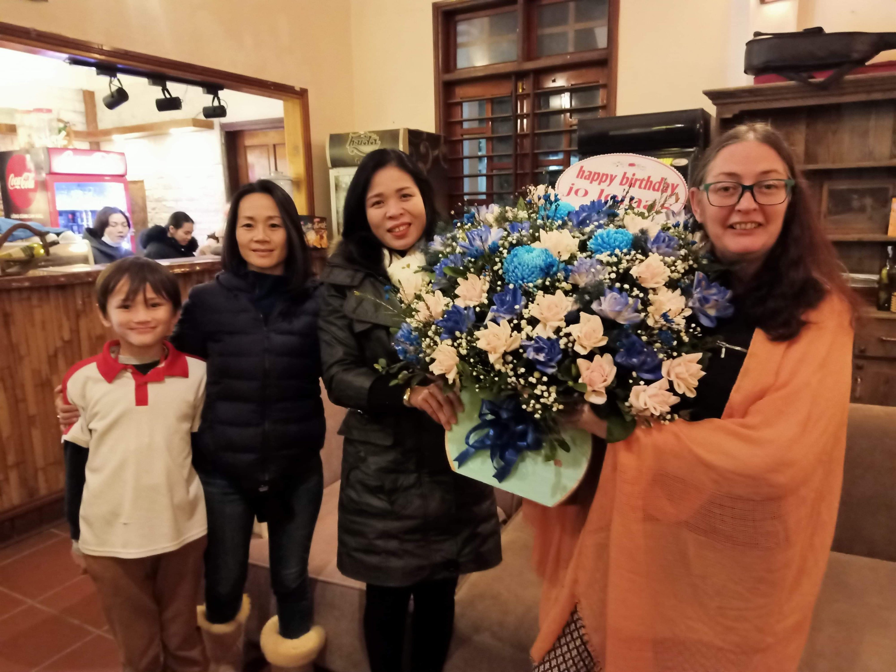 I just had a few walnuts for lunch as we were eating at the Farmstay that night. Captain Caveman was on his way home and I told him we would go straight out but I wasn’t expecting Co and Duyet to turn up with a cooked chicken from East Hill for me as a birthday present, how nice is that!? We decided to take it to the Phong Nha Farmstay where most of the usual gang was and Bich got out the plastic gloves and scissors to dish it out. We enjoyed the chicken and sticky rice and washed it down with a bit of birthday present booze, which was very enjoyable. A few of us ordered the chicken quesadillas too and then Hien and Khanh (owners of Elements Collection) arrived with the biggest bunch of flowers I have ever had and a wrapped present and a card. The surprise birthday cake came, made by the Farmstay kitchen and a rendition of Happy Birthday was sung. It was really nice and I was a bit tipsy when I got home but we had a drop of rum as a nightcap and I caught up on as many messages as I could before falling fast asleep.