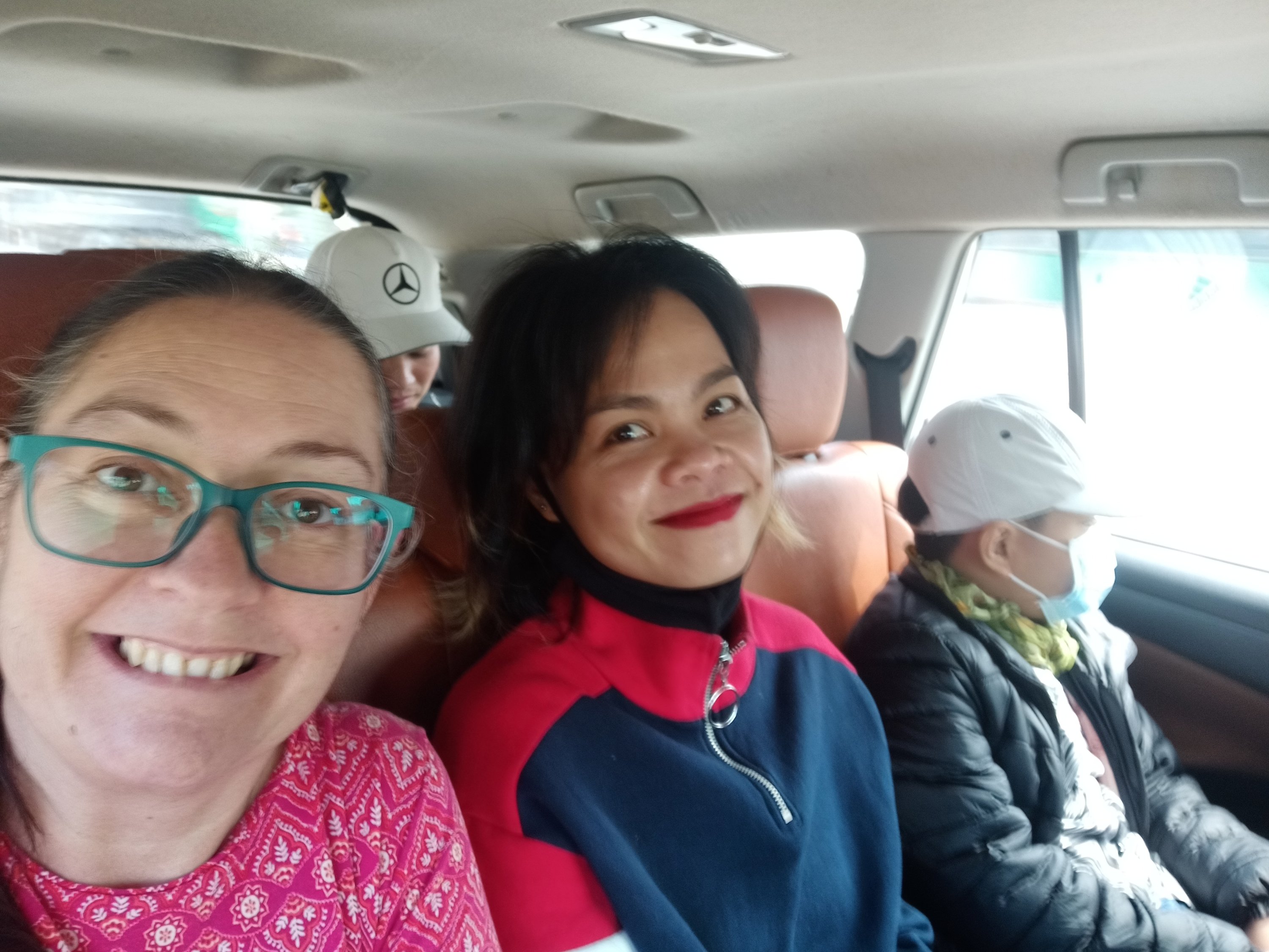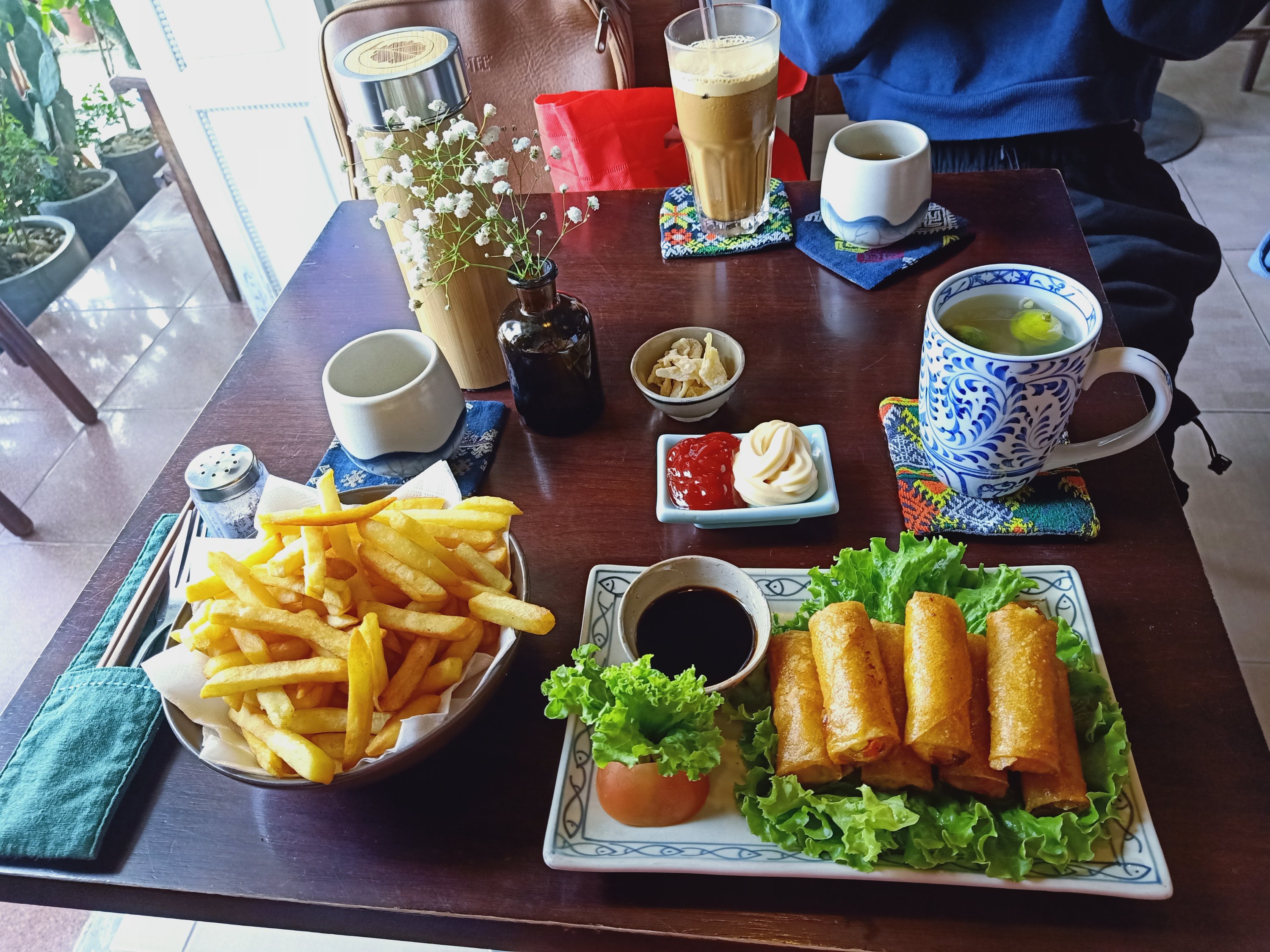 I messaged Tatas to find out what time she was going to Dong Hoi so I could go with her and I would have lunch before my flight. I chose the 15.40 flight so that I could be sure I had my passport in time. An’s Grab car picked me up at 11.10am and was already full, including Tatas who had also woken up, hungover. We got to Tree Hugger and I ordered (too much) food and drink – french fries and veggie spring rolls.