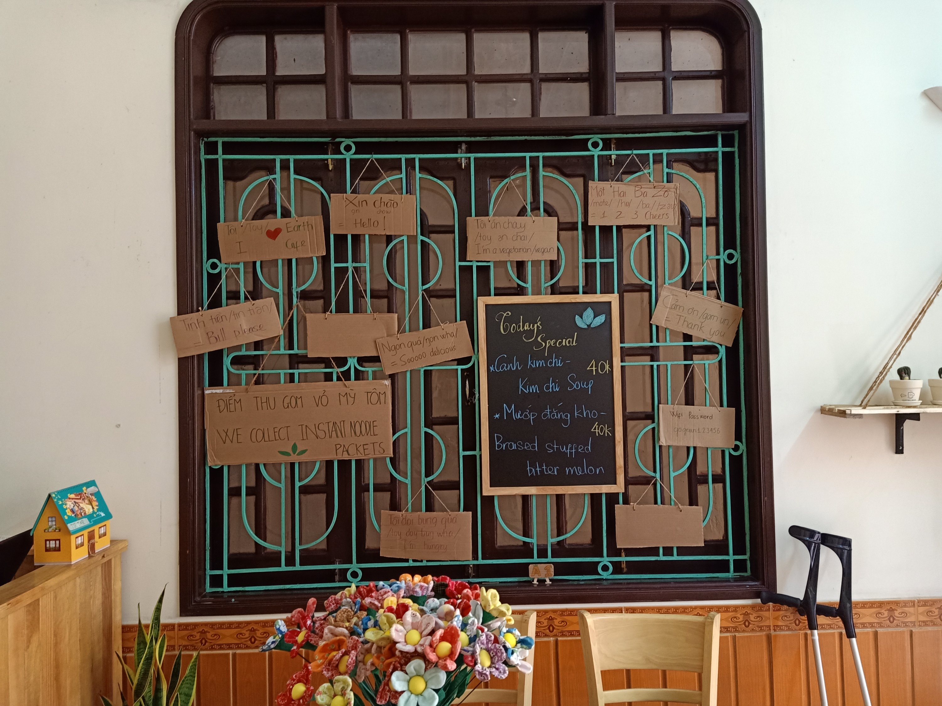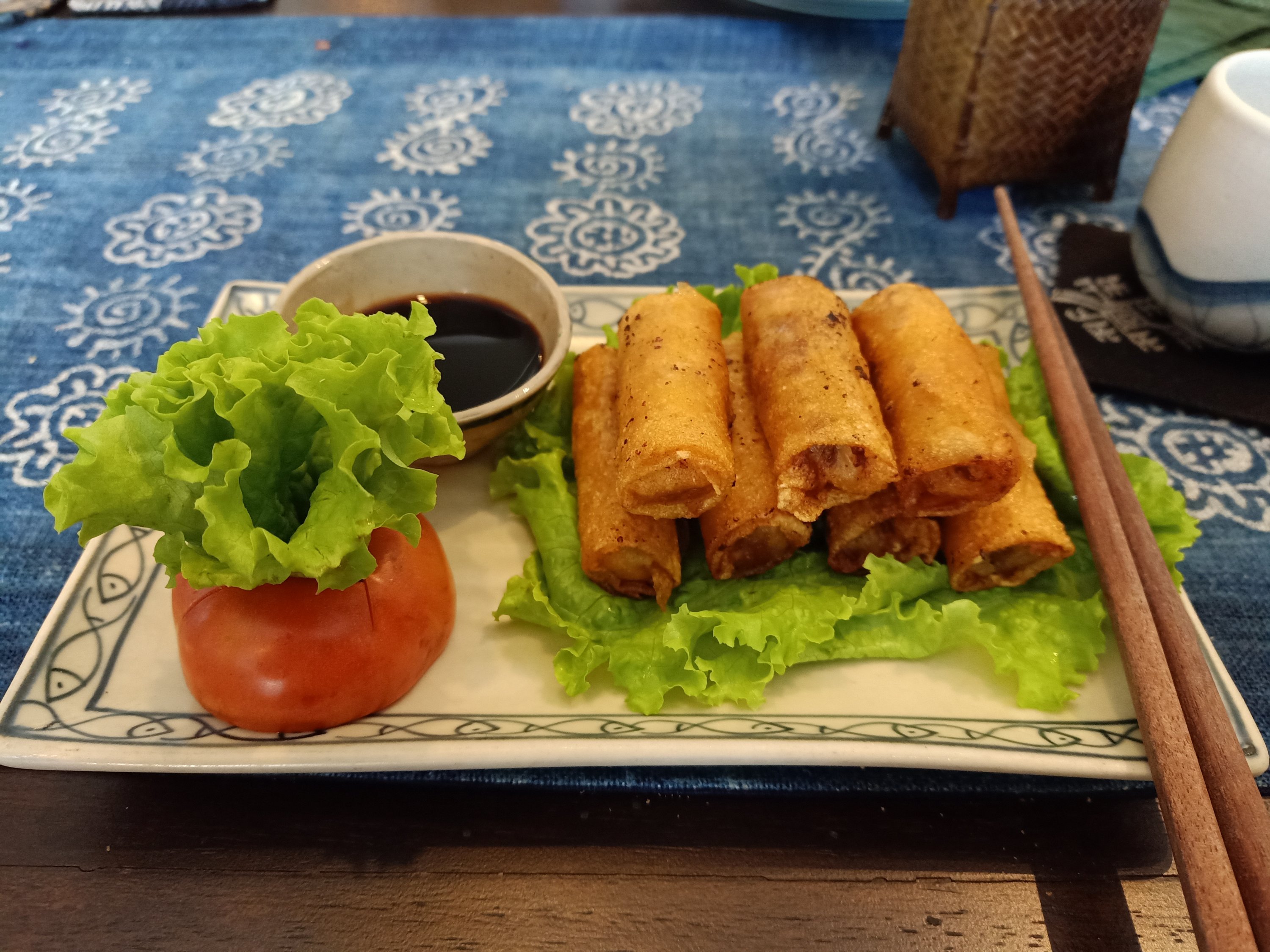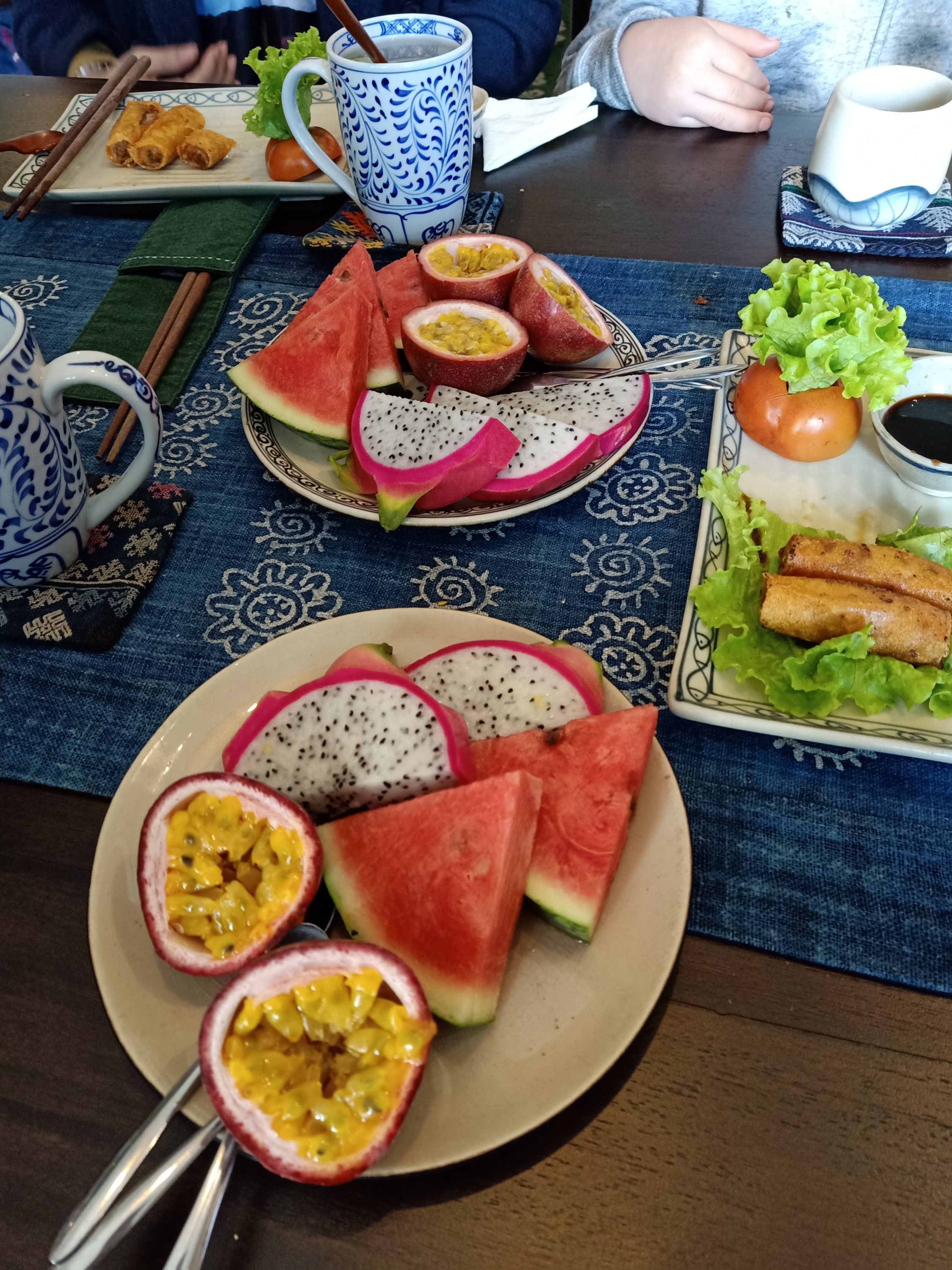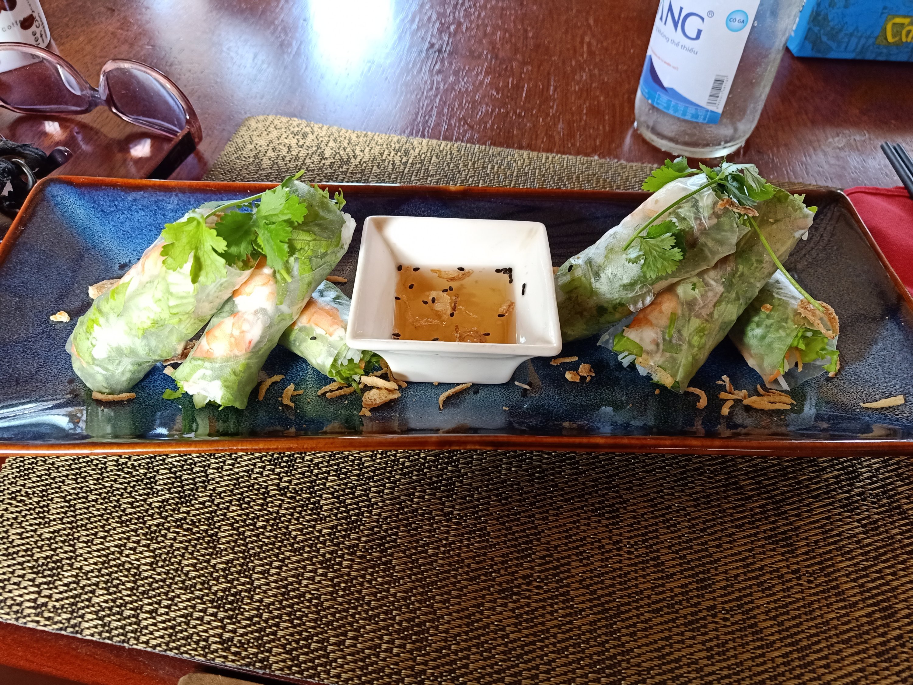 I messaged Tatas to find out what time she was going to Dong Hoi so I could go with her and I would have lunch before my flight. I chose the 15.40 flight so that I could be sure I had my passport in time. An’s Grab car picked me up at 11.10am and was already full, including Tatas who had also woken up, hungover. We got to Tree Hugger and I ordered (too much) food and drink – french fries and veggie spring rolls.