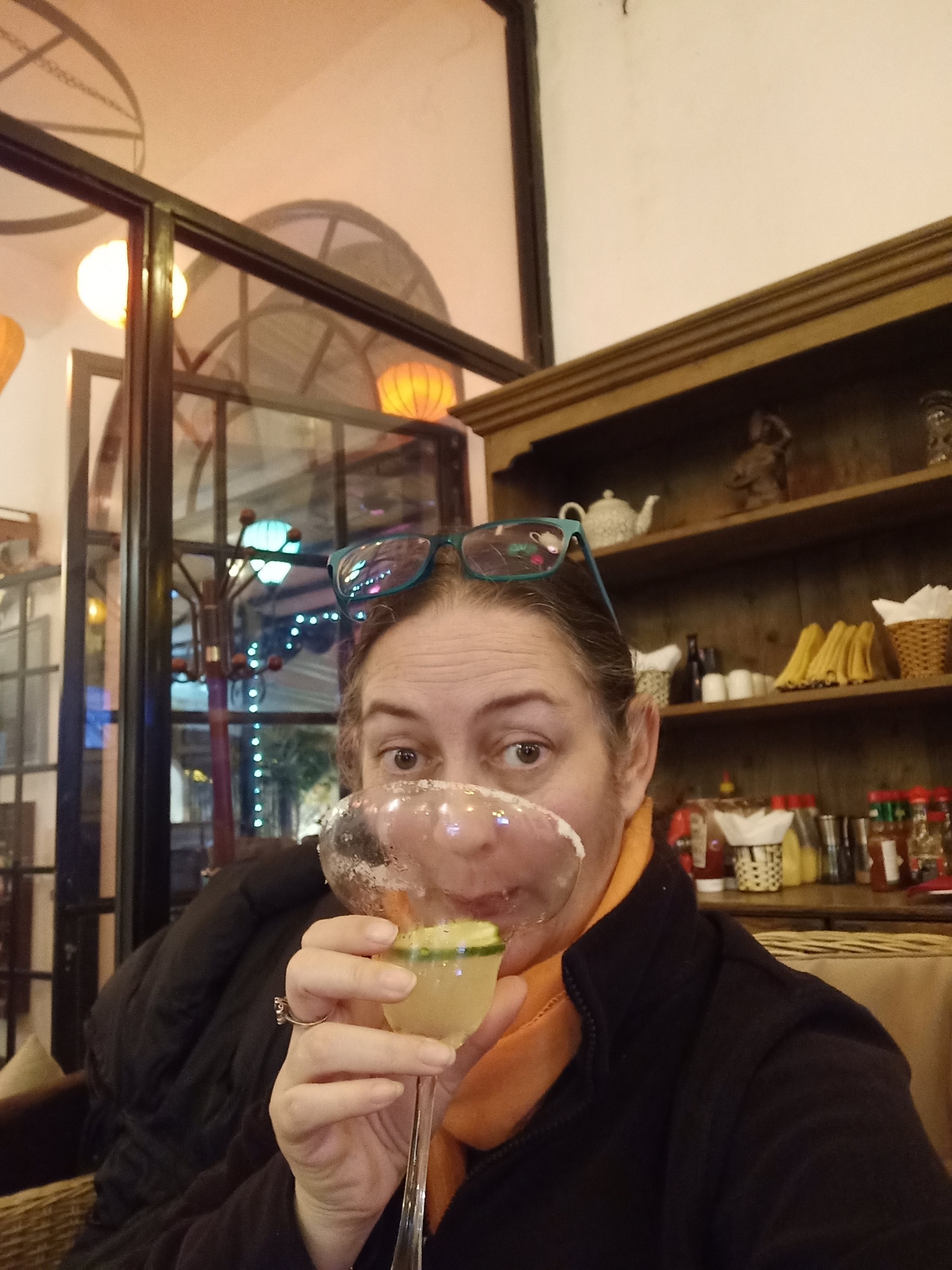I was hoping for some extra sleep on the morning of Thursday 14th January but the housekeeping staff knocked to come in and clean our room, it was a lovely sunny day. I went in to the kitchen to watch more Night Stalker on Netflix and was glad I had not had jam on my toast! I also finished off the rest of the breakfasty potatoes which were still in the fridge. Tatas had arranged to meet me that evening for more birthday celebrations and so I had a light lunch of dates and crackers. I booked Phuong’s Transfers for my jaunt in to town and back and got to The Villas at the exact same time as Tatas. We got on the Happy Hour and a Half margaritas and stayed on them all night – we both love a margarita and they make really good ones. For my meal I decided to go for a dish I’d never tried before, one of Tatas’ favourites, salami and prawn spaghetti. She had it without parmesan or spring onion but extra chillies and I had it without chillies and it turned out to be one of the nicest meals I have had. I really enjoyed it and it is now on the list of (neverending) favourites. We had a good catch up after her trip to see her family before the holidays and we even got to chat with Manu, the manager, and Ha, one of our favourite waitresses in town. The evening was lovely and it went so fast, too soon my chariot home awaited, Tatas and I topped the night off with a Jameson’s and it was such a lovely birthday treat with probably a small hangover due tomorrow.