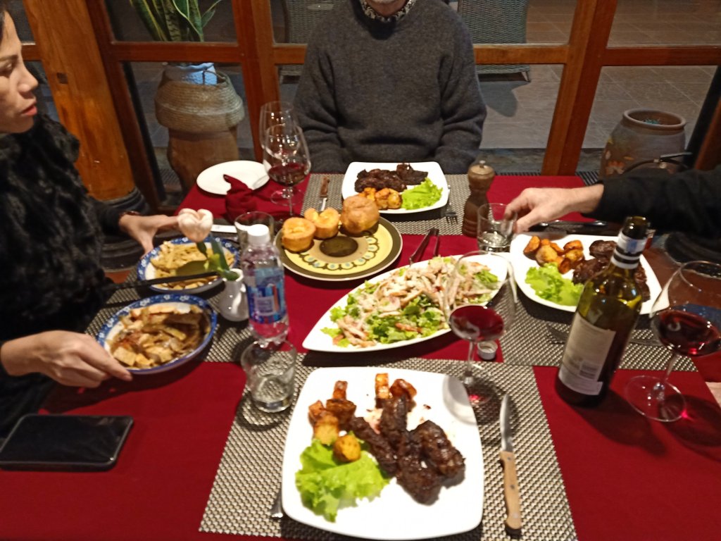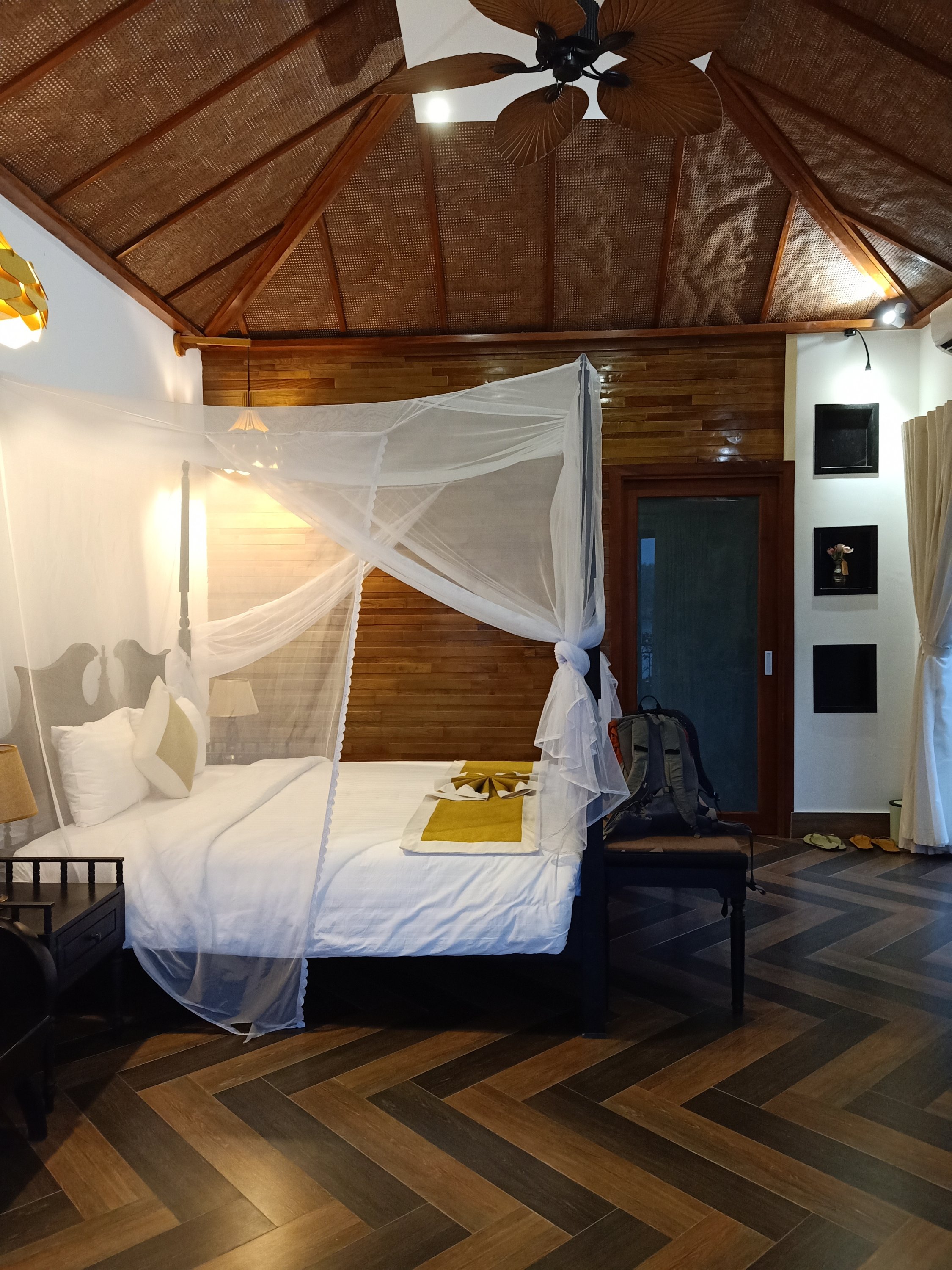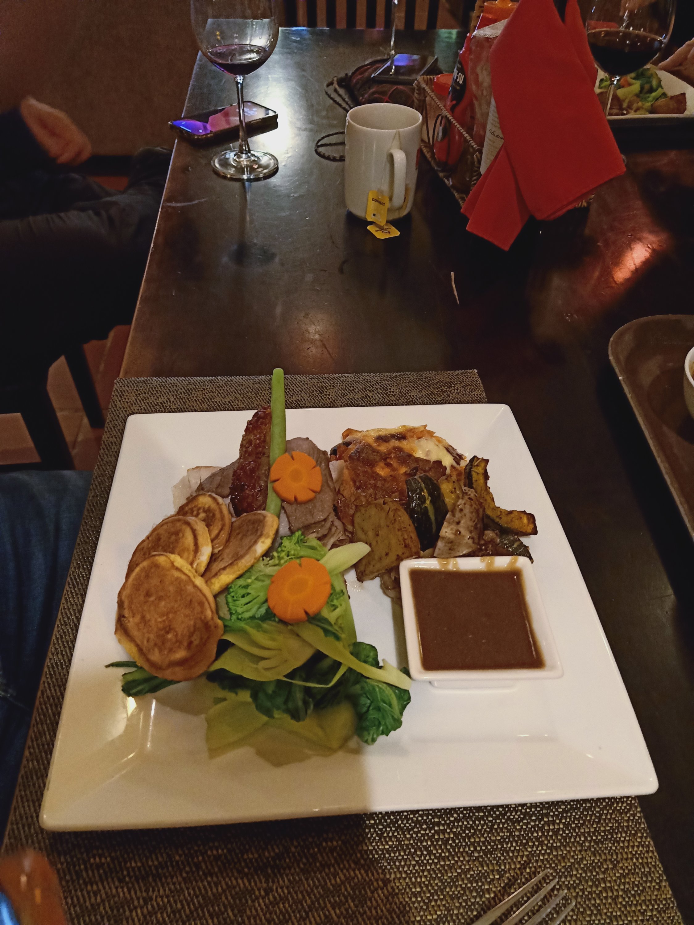 We met Tony first for red wine and a catch up, I’d not seen him since he had managed to get back from Australia and it was good to hear about his 14 day quarantine experience in Hanoi – it seems he had enjoyed his better than some had experienced! Tham came to join us at the table, bringing us a starter of pumpkin soup and a massive plate of the most amazing looking Yorkshire puddings I had seen in a few years! I felt a bit overwhelmed and I couldn’t be polite in reaching out for one straight away – they tasted just as good as they looked. I can honestly say they were as good as my nan used to make and better than my mom’s (sorry, ma). I ate a small one and a big one and I was amazed that a young Vietnamese man had made these incredible Yorkshire puddings. The wine was great and going down well and we were then brought, what I thought was a sharing plate of, ribs and roasted vegetables. We were to be given a plate each and the portion was so massive that I couldn’t finish mine. Tham had a vegetarian meal while we shoved sticky ribs in our faces, drank more wine and had to leave the chicken side salad as we were far too full. It was such a lovely night with amazing food, too much wine and fantastic company. Tham had an early morning the next day and Captain Caveman was keen to see the sunrise from our villa terrace so we said goodnight. Tony, the legend, insisted we take another bottle of wine to drink in the room, of which I managed half a glass before falling fast asleep in the comfy bed.