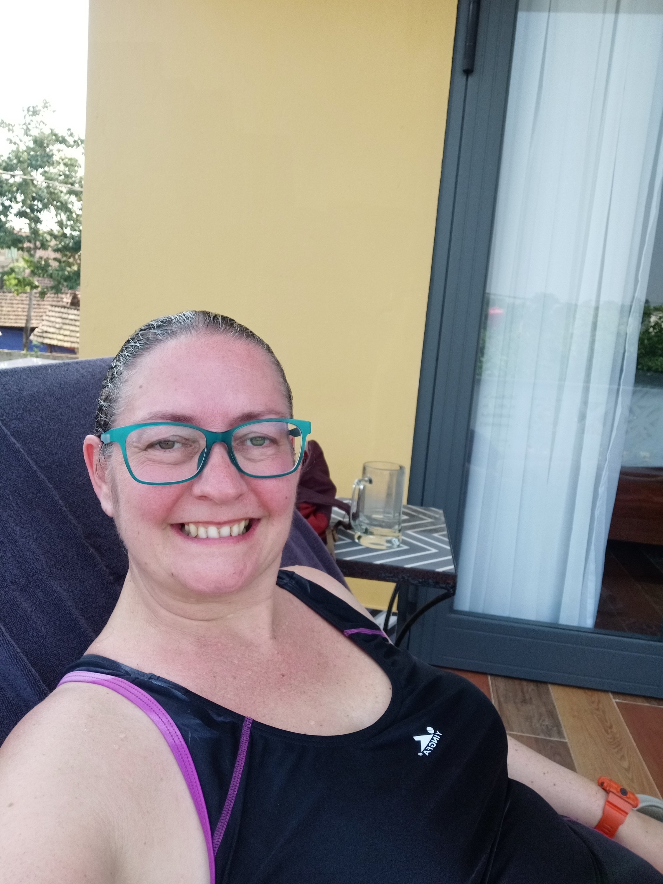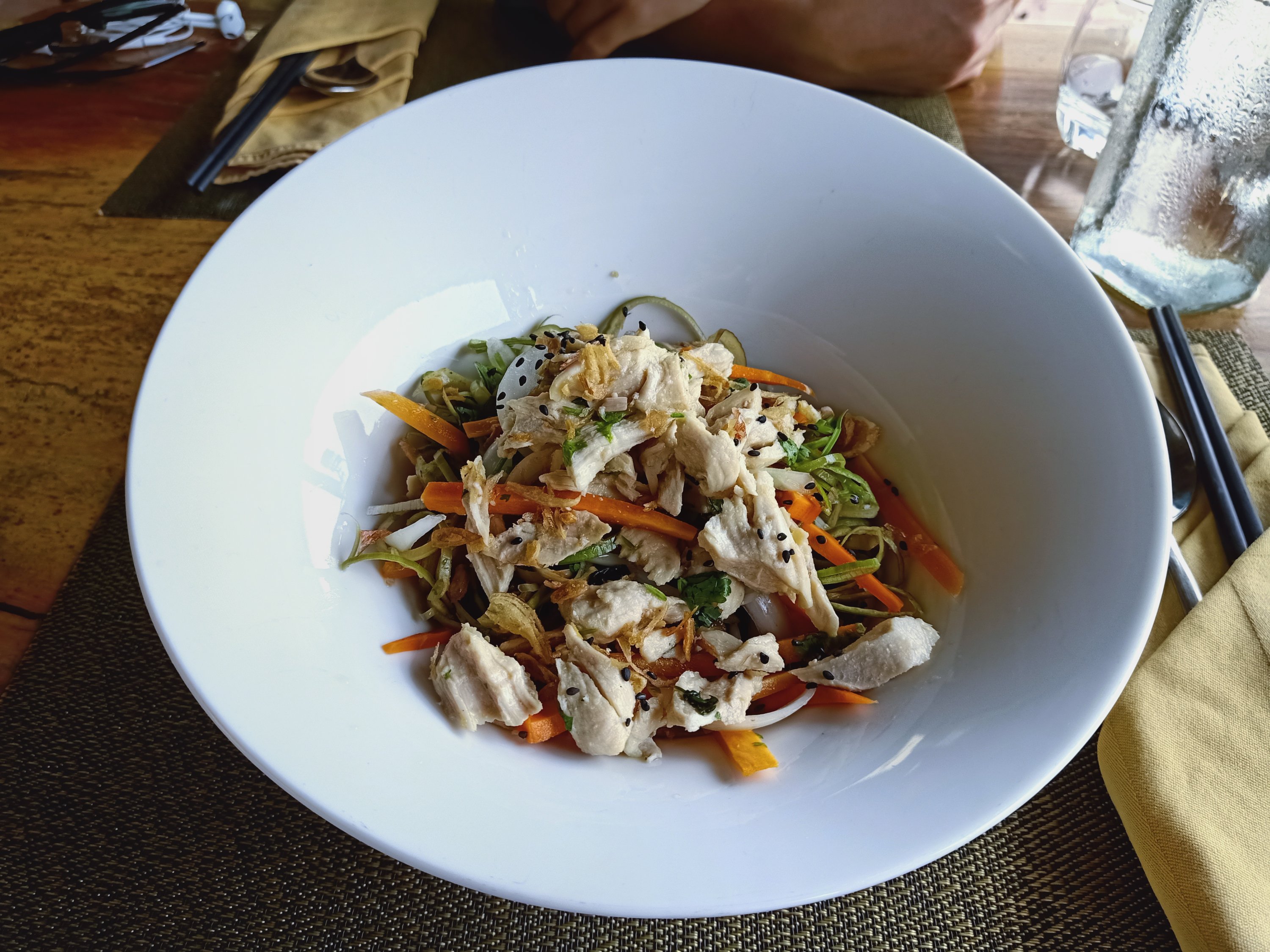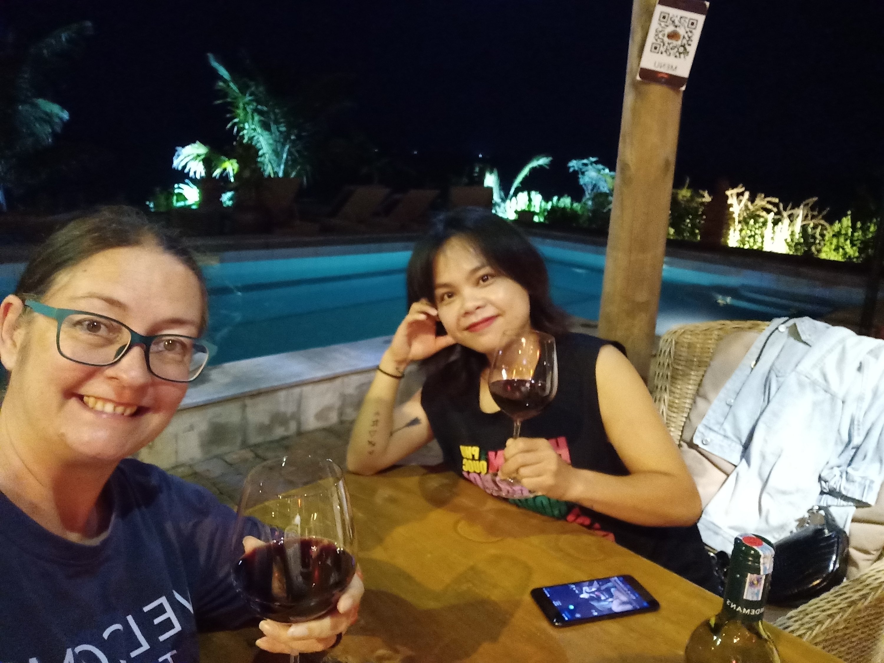 For those who remember Keith, from Grimsby, he messaged to say he was back in Dong Hoi and would be coming to Phong Nha tomorrow. This settled the going to The Villas by bicycle conundrum as we could go tomorrow to meet Keith and so we had lunch at The Phong Nha Farmstay instead. Already having a dodgy stomach (for no particular reason) I chose a chicken salad without the cucumber which was really tasty but I was ill straight after and had to cycle home. It took me 9 minutes 40 seconds which was very slow but I felt quite unwell while riding Bluey back home. Veronika was already in the pool and after I felt a bit more stable I got my swimmers on and went to sit on the balcony. I noticed the pool had quite a lot of feathers and twigs in it from some sparrows who were building a nest in the eaves. While Veronika had to pop back up to the Farmstay for babysitting duties, I spent half an hour by the pool until it was time to get ready as Tatas was on her way over. She was going to stay at ours tonight and so had brought her overnight bag to drop off, then we got a lift with Duyet to the Farmstay.