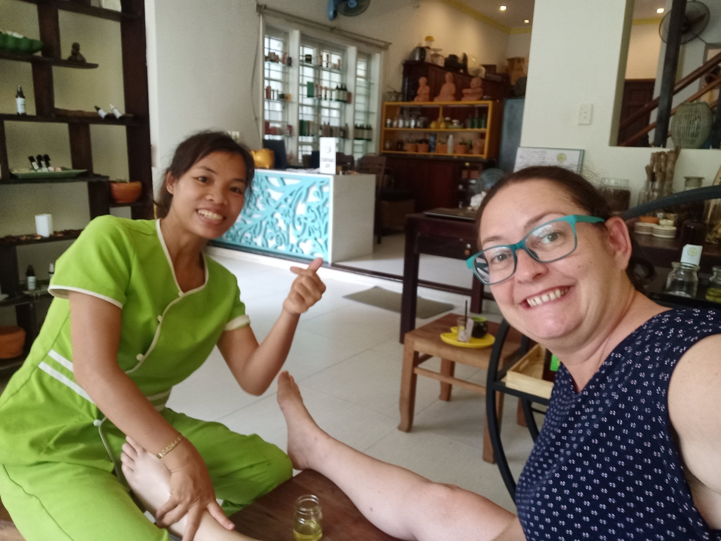My taxi driver dropped me outside Citrus Spa in Hoi An where I had booked in for some waxing. I’d been to this salon before and knew they were good so had booked in for the works! I also fancied a bit of reflexology which I hoped to fit in at the end. I’d arranged to meet Caroline, who had kindly invited me to stay at her place in An Bang, Hoi An. When I came downstairs from having my waxing done, this time no need to bum shuffle, she was already in having a full body massage, which meant I had time for my foot massage. It was fantastic and I felt so relaxed after it that I could have had a snooze but there was not enough time. Caroline and I had a hug and paid our bills, I was surprised to get a big discount and paid less than 800,000vnd (£25) for everything.