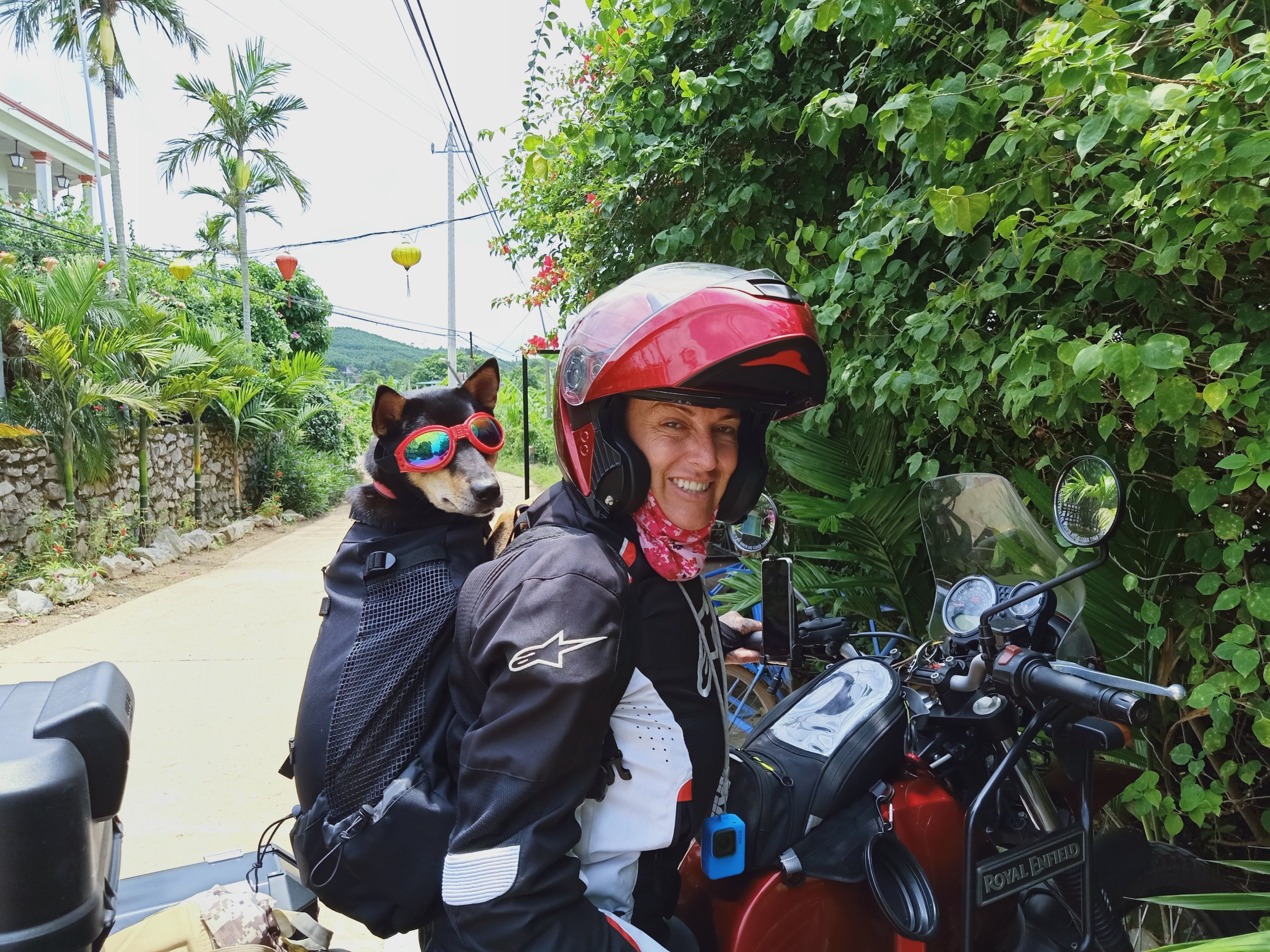 Tatas was on the train back from Hanoi by 6am and was hoping to meet me at the Farmstay later, all being well. I had been sworn to secrecy about Caroline being in Dong Hoi as she was on her way to Phong Nha to surprise people and she had booked to stay for 1 night at the Phong Nha Farmstay. I’d said nothing and agreed to meet for lunch, so I got there early (cycled the short route) and was the only person by the pool aside from a rather warm Ben, who was moving furniture. When Poison_I_Vee (Caroline and the dog on the Himalayan) arrived I managed to get a video and watched her unpack the dog from her special doggy back pack – they looked hot!