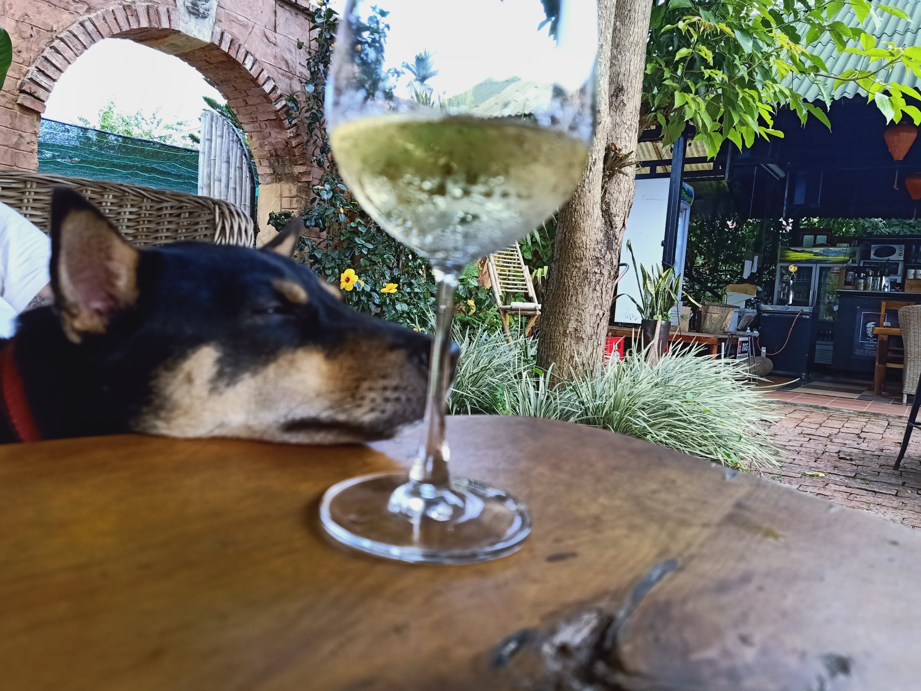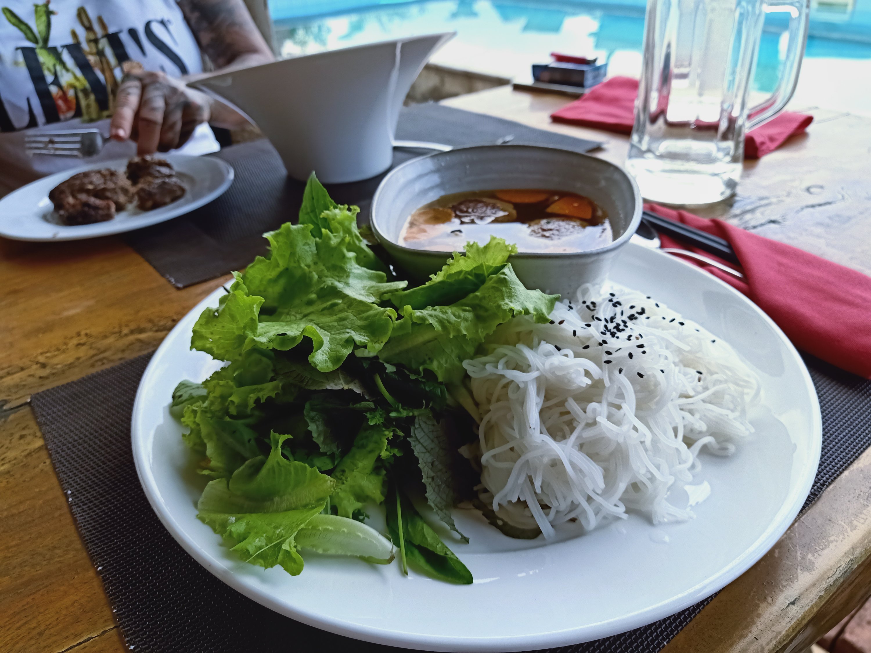 We decided to have lunch by the pool and I ordered the bun cha, Caroline ordered a salad and just a beef patty for her canine companion and we had a glass of white wine each. Veronika joined us for lunch then a few more people arrived in the afternoon to say hello to Caroline and Vee and I decided to do the sensible thing and cycle back home while I was still sober and have a shower and change for dinner later.