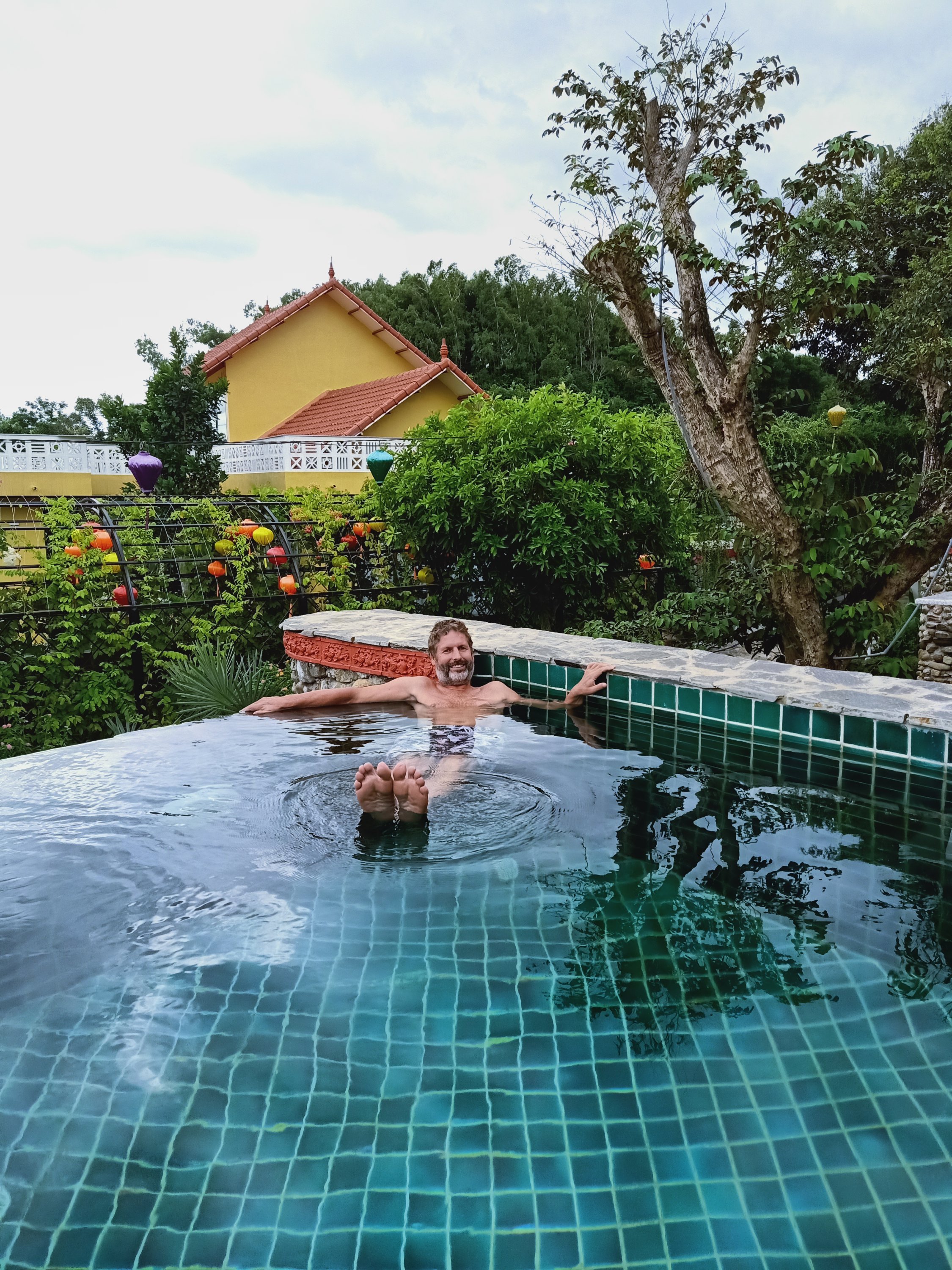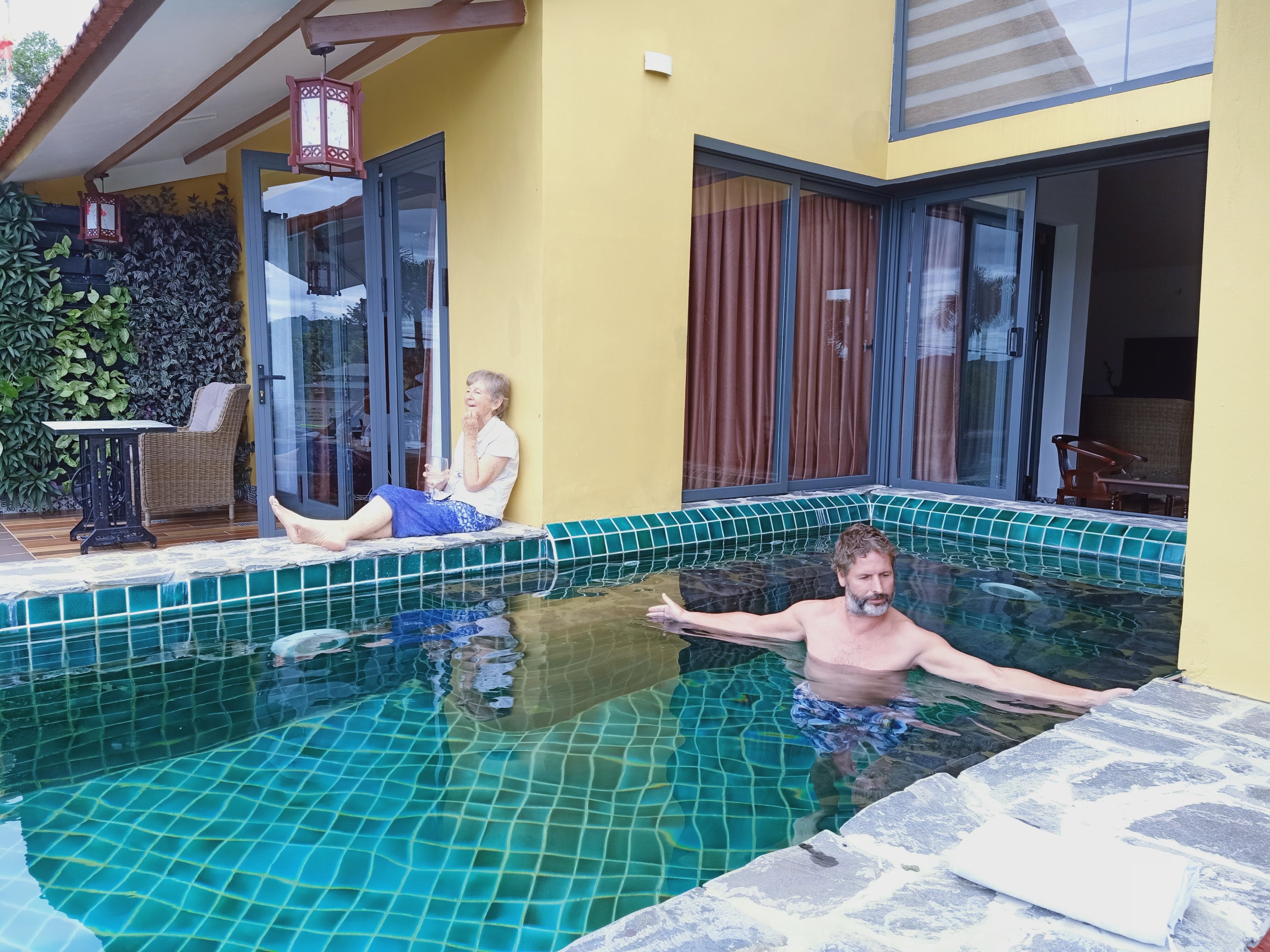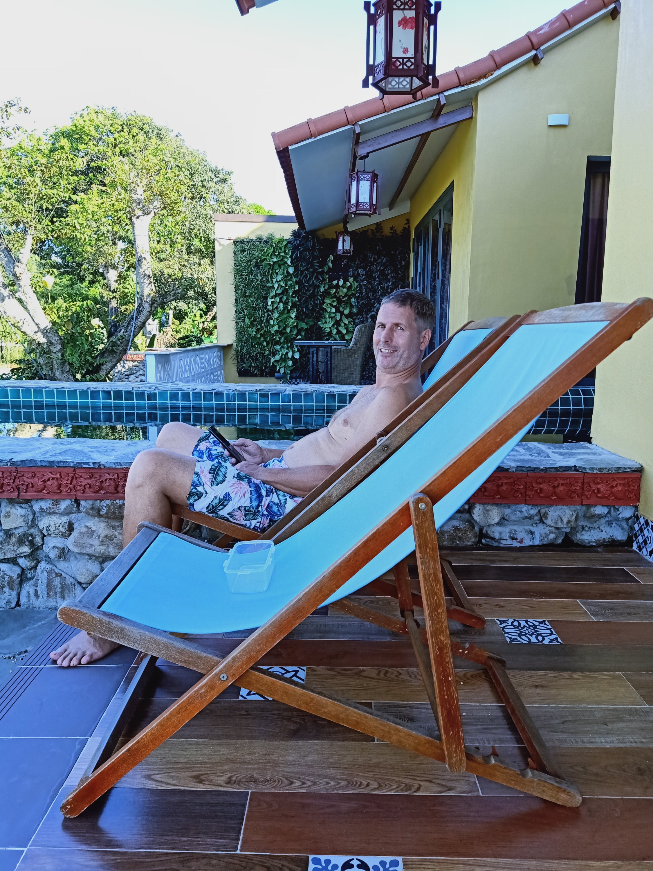 Captain Caveman’s approach was to pretend he’d not said anything and act as normal but it was too late, he’d said it now. After he’d got back from his cycle to Phong Nha and an Eggs Benedict pizza for breakfast at The Villas, he went in the pool for the rest of the day. I stayed in the AC, the room temperature was at 30°C as the Aircon struggled to cope with the sun on our side of the villa, outdoors it was a ‘feels like’ 43°C. For lunch I had the other half of the dragon fruit and a small carton of almond milk and then had a bad stomach (for no reason). I felt tired so I had a sleep then watched the second episode of Hinterland – I was quite enjoying seeing the Welsh scenery and wet, cold weather.