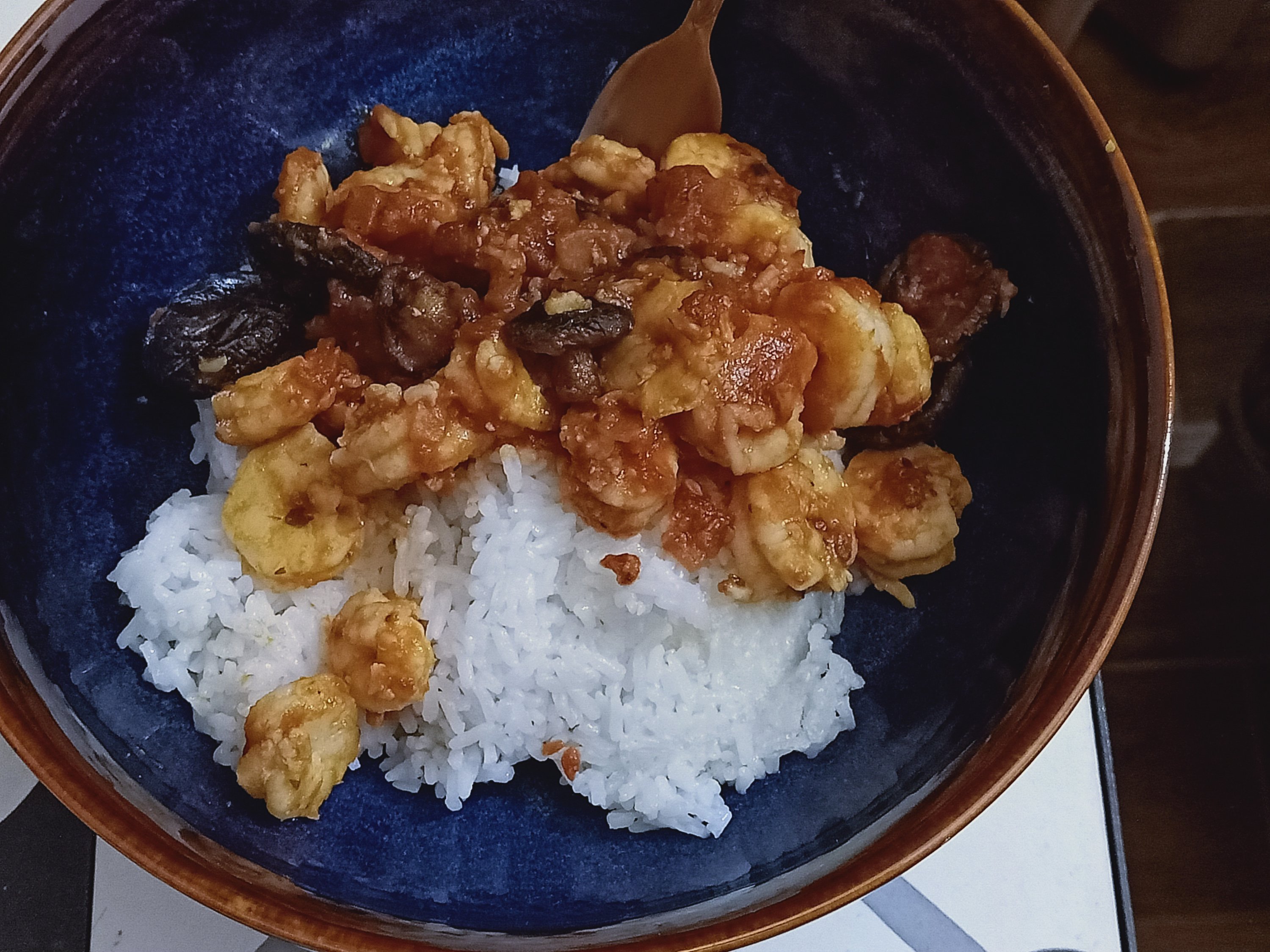 Captain Caveman and I had decided that I wouldn’t come to tonight’s pizza night at The Villas because I would find it too difficult to resist the pizza (I was still trying to not have any cheese) so I was going to get an East Hill delivery instead. Unfortunately Captain Caveman had forgotten to leave me any money so that plan was thwarted. While Captain Caveman went straight for the all you can eat pizza night I made prawns and steamed rice with a tomato based sauce. It was very nice and would have gone well with a glass of wine but we didn’t have any. I lucked out for dessert when I tried walnut milk rice pudding for the first time, only to find it tastes pretty terrible, even a spoonful of jam couldn’t save it!