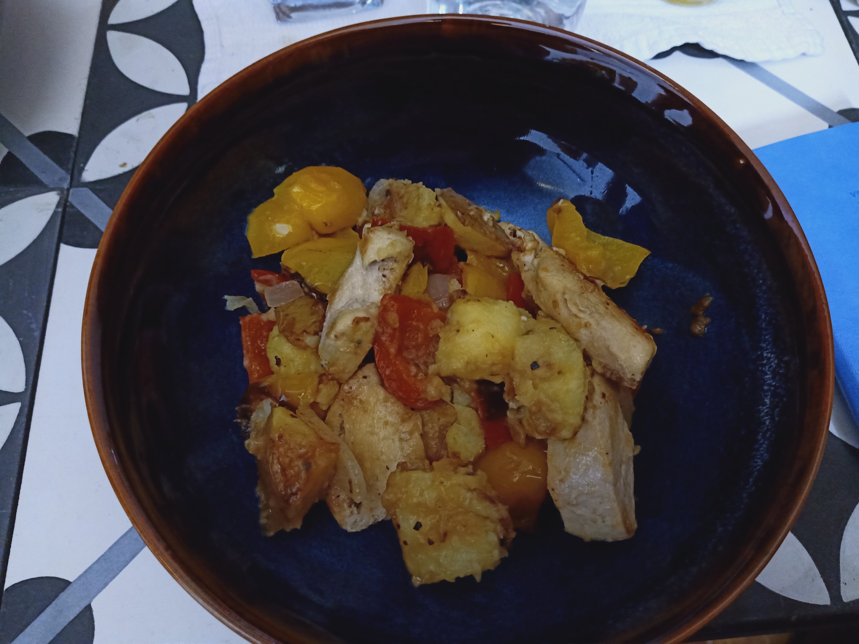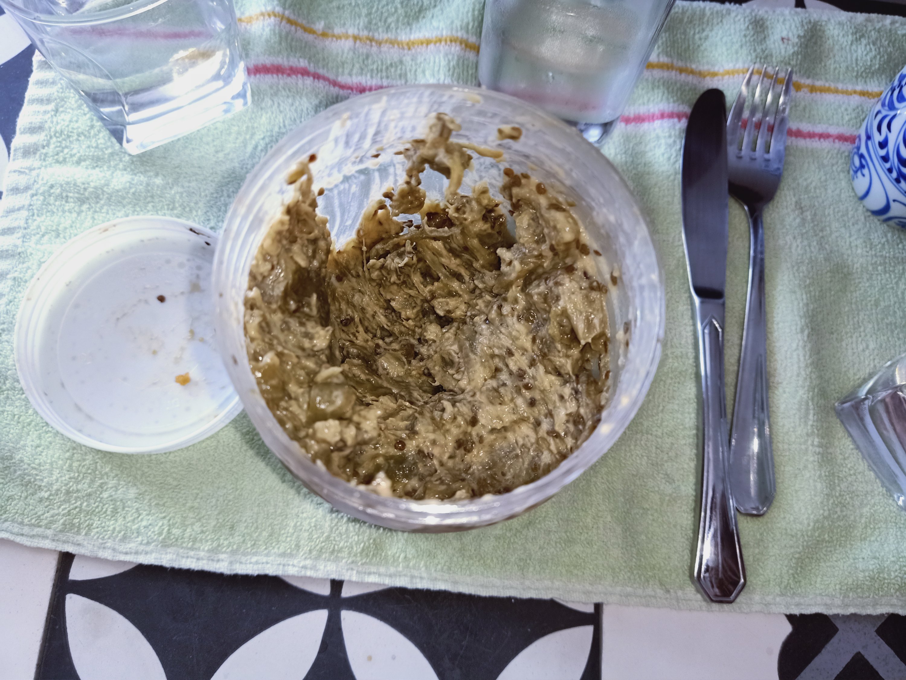 Captain Caveman had a crisp sandwich and beer for lunch I had crisps with a small piece of bread, no butter, and a Strongbow by the pool. I roasted 6 aubergines and what felt like hundreds of cloves of garlic until I was a hot, purple, sweaty mess, in the heat of the kitchen. Captain Caveman made Baba Ganoush with the cooked aubergines once I had shoved it all in a jar with the peeled garlic (I can see why people buy the Lazy Garlic jars)! He made a lovely dinner of chicken, potatoes, onions and peppers with BBQ sauce which (again) would have gone well with a nice glass of wine. Wine is expensive here so I was trying my best to go without but a life without cheese and wine is not a good one and I missed it, a lot!