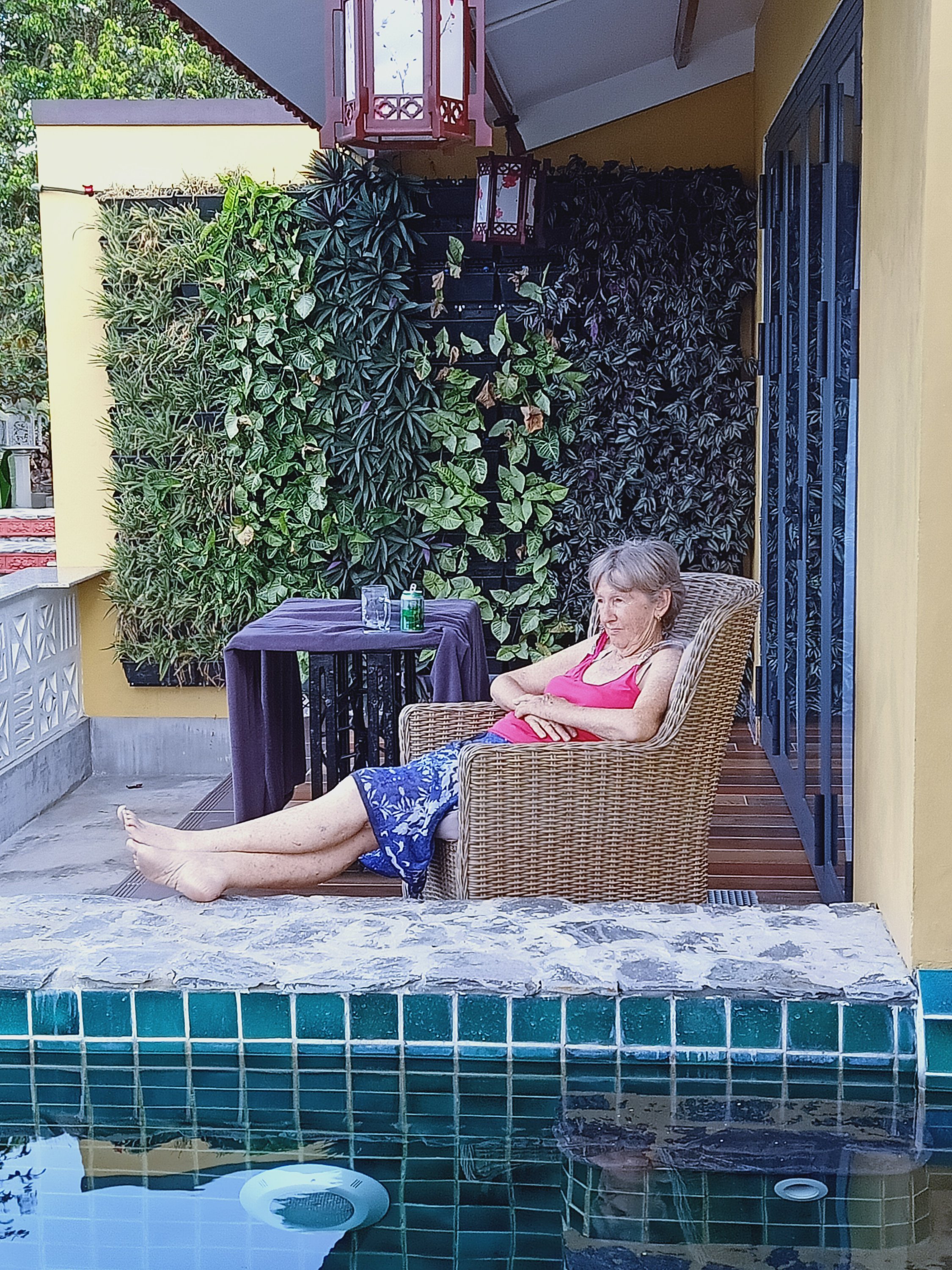 Back home I had a fruity lunch of 1 banana, 2 mangosteen and half a dragon fruit with some walnuts before getting in the much cooler pool for a dip. The housekeeping staff came to clean the room while I sipped gin and pink grapefruit on a sun-lounger feeling rather privileged.