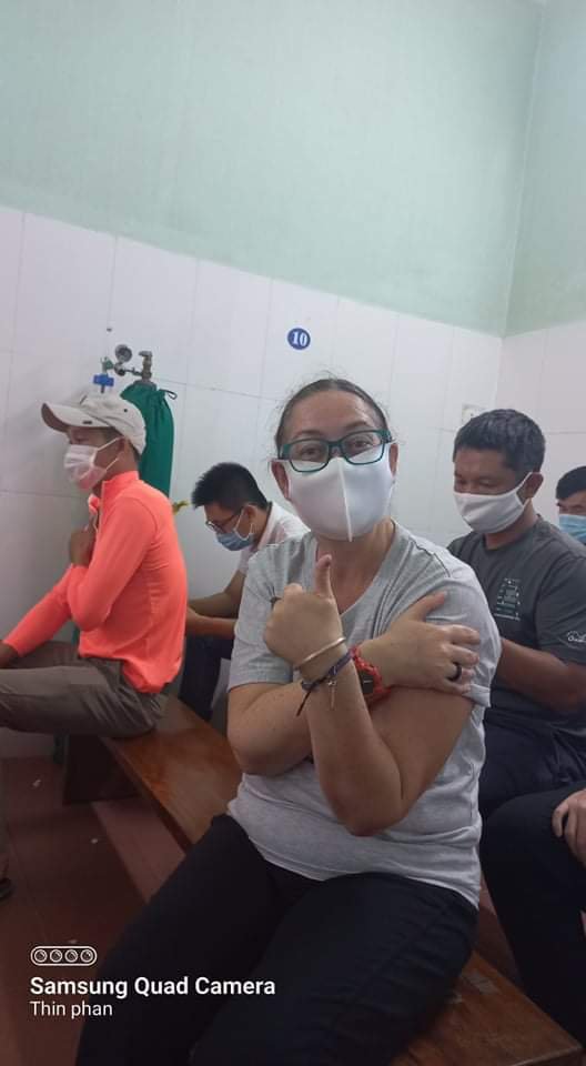 At 8am Captain Caveman tried to call me on Messenger but he forgot that while he was walking away from the office to get on the bus that he was going away from the WiFi and so it wouldn’t connect. I got my stuff together and tried to set off but then he rang again, it still wouldn’t connect, I tried to call back. When he called me on the normal phone number it was to tell me he had set off and now I was wasting valuable minutes in setting off to meet the Oxalis staff bus. It was hot already and the walk felt hard work, after just over 10 minutes I was nearing the road, I saw the bus approaching and flagged it down. I was glad of the Aircon and a comfy seat, having only just made it. We went to a hospital in Dong Hoi, but not the main Kuba hospital and we had to get a form to complete. This involved a lot of pushing, shoving and fighting over pens which were attached to the kiosk or small table, I wish I’d took my own to make it easier. Captain Caveman completed both of our forms, which I then had to push in to sign and get a read stamp on my arm from the no-nonsense lady at the kiosk. Next we went to the main entrance of the hospital, it was very busy and we had to wait for staff who spoke better English so that they could go in with me. When Thin, the vice director, arrived we went through to the next section which was undercover but outside and I had to fill in more forms which I was helped with. Captain Caveman was told that his name wasn’t down for his second jab so he couldn’t get it and he was disappointed. I gave him my bag, which was a mistake, and went in to what I thought was a small vaccination room. There was about 6 vaccinators at tables then about 30 people sat waiting. I had to be asked some questions about my health and medication, had my heart listened to and my blood pressure taken then moved to the next table where I sat on a small (not very robust) plastic stool. I chose to give my left arm as I knew it might feel painful the next day and I faced the wall, didn’t look and willed myself not to faint.