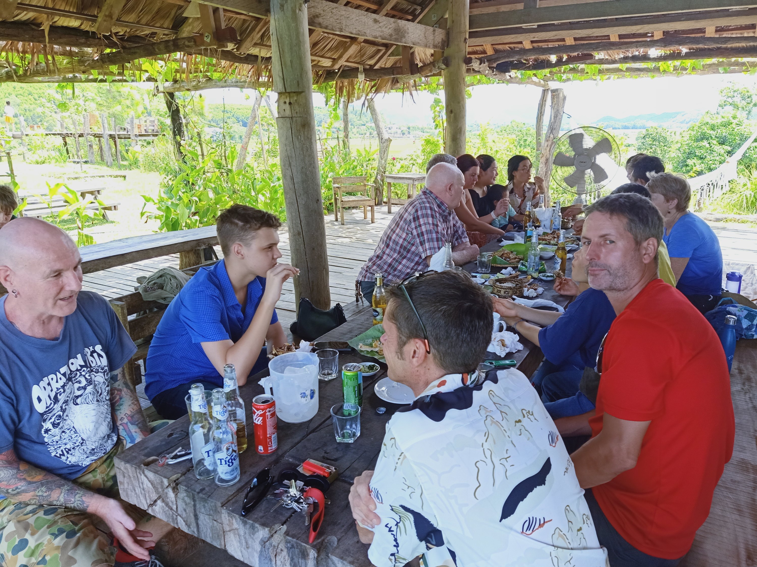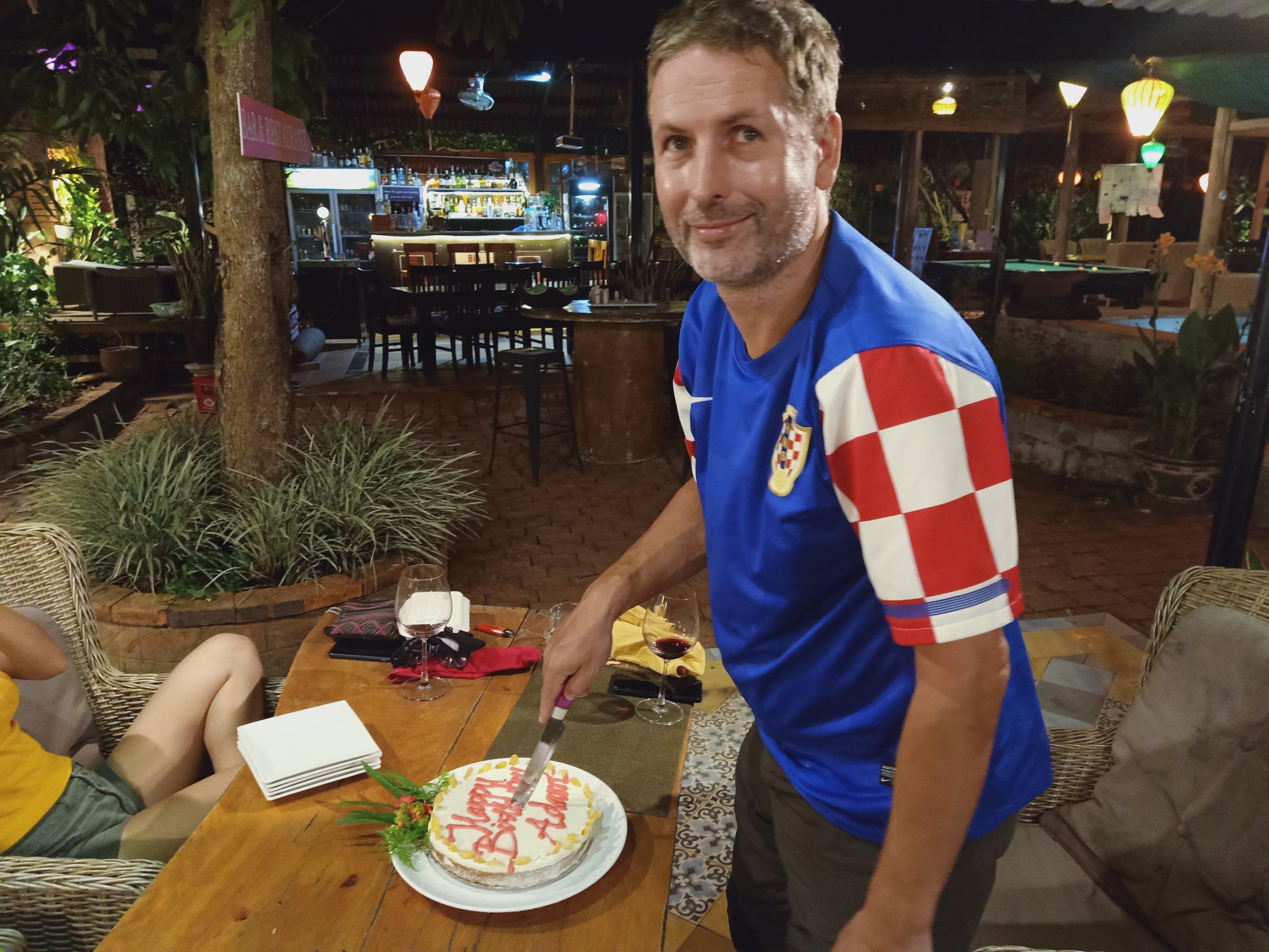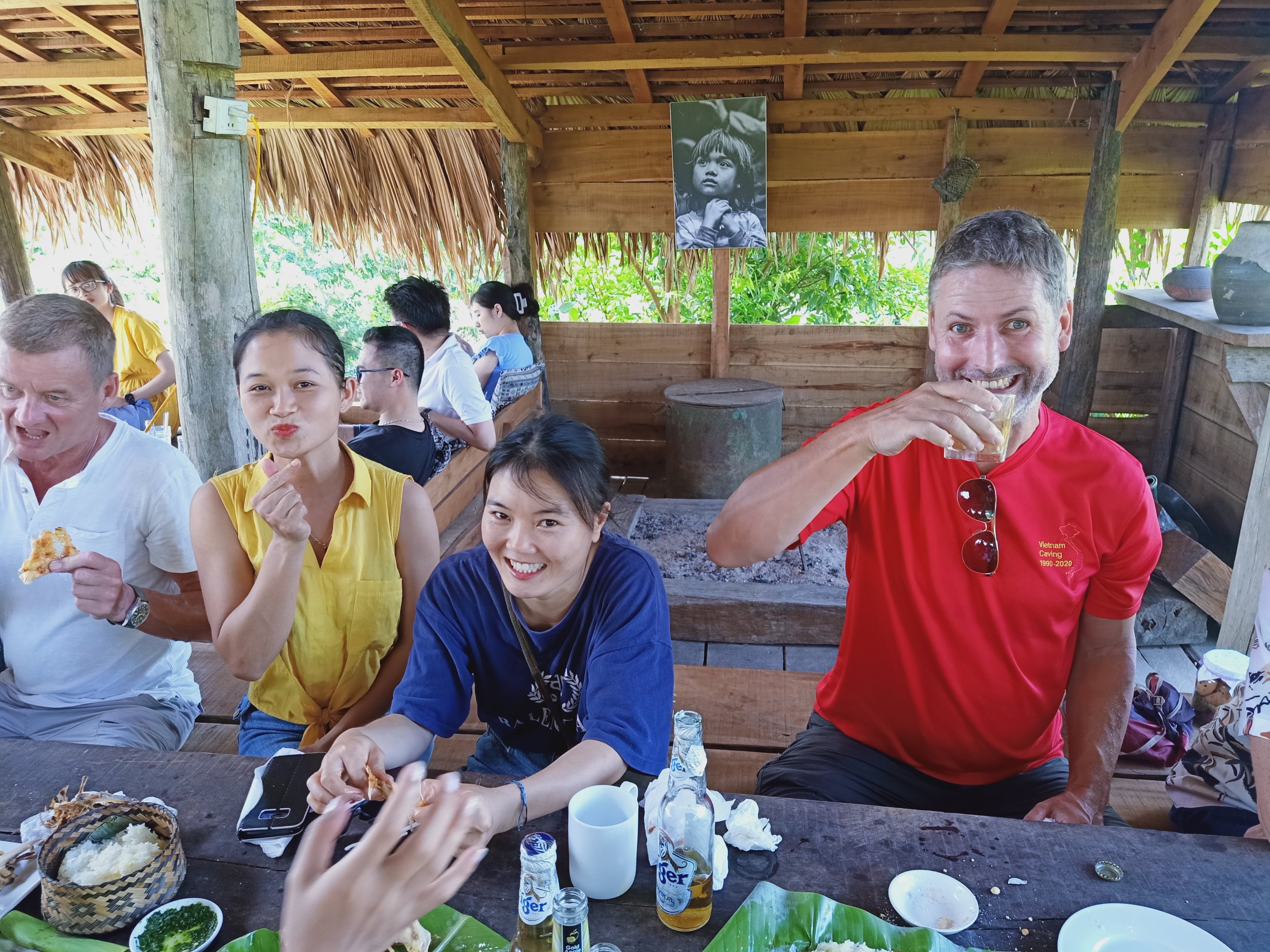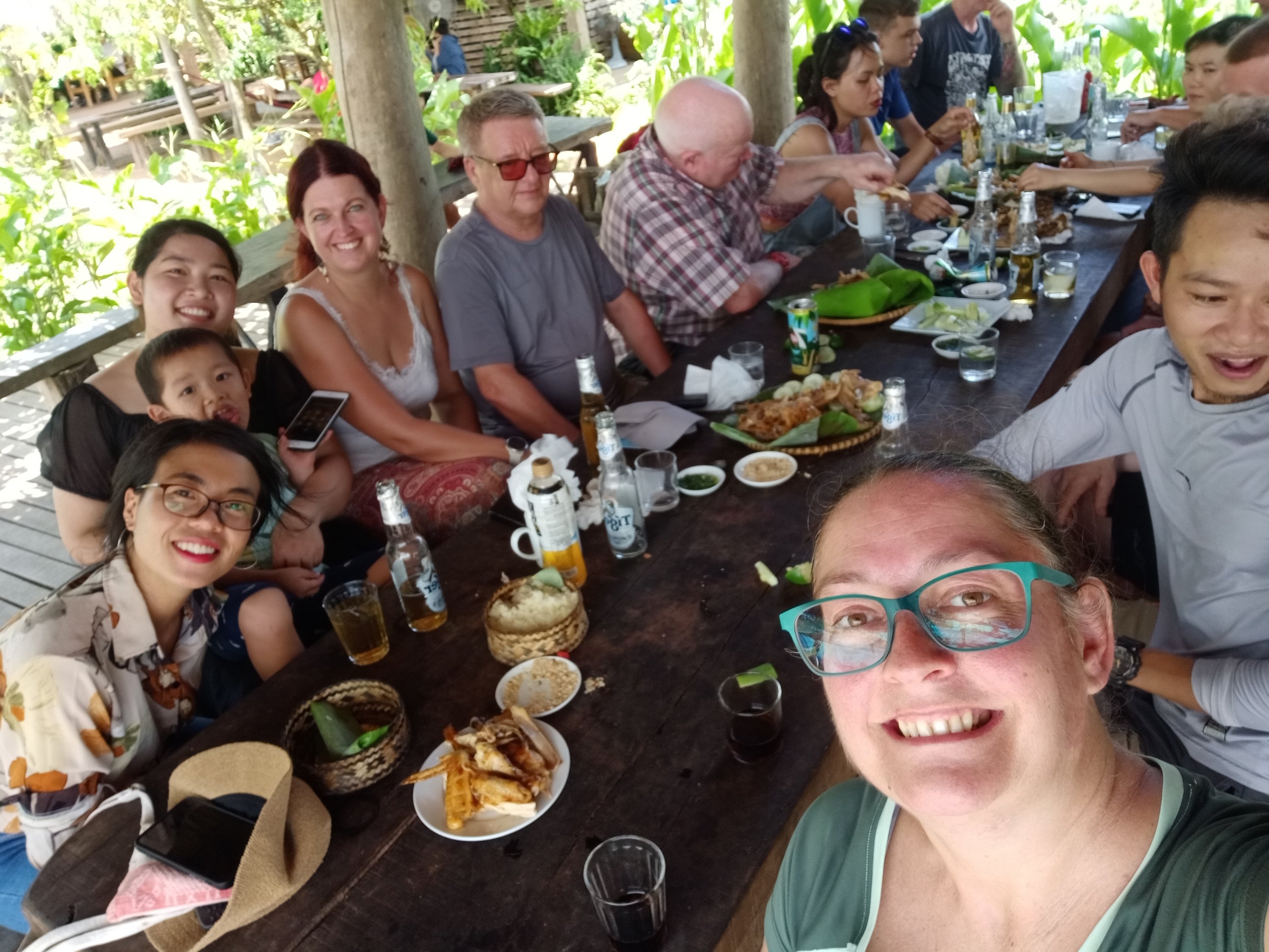We had took a chance to book a table at East Hill for BBQ chicken and beers from 11.30am – it gets busy on Sundays so we usually avoid weekends. Captain Caveman pumped up Bluey’s tyres for me and we cycled it there in about 10 minutes, being overtaken by Stu and Jack on the way. On arrival East Hill had very kindly reserved us a table and even had a sign with my name and the time on. We ordered 2 chicken combos when we arrived, we don’t preorder because often the Vietnamese contingent can arrive late and then the chicken has been snaffled already. Next to arrive were Colin, Watto, Howard and Deb who had impressively cycled it from Phong Nha, then Mark arrived and we all ordered cold drinks and waited for others to arrive. The Funny Monkey’s team arrived and brought Captain Caveman a gift of homemade cookies which was so lovely. BBQ chicken arrived, the cavers ordered 2 more and we all started on the first lot of food. Mr Nguyen was last to arrive, looking very smart and carrying 24 cans of beer – what a legend! More beers were had and some photos taken and I had the bright idea to order even more chicken, thinking that any latecomers would show up soon! It was a really good lunchtime treat and it was good to see so many people celebrate Captain Caveman’s birthday.