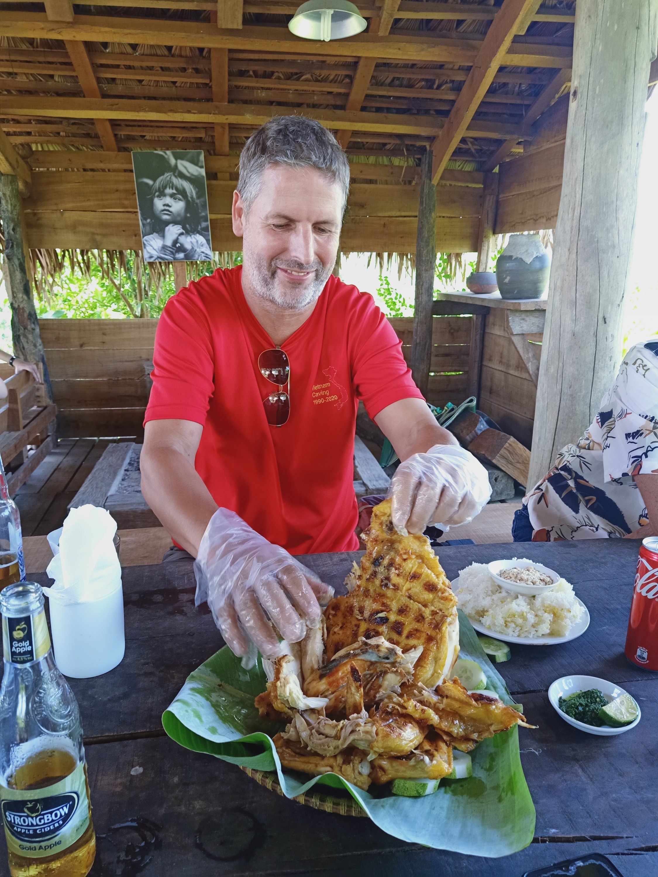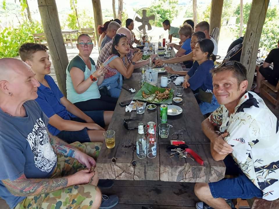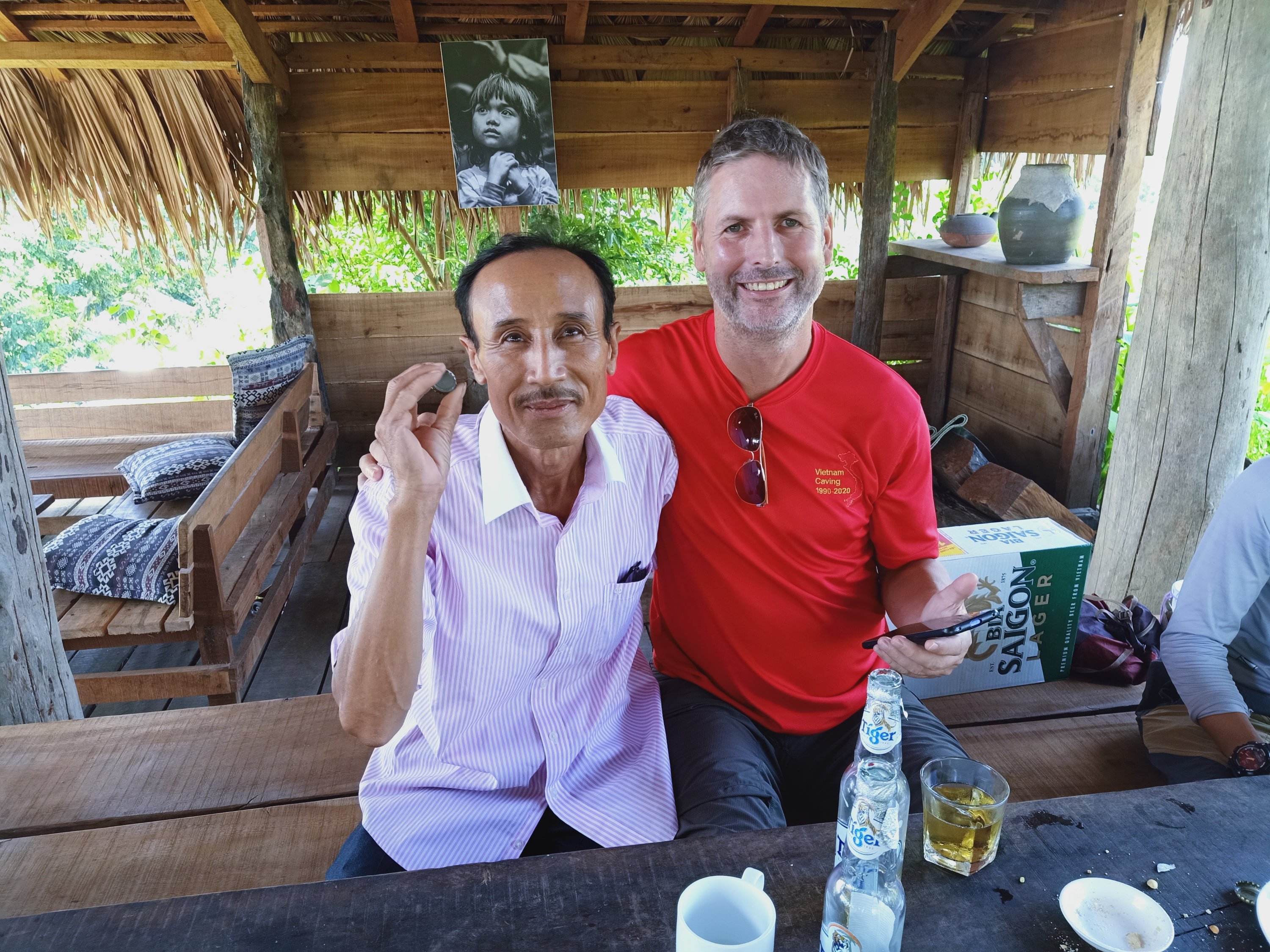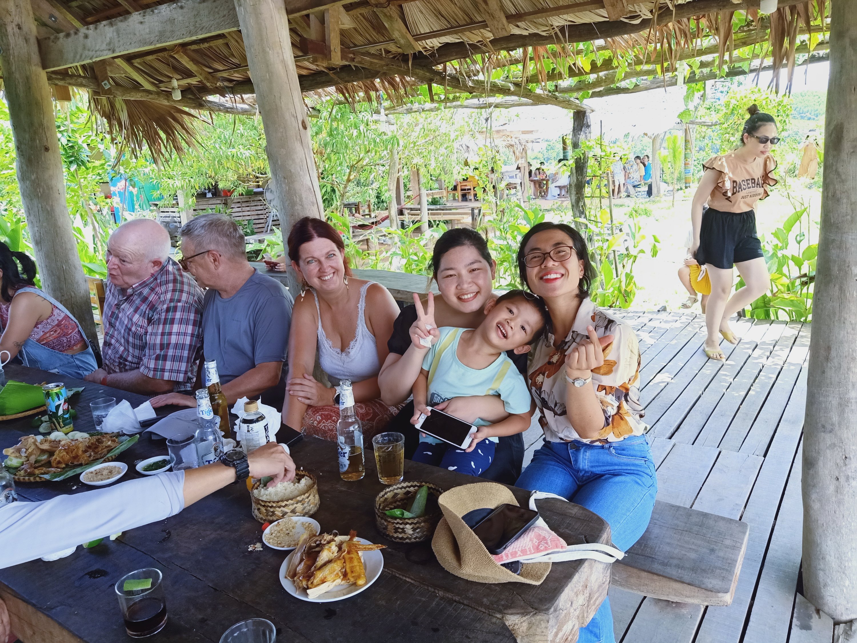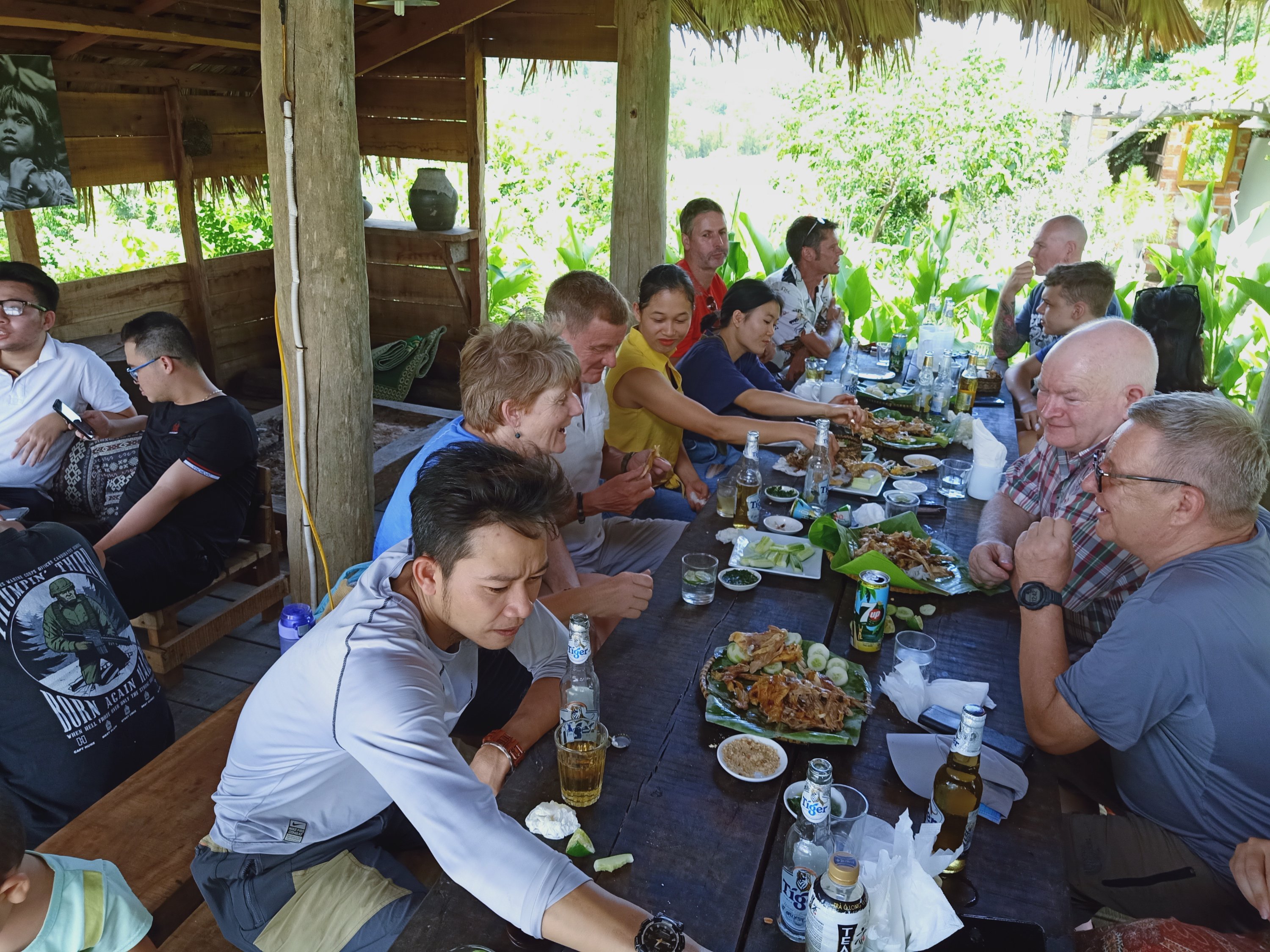 We had took a chance to book a table at East Hill for BBQ chicken and beers from 11.30am – it gets busy on Sundays so we usually avoid weekends. Captain Caveman pumped up Bluey’s tyres for me and we cycled it there in about 10 minutes, being overtaken by Stu and Jack on the way. On arrival East Hill had very kindly reserved us a table and even had a sign with my name and the time on. We ordered 2 chicken combos when we arrived, we don’t preorder because often the Vietnamese contingent can arrive late and then the chicken has been snaffled already. Next to arrive were Colin, Watto, Howard and Deb who had impressively cycled it from Phong Nha, then Mark arrived and we all ordered cold drinks and waited for others to arrive. The Funny Monkey’s team arrived and brought Captain Caveman a gift of homemade cookies which was so lovely. BBQ chicken arrived, the cavers ordered 2 more and we all started on the first lot of food. Mr Nguyen was last to arrive, looking very smart and carrying 24 cans of beer – what a legend! More beers were had and some photos taken and I had the bright idea to order even more chicken, thinking that any latecomers would show up soon! It was a really good lunchtime treat and it was good to see so many people celebrate Captain Caveman’s birthday.
