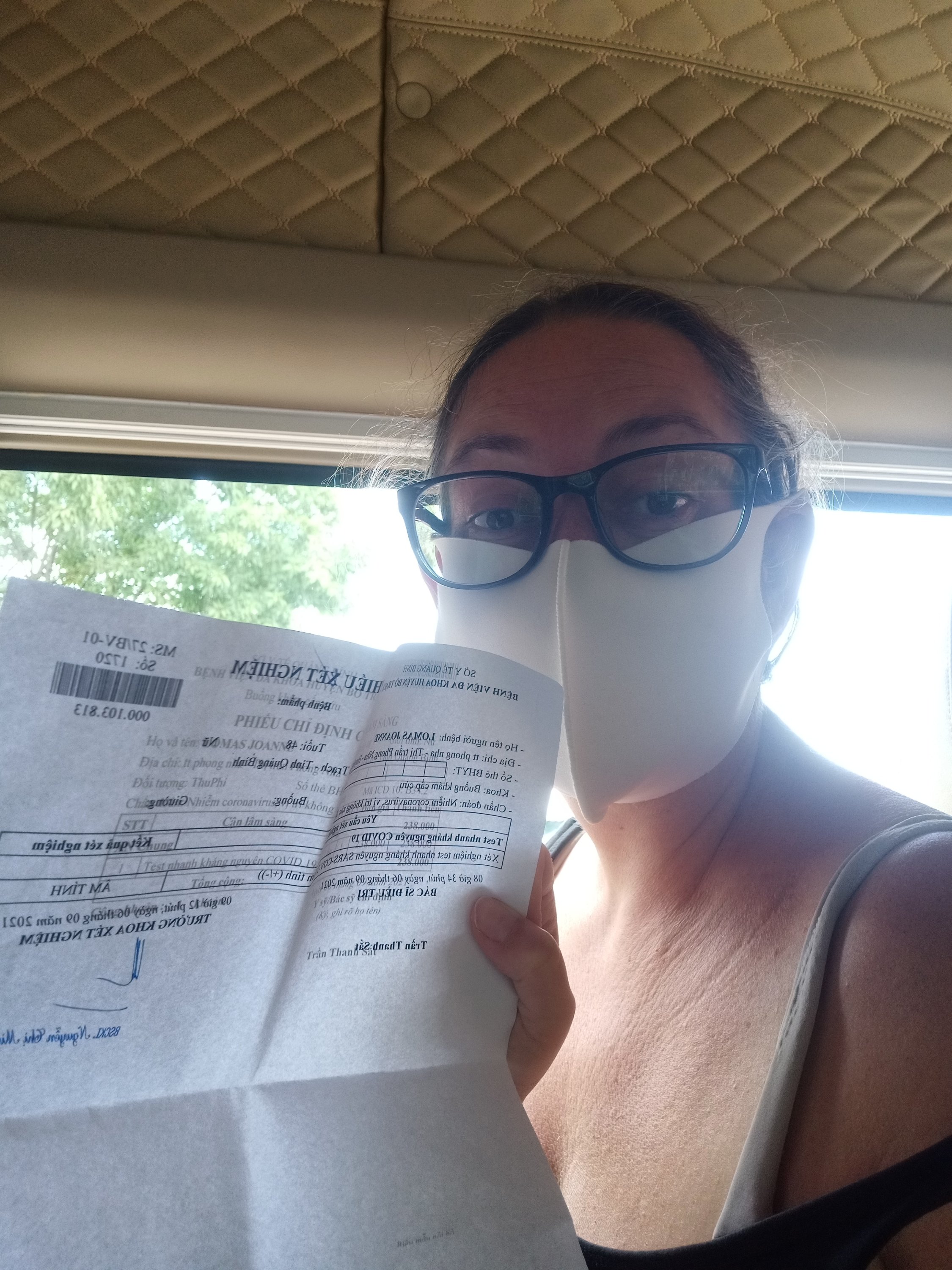 I had been waiting to get my 2nd vaccine, which would be 12 weeks since the 1st one in 2 days time and that had been one of the reasons I still hadn’t left Vietnam yet, hoping to be fully vaccinated before taking a flight or travelling through any major cities. I was so excited to find out that I was in the ‘wrong’ queue at Hoan Lao hospital and I hoped that there was perhaps some confusion over me being told that I needed a quick test and me getting a 2nd vaccine. I continued with the form and handed it to the nurse at desk 2, desk 3 was in clear sight and that consisted of doctors taking blood pressure and completing some details on a form, up the steps from there were 2 tables but I could only just see one and it had health workers waiting to jab people – they didn’t even have anyone waiting so I was even more giddy. At that point Captain Caveman had managed to get in touch with his colleague who had located the Marketing guy from Oxalis, Trung, to come and help translate for me. This was fortuitous as the nurse was asking me questions, which of course I didn’t understand, and he’d just had his 2nd vaccine. It was at this point that I wish I’d acted differently but I didn’t realise what was happening; Trung asked if I had already had my 1st vaccine and so I said yes and got out my receipt paper from that jab. I was next in line to get the jab, I’d even taken my coat off. That’s when the first bit of bad news came; they could not give me the vaccine because they were injecting Moderna today and my first vaccine was Astra Zeneca, which is not considered compatible in some countries, including Vietnam. No!!!! Captain Caveman then let me know I was in the wrong queue and I should be getting a quick test so off we went to another part of the hospital. It took 45 minutes from getting there, paying the 238,000vnd (£7.62), having the more brutal test than last time and then waiting for the result (so not that quick really). While waiting for the results we walked to the pharmacy to buy Captain Caveman some Diclofenac pills because he had a bad foot, I had to walk through a massive puddle in the rain and they were really cheap so I bought 4 strips at 6,000vnd a strip (£0.19) and then we went back to wait for my results. We walked past the bus and apologised for the wait and then got chatting; Trung lives in Dong Hoi but had come by motorbike today, he had had to have a quick test this morning to come to Hoan Lao, which he had at the CDC and took less than 5 minutes – that was useful to know. Eventually I got my negative quick test result, stamped on the back of my payment receipt, and headed back to the bus where everyone was waiting, there was one more passenger to come and that had been the guy I sat next to on the way there – he got the vaccine and the quick test and was really excited about it! The drive back was quicker as the checkpoints didn’t seem to be as lengthy on the return, a couple of them just waved us through. When I got off the bus on the highway, just past the Lake House, the weather was sunny and very humid, as I approached the checkpoint to our road home there was a few people about and shouting. The guy I saw this morning was there and stood up to ask how I was, I shouted over in Vietnamese ‘I’m negative’ and they all got really excited and let me through. On the way some builders (who weren’t wearing masks and shouldn’t be building) told me to go back and asked where I was going, I told them home and that I was negative and all was good. I was very hot, thirsty, sweaty and hungry when I got in the house! It had been a busy 3 hours out of the house, not observing the #STFAH rules and now all we needed to do was to ask Oxalis to book us the car to get my negative PCR test results (for flying) in Dong Hoi after 2pm this afternoon.
