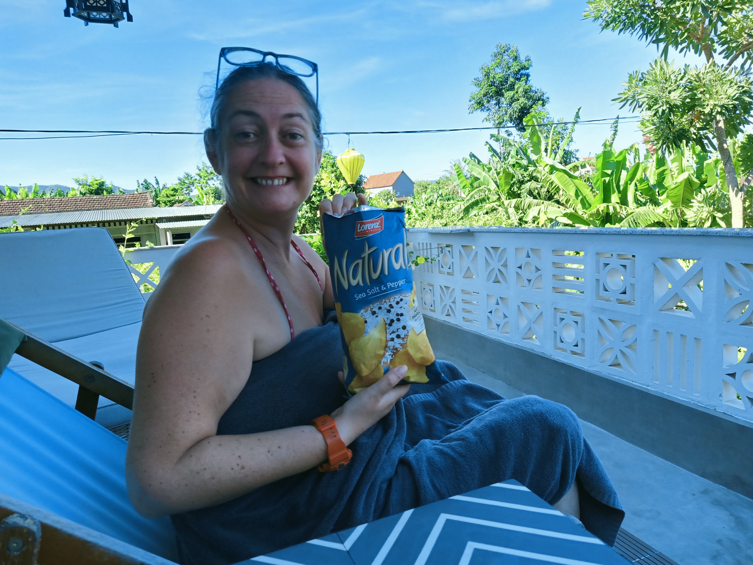 By 9.30am I had been dropped back off and was enjoying a sunny walk back home as the blockade man and some locals asked if I had been for another test and was I negative. They cheered when I said I had been for vaccine number 2 and I thought it wouldn’t hurt to let them know so they may be more on my side when I try to leave town. When I got home Captain Caveman had already started brunch, knowing I’d be hungry, and we sat in the garden to eat bacon, potatoes, cabbage and mushrooms. We decided to break our promise not to eat all the crisps and shared a bag while outside by the pool. A no-masker workman came to fix the water compressor which meant I’d be able to give my hair a good wash at last. My passport had finally been picked up by Bich so I arranged to send Captain Caveman to collect it when he was running his errands later. That afternoon I felt a bit tired so I had a lay down while Captain Caveman went up to the Lake House to collect bread and a couple of cheeky bottles of wine. He was gone for ages but back at home, Captain Caveman knocked up some pulled pork buns with the fresh bread collected from the Lake House and we opened a bottle of The Accomplice wine. Tomorrow, Operation ‘Get me out of here’ would recommence – only Captain Caveman and I would be involved in the details until we knew it was going to work!