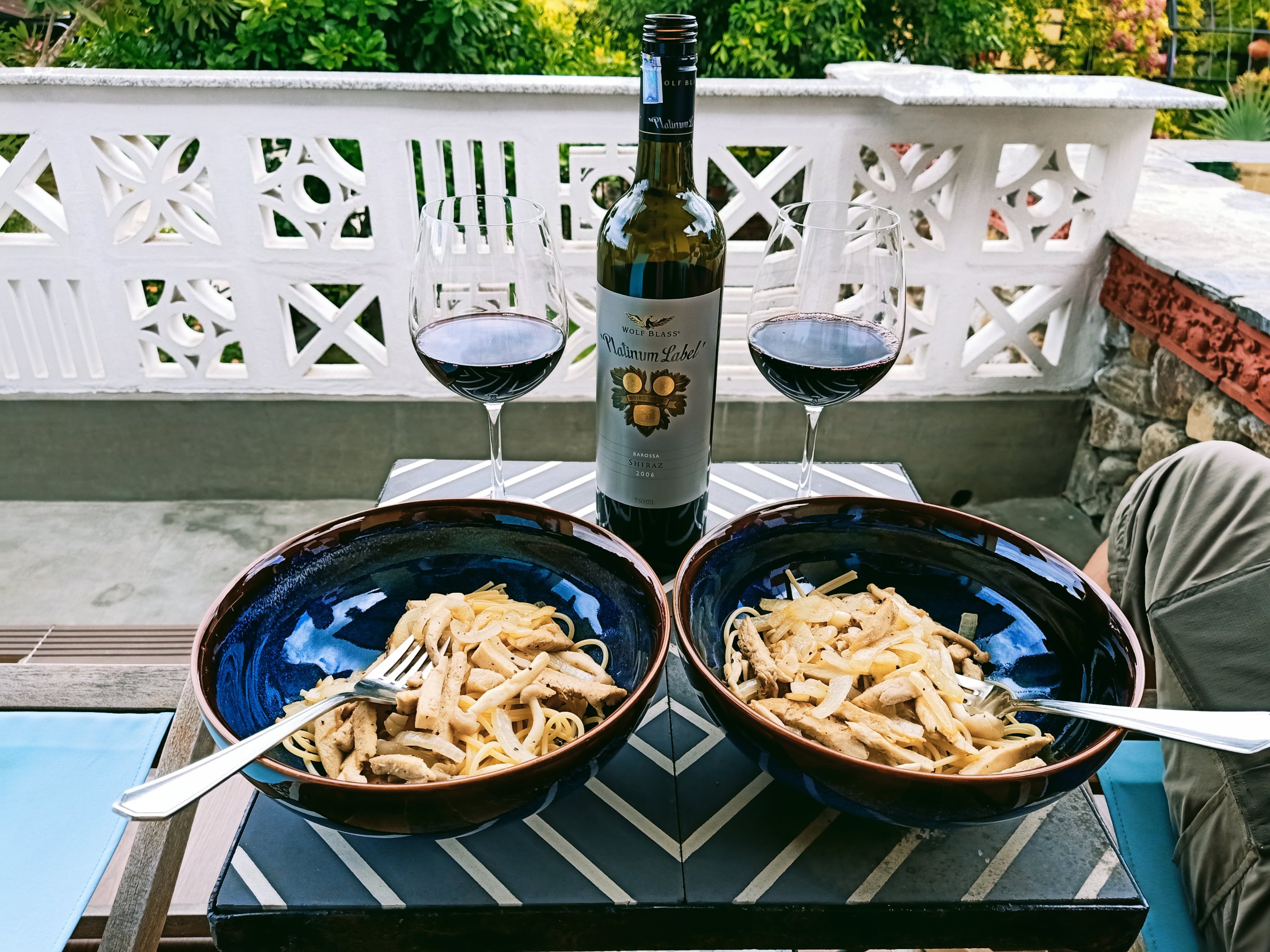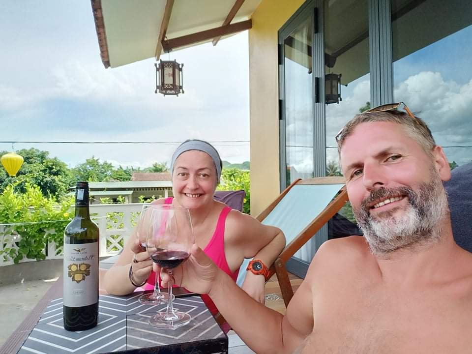 We had just walked back through the door at home, took our masks off, washed our hands, and Captain Caveman was updating his colleague that we had been tested, when Bich called. She had been called for her to organise for us to go for the PCR test, but we had already gone. She was a bit confused as she knew nothing about it but I explained that neither did we until 30 minutes ago and we just did what we were told. Captain Caveman hadn’t actually needed to get his done but he had decided it was wise to do so in case he ended up having to drive me anywhere to get me out. After speaking to his contact at work, again, Captain Caveman reassured me that they said all could be arranged and we were able to go ahead and book my flights. I was so relieved and, because we’d not eaten yet, we decided to have lunch first. I’m not saying Captain Caveman was happy that I was finally getting out of here, but he decided we would open his very last bottle of emergency wine, which was a very nice one, bought for him by one of his customers, Thien. I thought we should wait until it was all actually done before we started celebrating but he insisted, and I wasn’t going to turn down wine. He made a chicken and mushroom (using the ones we had grown) spaghetti which we had to make do without a sauce as we hadn’t been able to get any and we didn’t have many tomatoes left. It was very hot out so I had to keep getting in the pool to try to cool off and we had a lovely lockdown lunch, with great wine, on the balcony. We did a cheers to getting out of the house for 30 minutes during a #STFAH stint and we also spoke to a friend in Saigon to check how she was getting on. Things were pretty bad there but she was doing ok and was able to get food and wine pretty well. We called my parents and were full of excitement about our day and the plans all coming together to get me a step nearer to getting to Turkey – it could finally be happening!