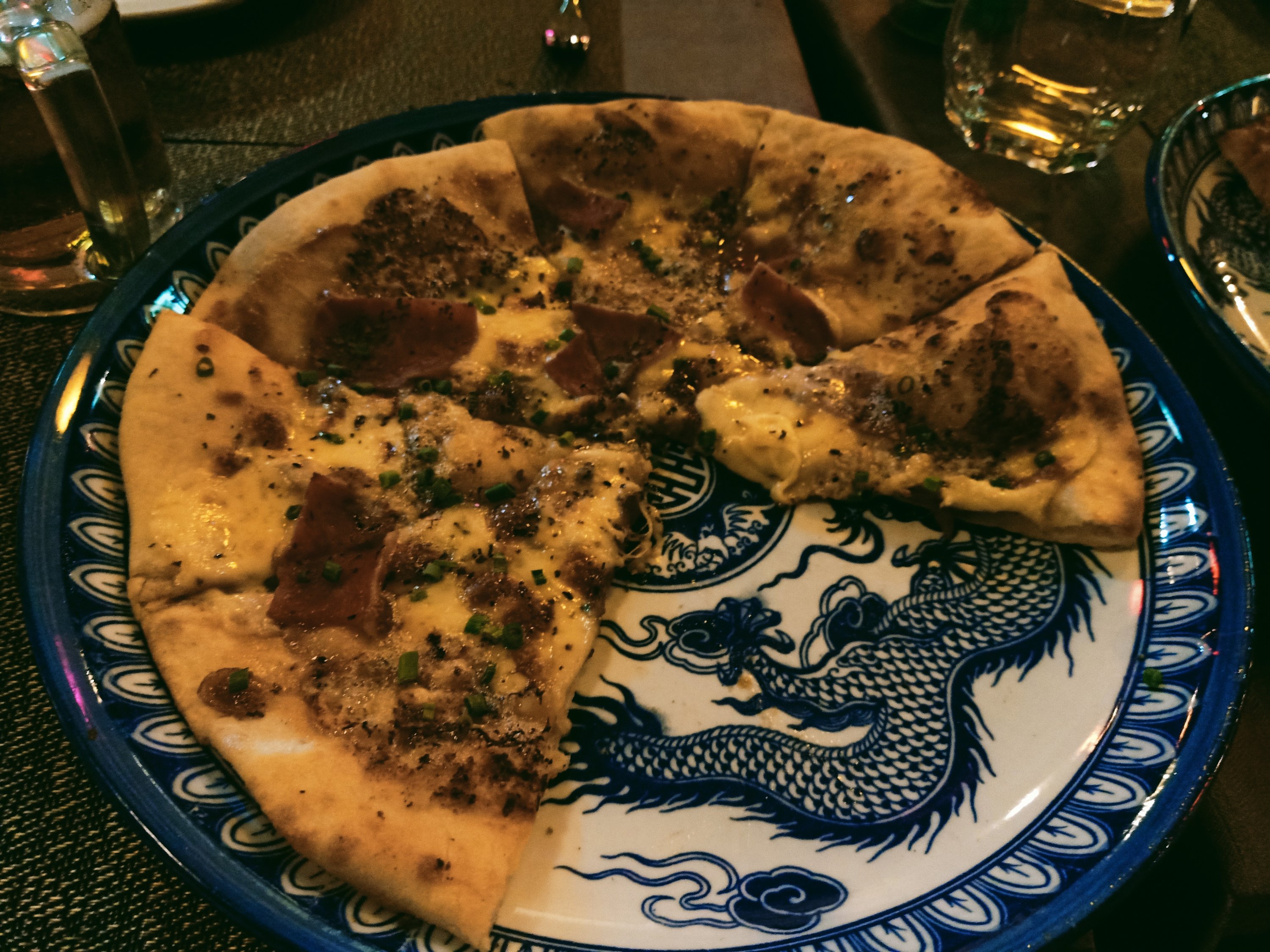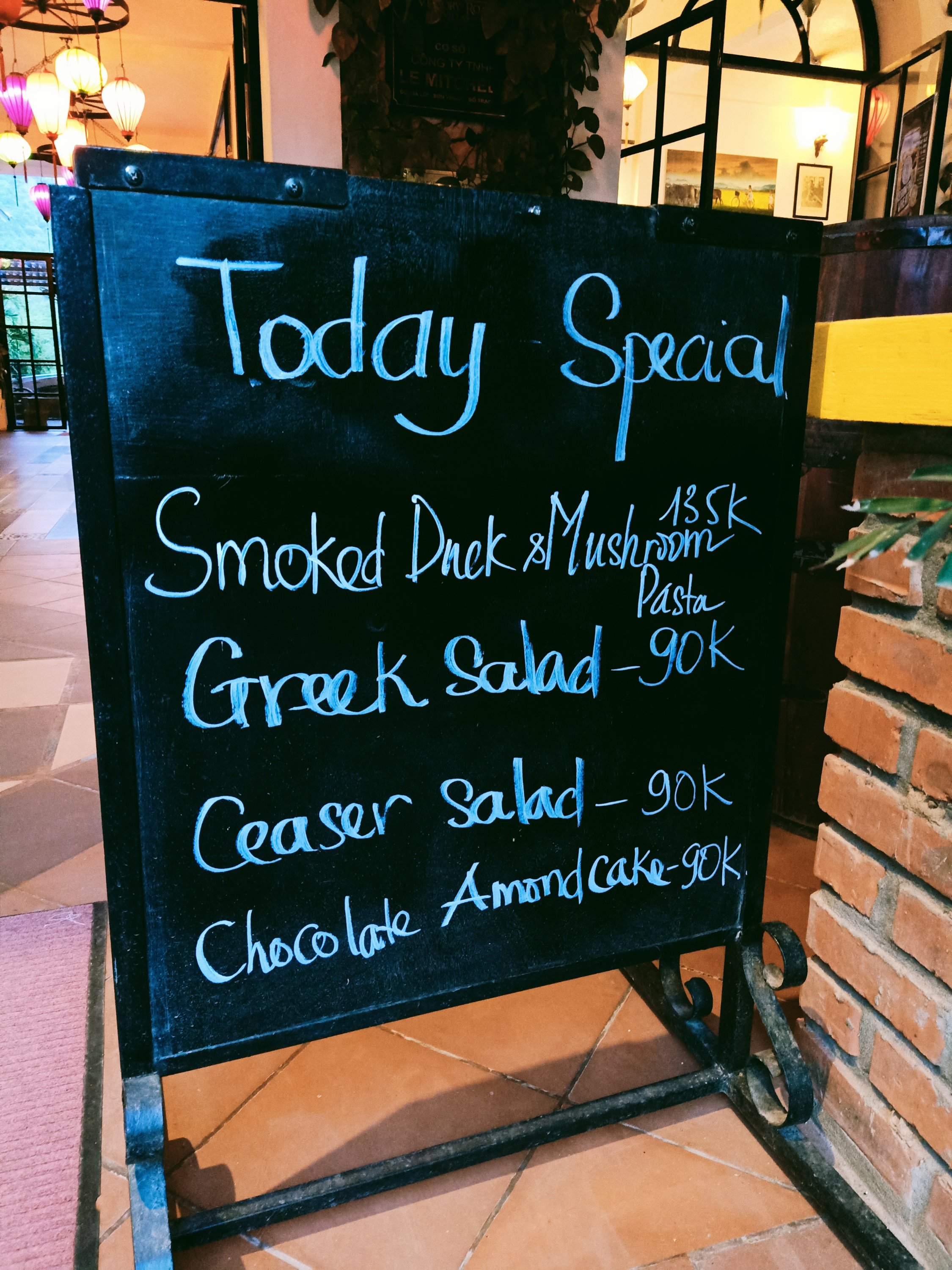 We arrived and joined Veronika, who was sat peacefully by the river, but not for long as Jack, Max and Stu arrived and joined us, shortly followed by a new returning visitor to the town and Tatas. This week it was made clear that all pizzas from the whole menu were only 100,000vnd so I went for the Showstopper (prosciutto, blue cheese, fig jam and spring onion). Tatas went off piste and ordered a half and half pizza, Hawaiian and Classic which was a good idea. Jack happened to order Smoked Salmon pizza and was sat opposite me, they didn’t tell him they had no salmon but instead just brought him Smoked Duck (obviously because the name had the word smoked in both). Veronika had successfully managed to order and get the new dish of smoked duck and mushroom pasta which did look good. We had a really great night and we were sensible to not order 3 pizzas this time, in fact I brought a Tupperware box and took half of mine home, including a slice of Jack’s duck pizza, just to help him out.