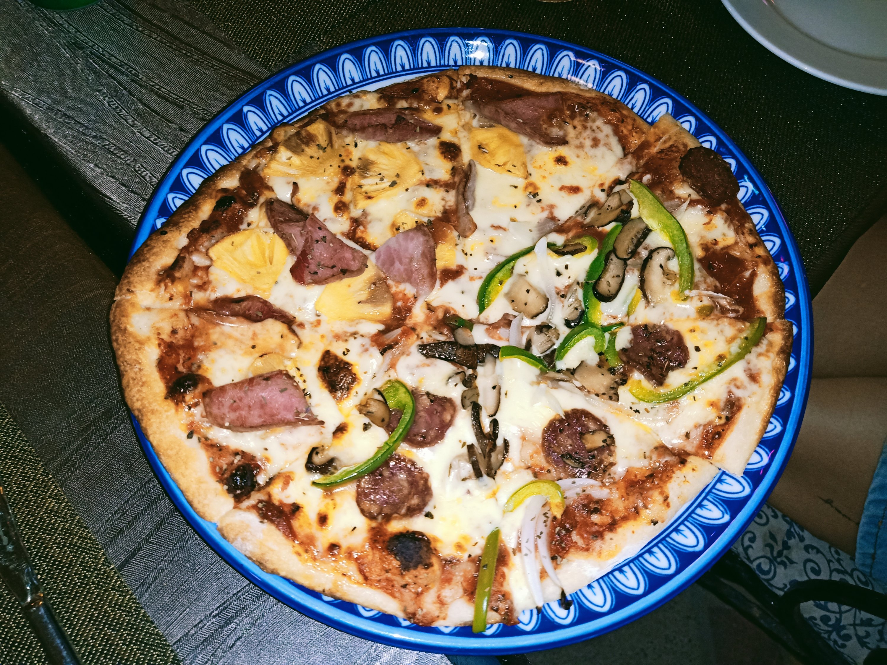 The housekeeping staff were in doing our rooms while Veronika was out at the Farmstay and so I took the opportunity to find things that needed using up to make some brownies. We had some dried bananas, which Captain Caveman had bought ages ago and they did not look appealing at all, plus the cocoa powder I didn’t like as drinking chocolate. I found a recipe that used those 2 ingredients plus some peanut butter and mixed them altogether then put them in the oven in trays for 15 minutes. I managed to catch my finger on the glass of the oven, burned it worse than I realised and didn’t run it under cold water, I just carried on as normal. The gluten and dairy free brownies looked good but the consistency wasn’t great, hopefully they would do as a snack. I did loads of washing up, watered the mushrooms and then I had a make-do lunch of steamed rice and sweetcorn with peanut salt because I knew we were having a feast tonight. After lunch I had a swim and then fell asleep on the sun lounger. It was pizza night at the The Villas tonight so Captain Caveman just got back home from work in time to get a lift with Ben at 6pm to The Villas, Veronika had already ridden her motorbike in because she had decided to have a night at The Villas for a bit of a ‘holiday’.