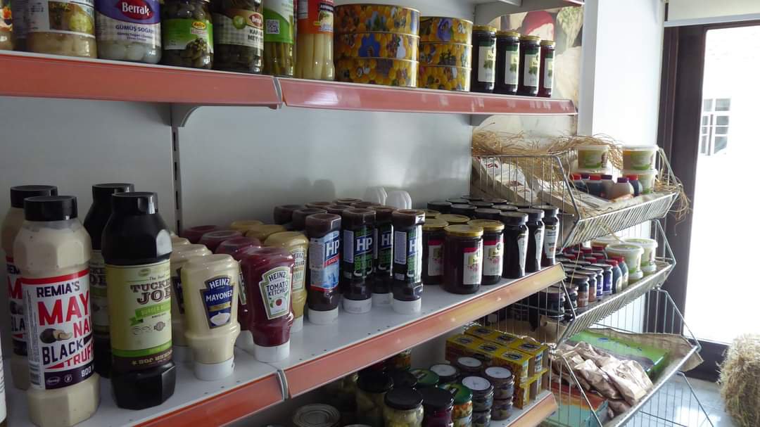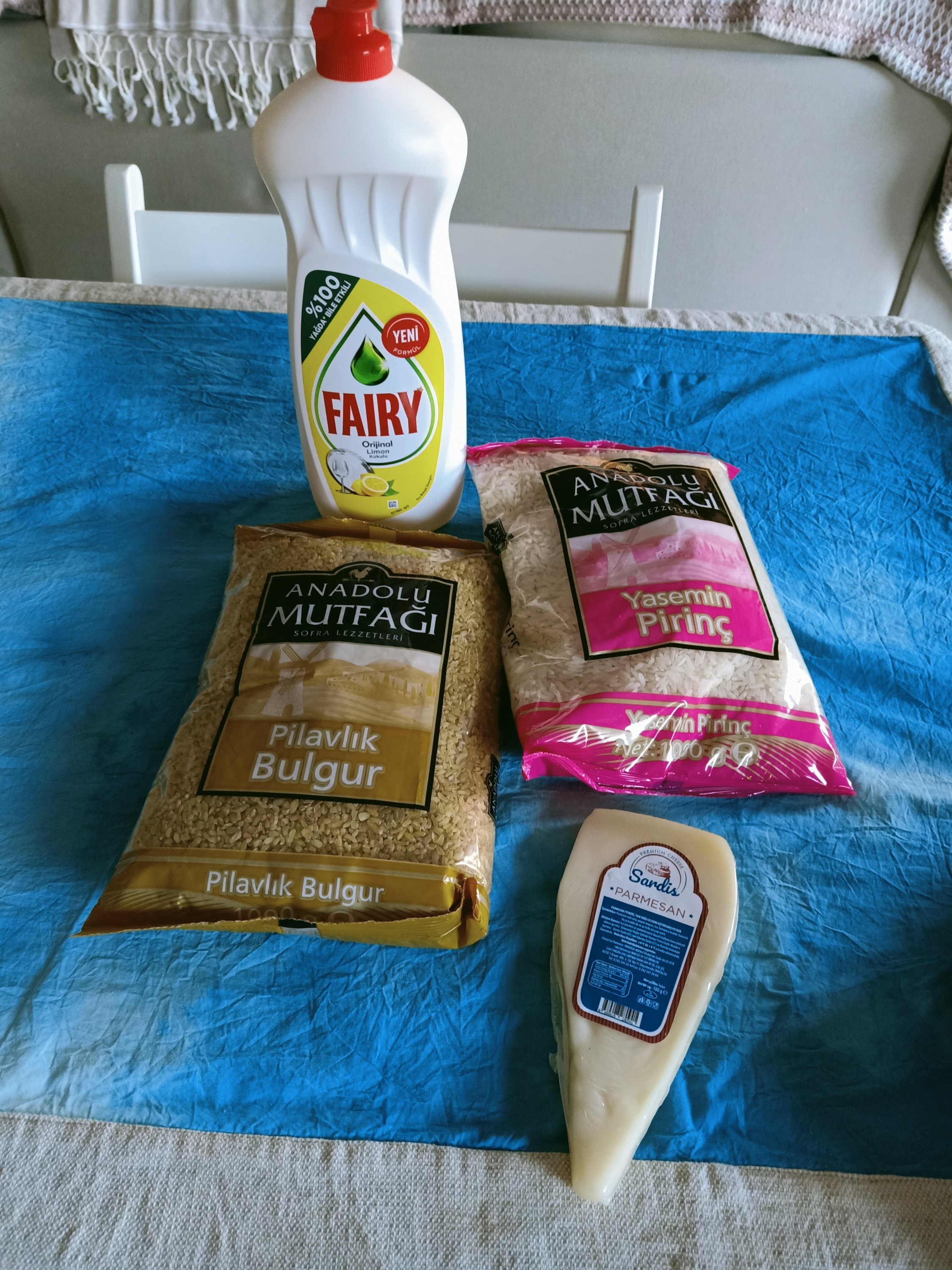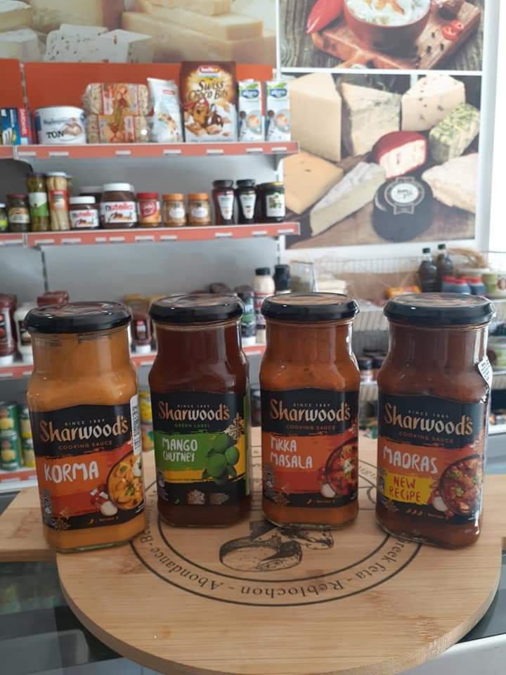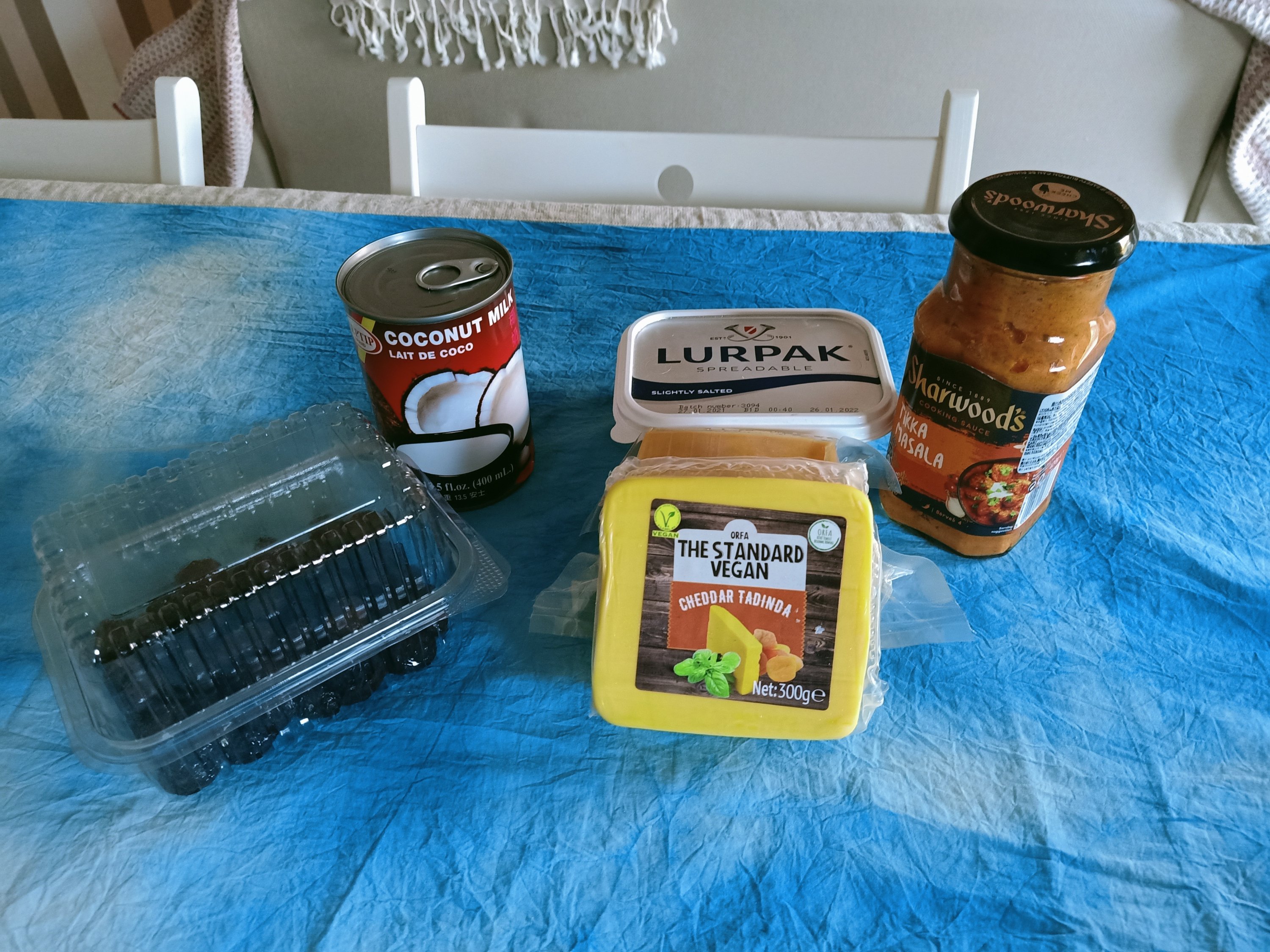 Dalyan şarküteri 1 tub of black olives 1 tin of coconut milk 1 Lurpak butter 1 vegan cheese 1 cheddar cheese 1 Sharwood’s sauce