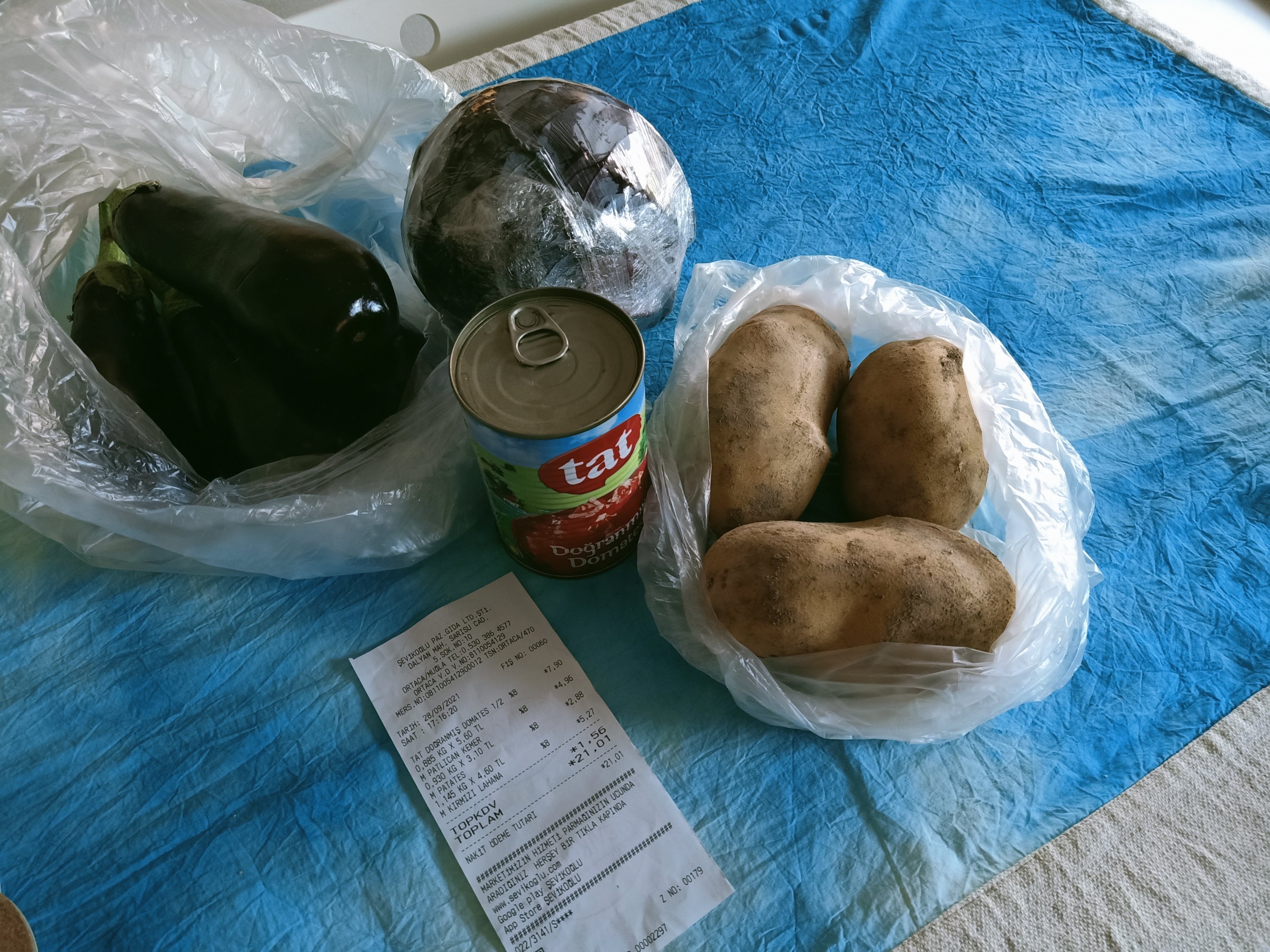Şevikoğlu supermarket Potatoes 2.88 Aubergines 4.96 Red cabbage 5.27 1 tin of tomatoes 7.90