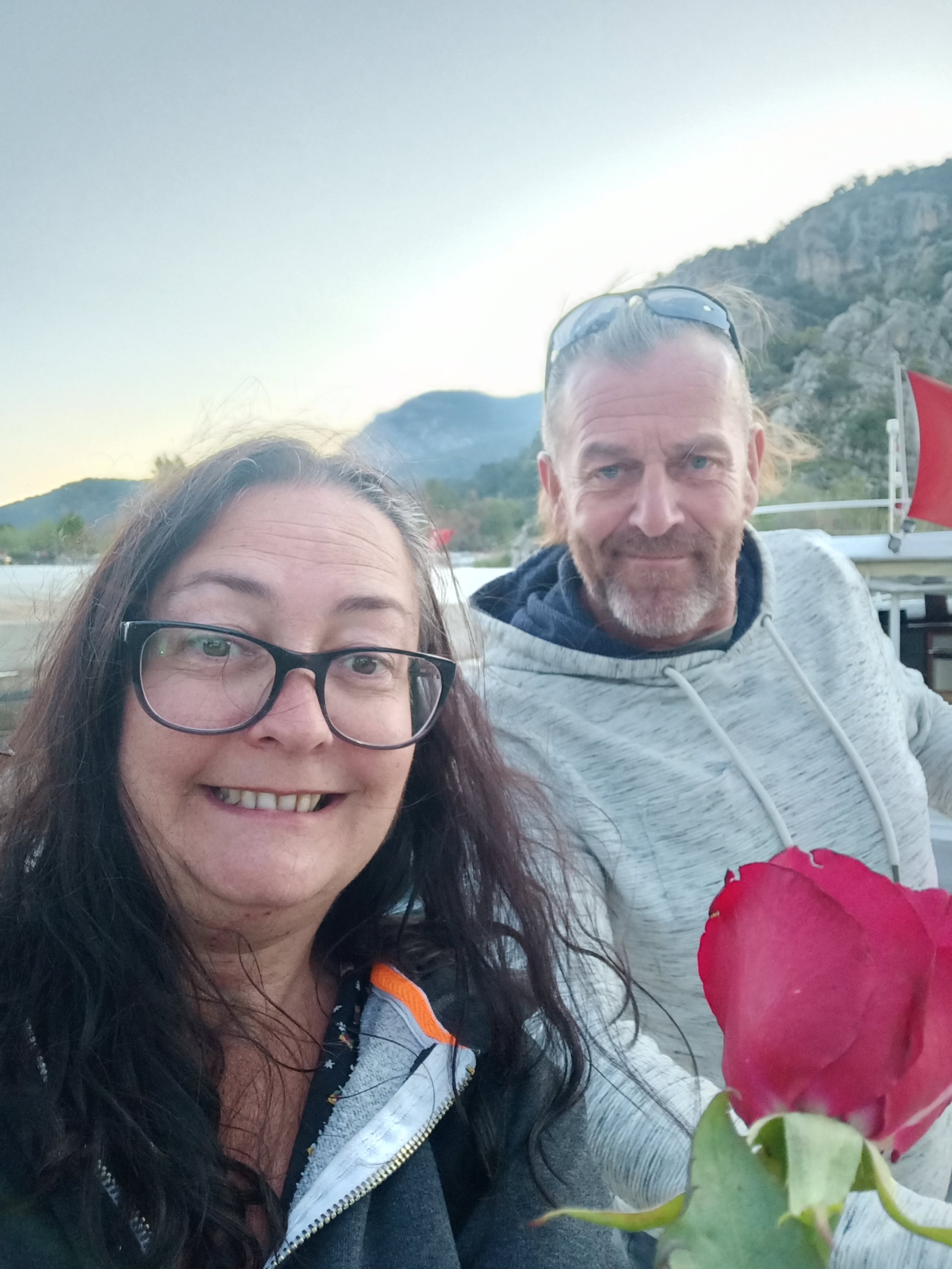 The lady selling flowers came round and persuaded Mark to buy a rose for Kate and then she gave me a free one, which was sweet of her. Kate went on ahead to meet her friend at the Rum bar, Mark and I finished our drinks and paid. As we were walking down the river, Mark pushing his bike, and me carrying my rose, it was getting a bit chilly. Mark went on to Rum bar and I said to let everyone know we were running late and had gone to eat.