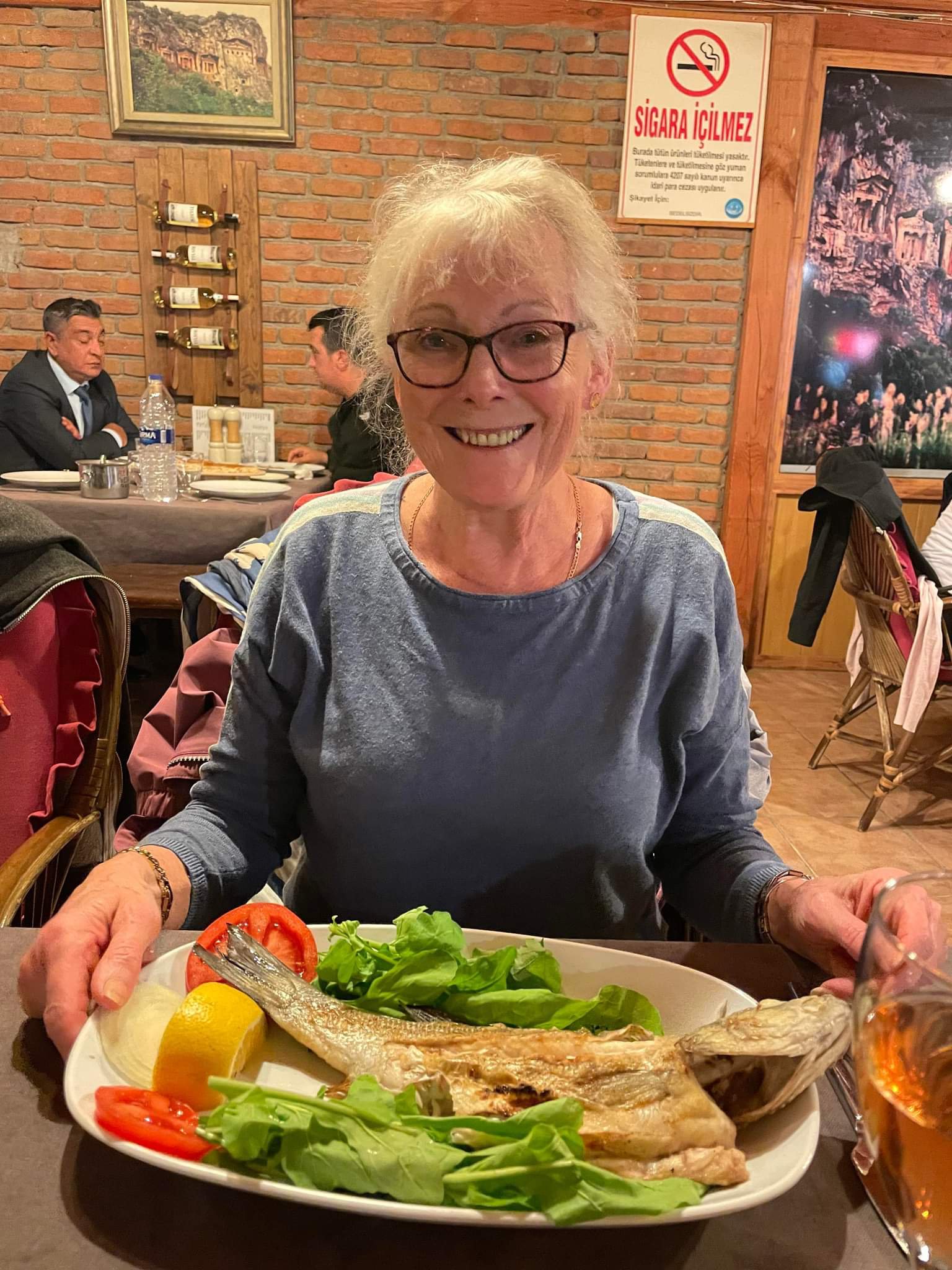 We received a warm welcome from Muharrem at Kordon, not least because there was a fire on inside and it was very toasty. I enquired about the giant prawns and found out that they were 650 lira (£34) for 3 so I didn’t bother. Linda and Alex decided to have a whole fish each, Louisa had lamb and I had hummus, mushrooms and beetroot as a main course. The food was lovely and we went to the Rum bar after where Mark, Kate, Sue, Ann, Debbie (Darling), Roy, Kev, Ali, Cheryl and Sarah were already waiting for us.