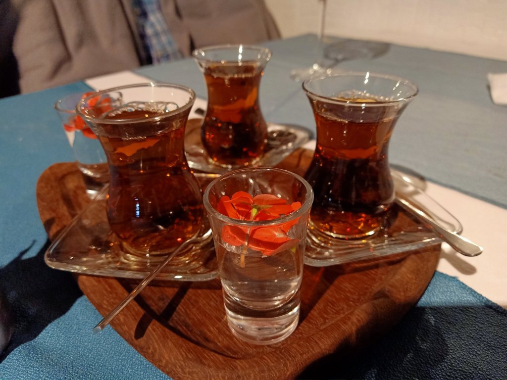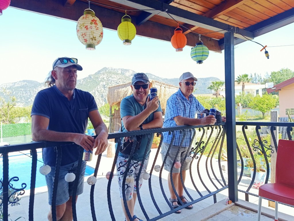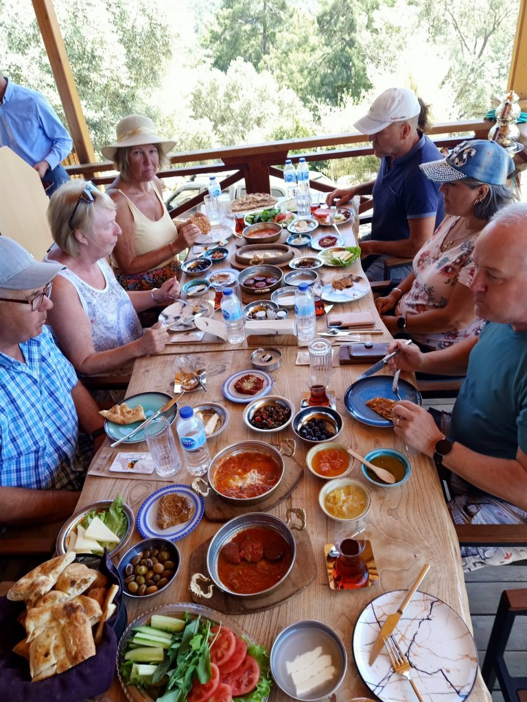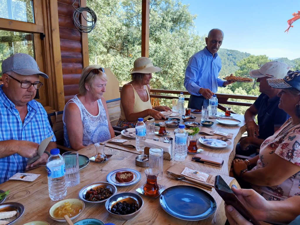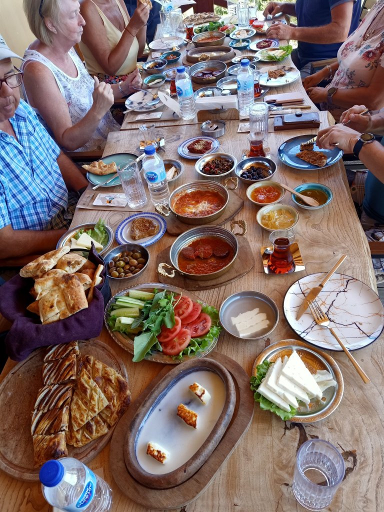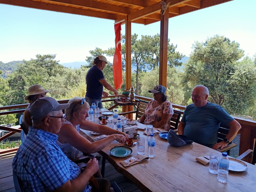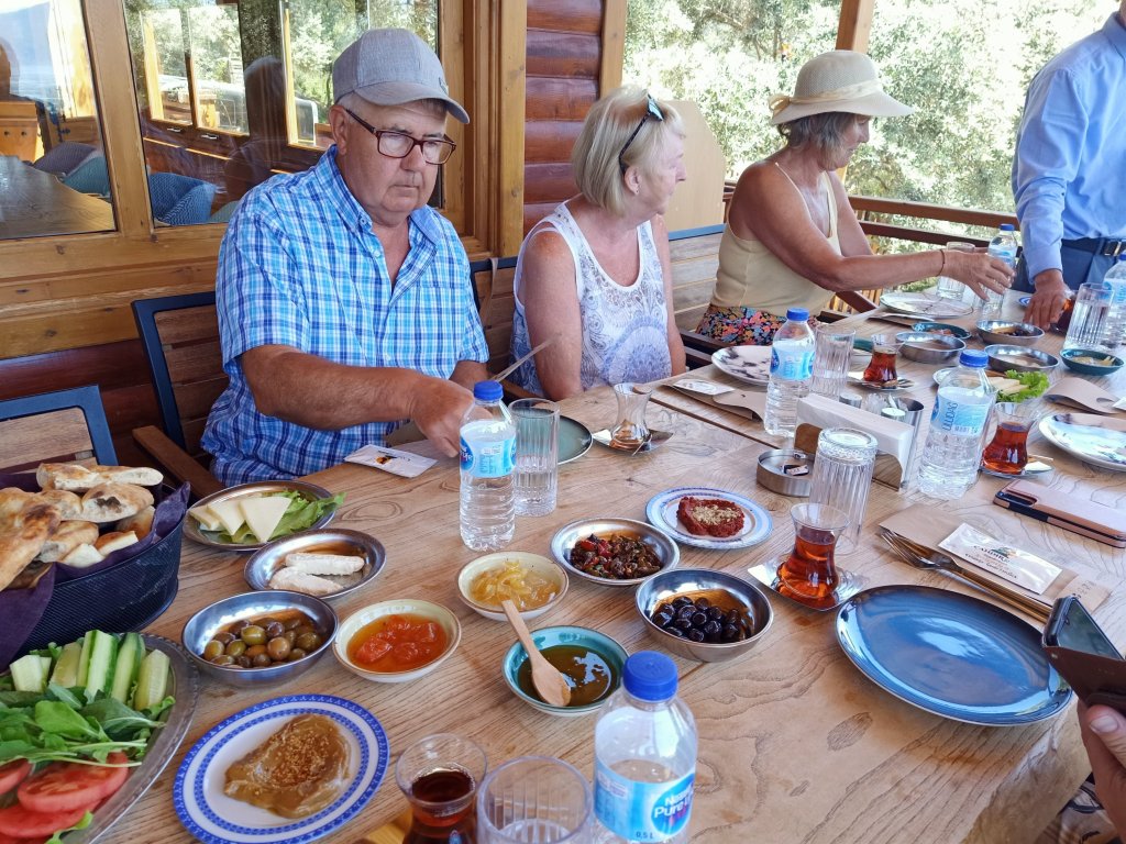 Sunday 8th May was one of my favourite days and I felt so lucky to be able to have an amazing day with family and friends. I’d arranged for 7 of us to go to Çandır Resort for a Turkish breakfast. Ma, Pa, Vanessa and Matt were picked up by one of Fikri’s taxi drivers and driven to the ferry crossing near to Mark and Kate’s house. I cycled Bluey2 over and met Mark and Kate as they were walking to the meeting point. The ferry crossing was about 8 lira for each passenger, one way, and I had arranged the minivan pick up when we reached the other side. The journey wasn’t for the faint hearted and the venue is not to be confused with Çandır Terrace, which is not as remote. Our table was on the end of the balcony with lovely views of Çandır. The breakfast was massive and only just fit on the table, Mark was in charge of pouring the tea. The Turkish banquet costs 150 lira (£7.80) each, it took us about 2 hours to eat and it was definitely the best one I’ve had in a while.