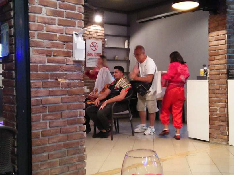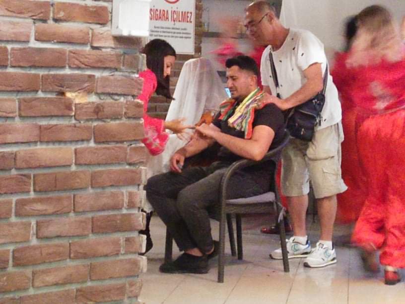 When the show started the dancers seemed to be being told all the moves by a slightly agressive male choreographer who was quite old and had his flies undone. Appo, the waiter, came over and asked if I would join him ‘on stage’, presumably to dance later, so I agreed. What happened next was a bit different as I was escorted to a chair on the stage. I was sat next to Appo who was being massaged by the choreographer while women danced around us, I got a bridal veil put on my head and a blob of henna on my right palm. Before I knew what was happening Appo and I were ‘married’ in front of everyone and then we had to dance in a line with the congregation. There were fireworks followed by more dancing, of which Vanessa and I joined in, nervously in case anyone broke anything. Mehmet was brilliant at getting us all up dancing too and was showing everyone his moves.