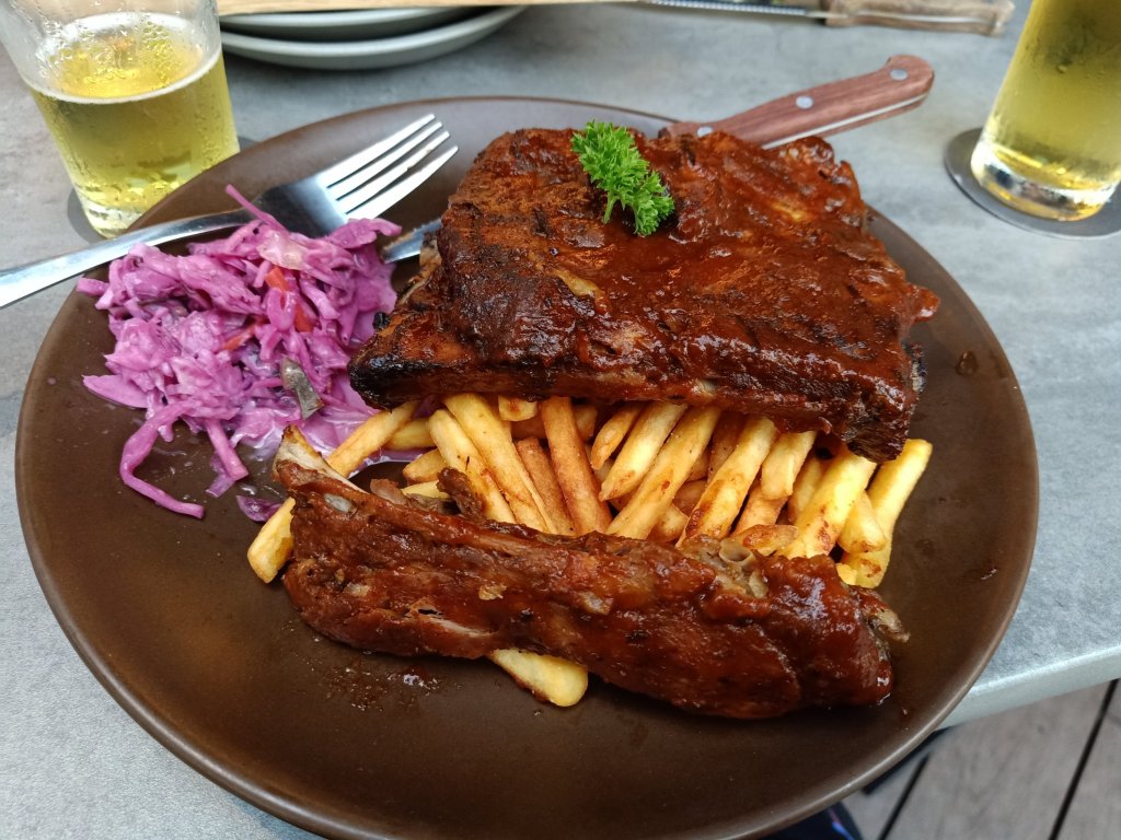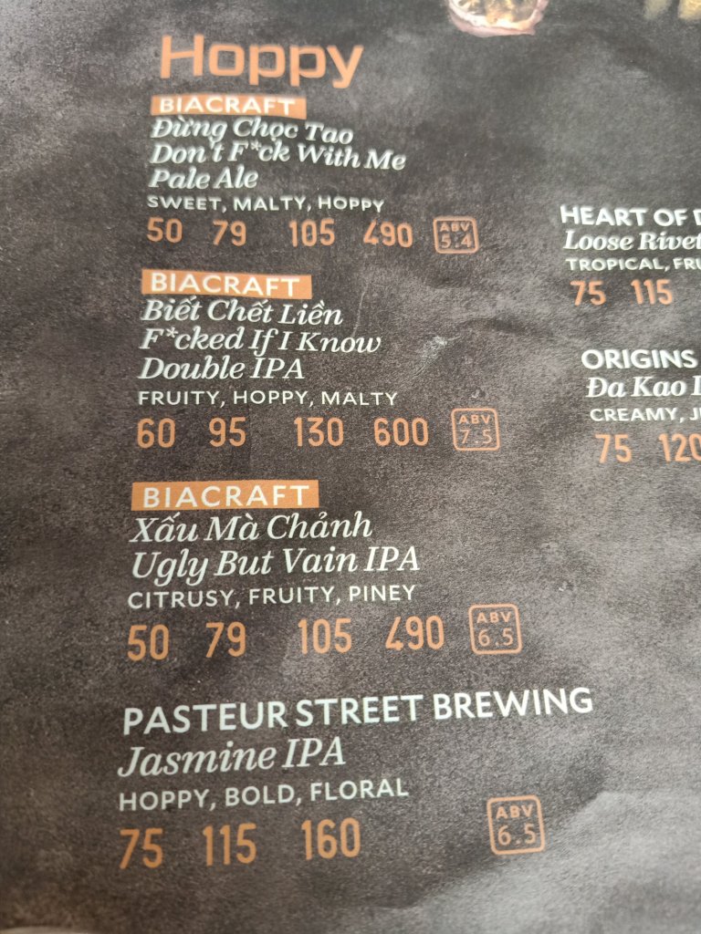 By 4.30pm we were on our way to meet Keith from Grimsby, who lives in Saigon. I’d asked Captain Caveman to think of a bar which had AC as I didn’t want to drink in this heat and become sick with dehydration. When we arrived at Bia Craft, which I already knew would be an outdoor place, we picked a table near to a fan in an attempt to keep me cool. It was still unbearable but of course we were here now so I may as well get a beer. I chose a beer made with rice in the attempt that I wouldn’t consume too much gluten and have a bad stomach. It tasted ok but when Keith arrived he let us in on one of his top tips that there is another beer which is a lot cheaper if you buy the bigger size. We all had one of those and ordered food. I had already decided I was having a rack of pork ribs with chips, Keith ordered a burger and Captain Caveman ordered a sausage but was giving Keith his chips as he’s not a fan of them. My ribs were so good and we had several more of the better value beers.