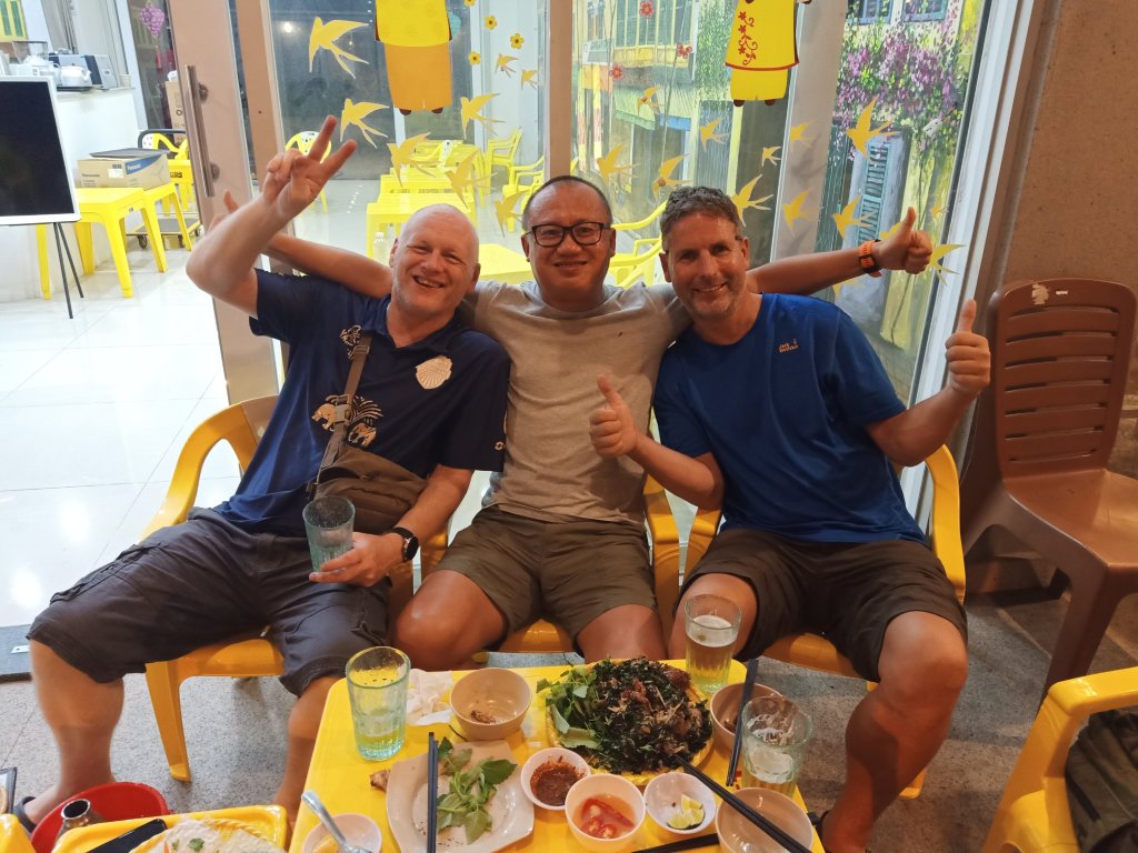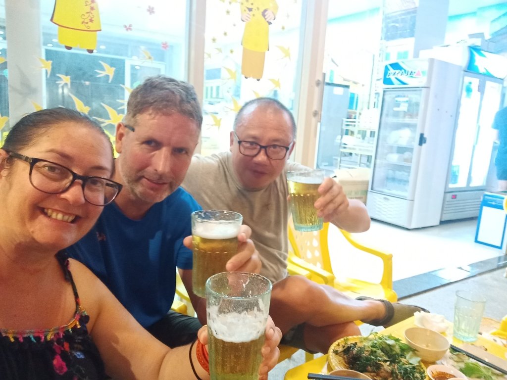Next, Captain Caveman had arranged to meet his friend, Hung, at a Bia Hoi place not too far away so we invited Keith to join us. When we got there Hung was already on his way and had several Bia Hoi containers at the ready and snack food. There was duck and beef jerky, later he ordered frog. I was too full to eat anything more so I just stuck to the beer. It was a great evening and I enjoyed catching up with Hung and Keith from Grimsby as it has been a long time since I’d seen them, due to the pandemic. Keith was the first to leave as it was a school night, but luckily he didn’t live far from the Bia Hoi bar.