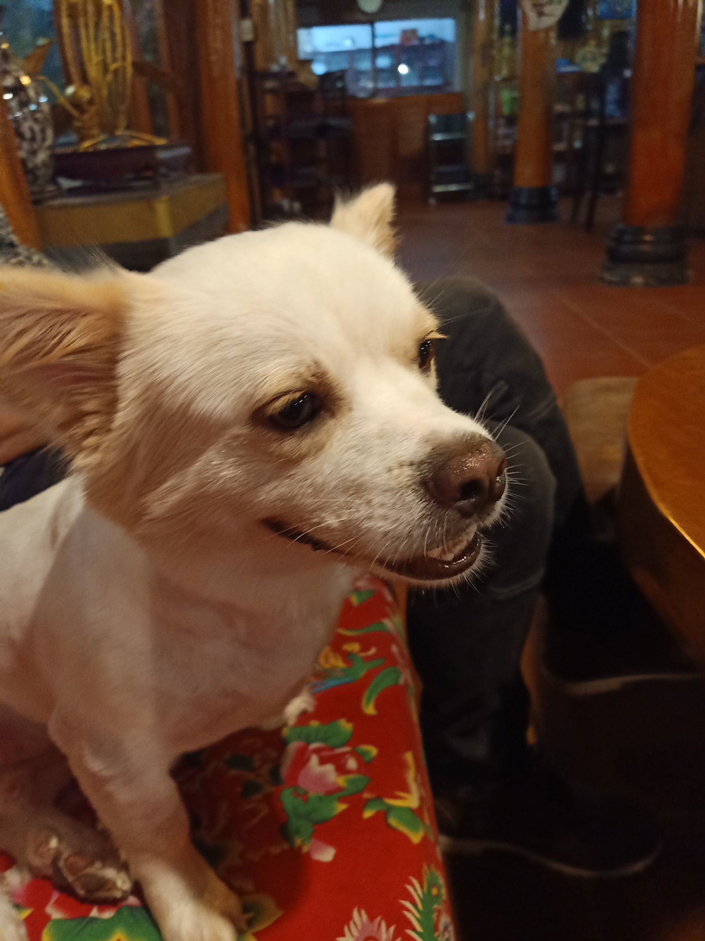 On the way back, the grocery stall in the house was open again so I watched while Captain Caveman tried to explain he’d already taken items yesterday and had just come back to pay. He nearly got the items again and the husband was in trouble with his wife, possibly for leaving the stall unattended yesterday. I needed a pee, after all that beer, so we stopped off at Tree House cafe on our way to pick up some croissants. Captain Caveman had a coffee and I had a passion fruit smoothie, which was brilliant. Mao, who had been at the wedding too, was there and managed to scare off some backpackers with how drunk he was. Our next stop was the Lake House to pick up some pre-ordered croissants but they weren’t there yet. This lead to us having a bottle of white wine at a cost of 660,000vnd (£23.76), as the cheaper one wasn’t available, while we waited for them to come from Dong Hoi. We got to see Snowy, the dog, who loves Captain Caveman and finally got the croissants but didn’t pay at the time on account that the bill said there were 10 breadrolls instead of 6 croissants.