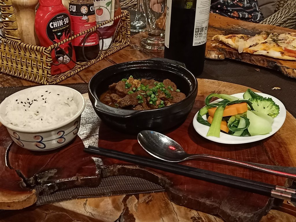 Shannon, was in town and we’d organised a soirée at the Phong Nha Farmstay. I snaffled down a toasted teacake and passion fruit snack, then got ready. I met up with Shannon, Veronika, Ross, Trang and Andrew for some dinner and a drink. I had a couple of beers and ordered a pork clay pot while the others had pizza or snack food. Mine took a bit longer to be served but it was really good and I had some rosé wine with Shannon. It was a pleasant evening and good to see Shannon passing through Phong Nha after a year away. Captain Caveman was back home before me and the rain had started to get heavy when I got my lift back home.