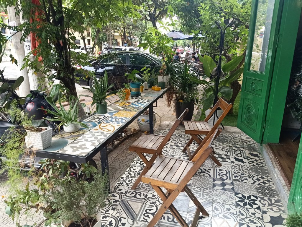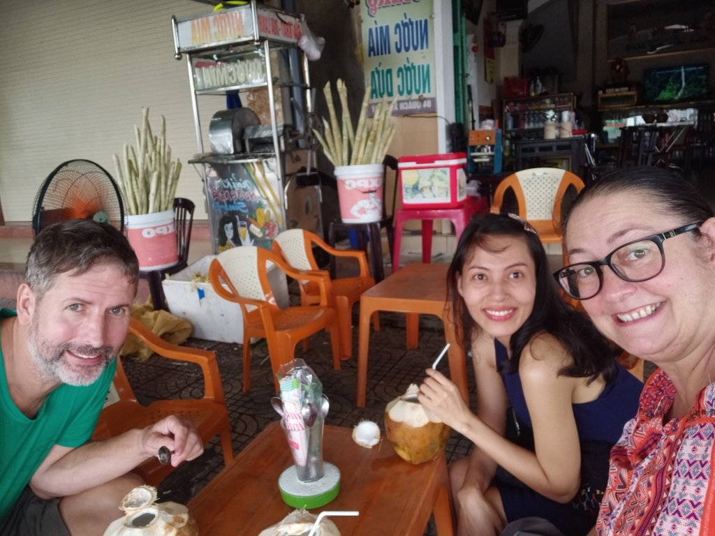 Our next stop at the Wine Plaza was a bit unusual; we walked in to a birthday celebration of the owner. They had us join in the photos in front of the flowers and then gave us both a glass of red to join in. They were lovely people and we ended up in there for much more than the 5 minutes we told the driver. We left having bought 3 bottles of nice white wine, one of which was 900,000vnd (£32.40), the other 2 much cheaper. This was all before lunch time and we were meeting Thao at 11.30am for Banh khoai, crispy pancakes. Before that we went to QB Casa where Captain Caveman had a juice and I had a peach tea.