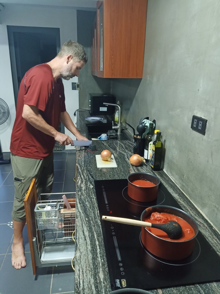 Although we were up by 7.30am, on Monday 8th August, the weather was wet and it looked like a day of staying at home was on the cards. Captain Caveman and I lolled about most of the morning and didn’t even have any breakfast. We had sandwiches for lunch with the fresh baguette and watched the rain while eating passion fruit. In the afternoon, Captain Caveman made tomato sauce for pasta. The rest of the day was very rainy so Captain Caveman couldn’t go to Phong Nha as he’d planned. We had wine and pasta for dinner, with the homemade tomato sauce which was lovely. It was Captain Caveman’s last day off – the last few days had gone so quickly.