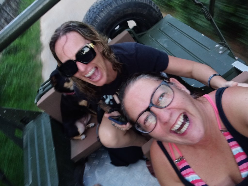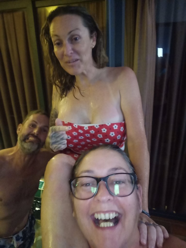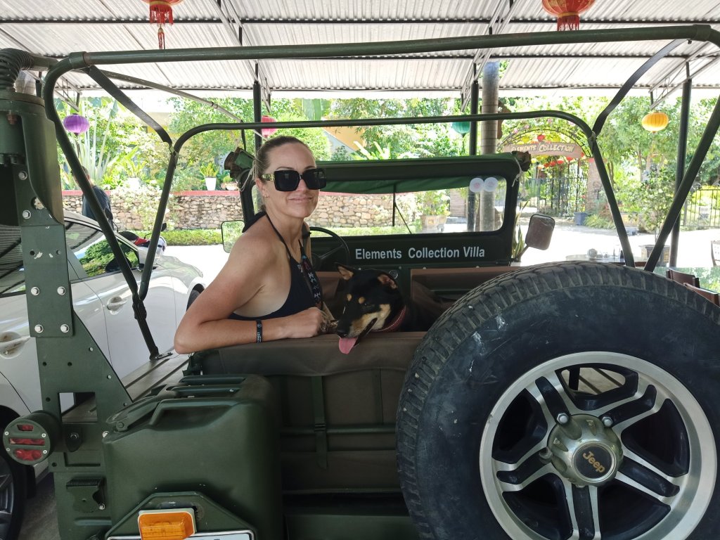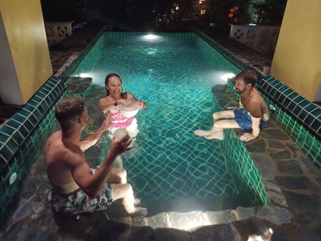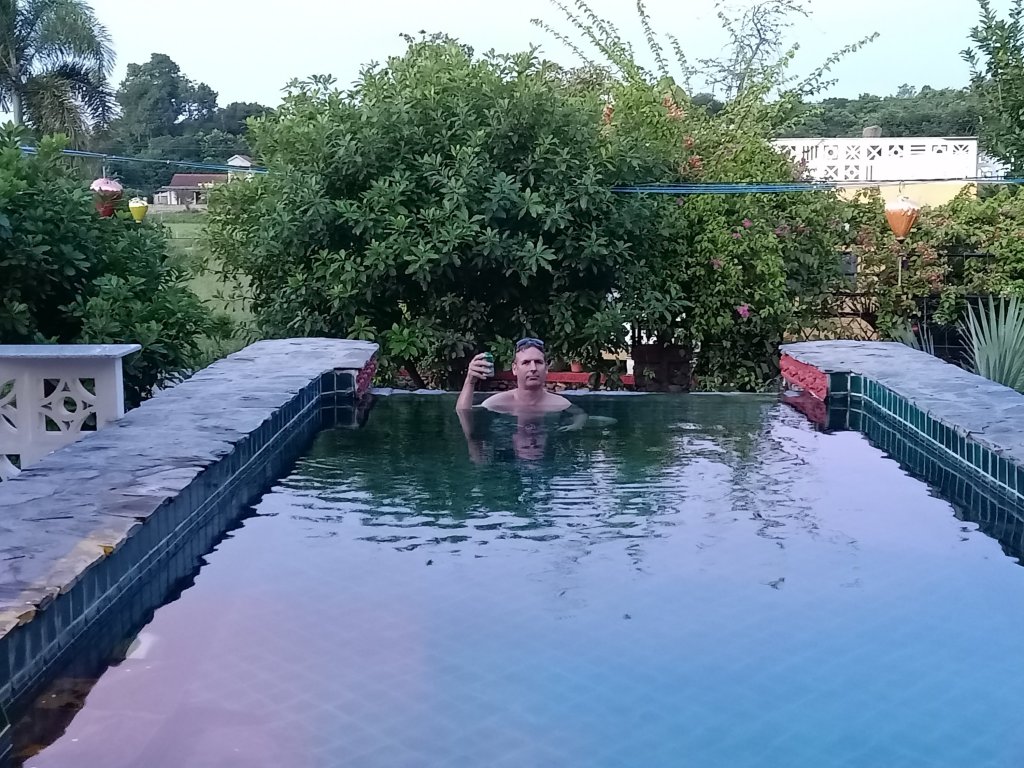 By 5.20pm we decided Caroline should borrow my more modest swimsuit and we should go for happy hour at the Farmstay. We were already pretty happy but Caroline wanted to meet Andrew and Trang there, so off we went in the jeep. We had a swim, several rum and cokes were had and we ordered pizzas. After a few more drinks we decided to go back to Elements as Captain Caveman was on his way back from his gala dinner. He’d got back late from his last tour so we hadn’t seen him this afternoon. We asked for a driver and the jeep to take us home. As we waited there was another guest waiting to go back to Elements so we shared the jeep ride back with him.