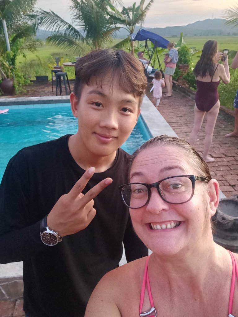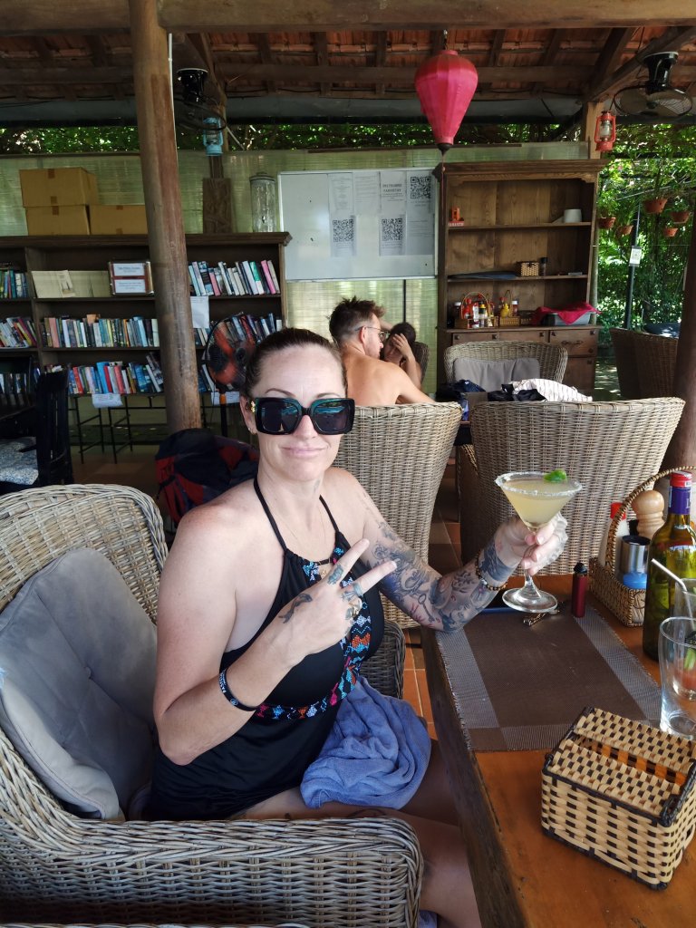 When we arrived at the Farmstay there was no way I could have any alcohol after the weekend we’d had! Captain Caveman and Caroline, however, managed several frozen margaritas and food was ordered. I said I’d share Captain Caveman’s salami pizza and Caroline went for one of the Aussie meat pies with chips and gravy. Kat came over from Phong Nha to meet me and it was great to see her and Caroline get on. They are so very different but both have very interesting lives so I was pleased to see them find some common ground to chat about. Our pizza was very good and was proven by me only getting 2 slices and Captain Caveman snaffling the rest in record time! Kat wasn’t able to stay long because her boyfriend, Buu, was on his way out of the caves and she wanted to see him while she could. I didn’t think we would stay much later anyway but we stayed long enough for a swim in the pool and to see Benjamin off. We’d made another new Phong Nha friend and I felt sure our paths would cross again.