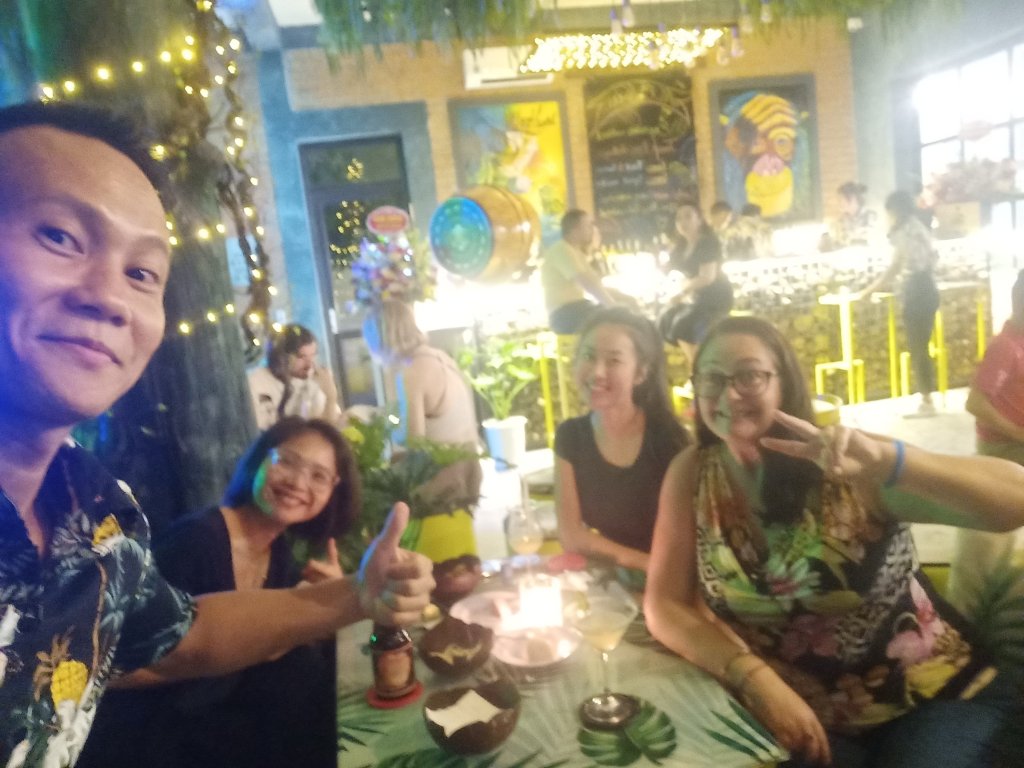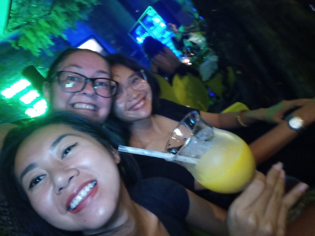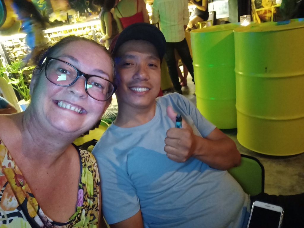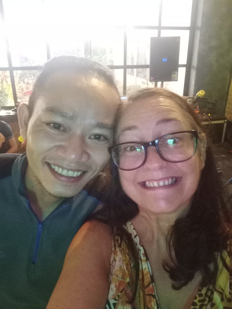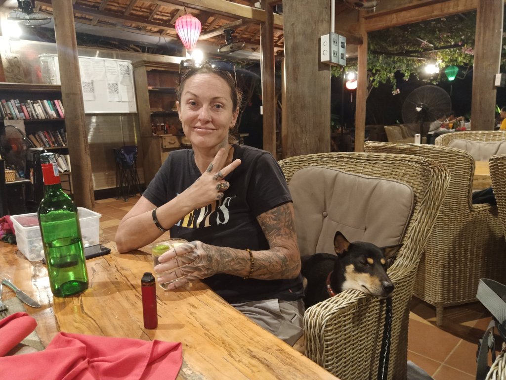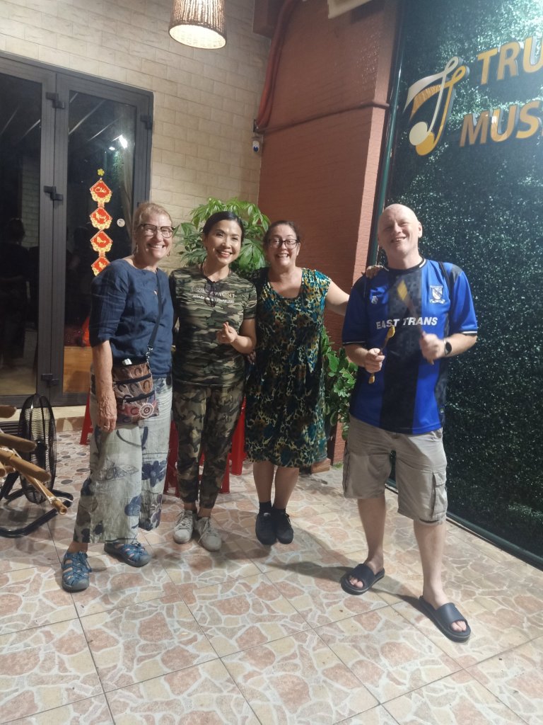 My weekly measurements on Friday 19th August were: Bust -1cm, Waist +2cm, Hips -2cm, Thighs no change Right calf -0.5cm, Left calf -1cm. Eating and drinking whatever I liked was definitely not helping the waistline. I had passion fruit, mango and strawberries for breakfast and pottered about a bit. Caroline had left early for Hoi An and Tatas had gone on a 2 day tour so they were both going to miss out on the fun tonight. I had the remaining chicken fried rice for lunch and watched the rain as it came down quite heavily. I then got on with organising how I was going to get to Phong Nha later, I certainly wouldn’t be cycling Bluey in the rain, despite it still being warm. The new Jungle Boss Pub was having their grand opening tonight from 6pm and, of course, I was keen to go. Everyone was invited and I hoped to see a few friends there. Trang was in Dong Hoi, from Saigon, but was going to be there with Trinh, the owner of Buffalo Home and Chill bar in Dong Hoi. I was cheeky and asked if I could get a lift with them and Trinh, who was driving, very kindly agreed. The rain stopped but I still decided to wear jeans and my jungle inspired top – I even had my hair down.
