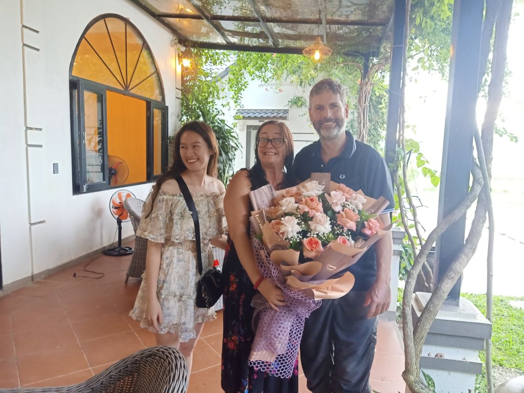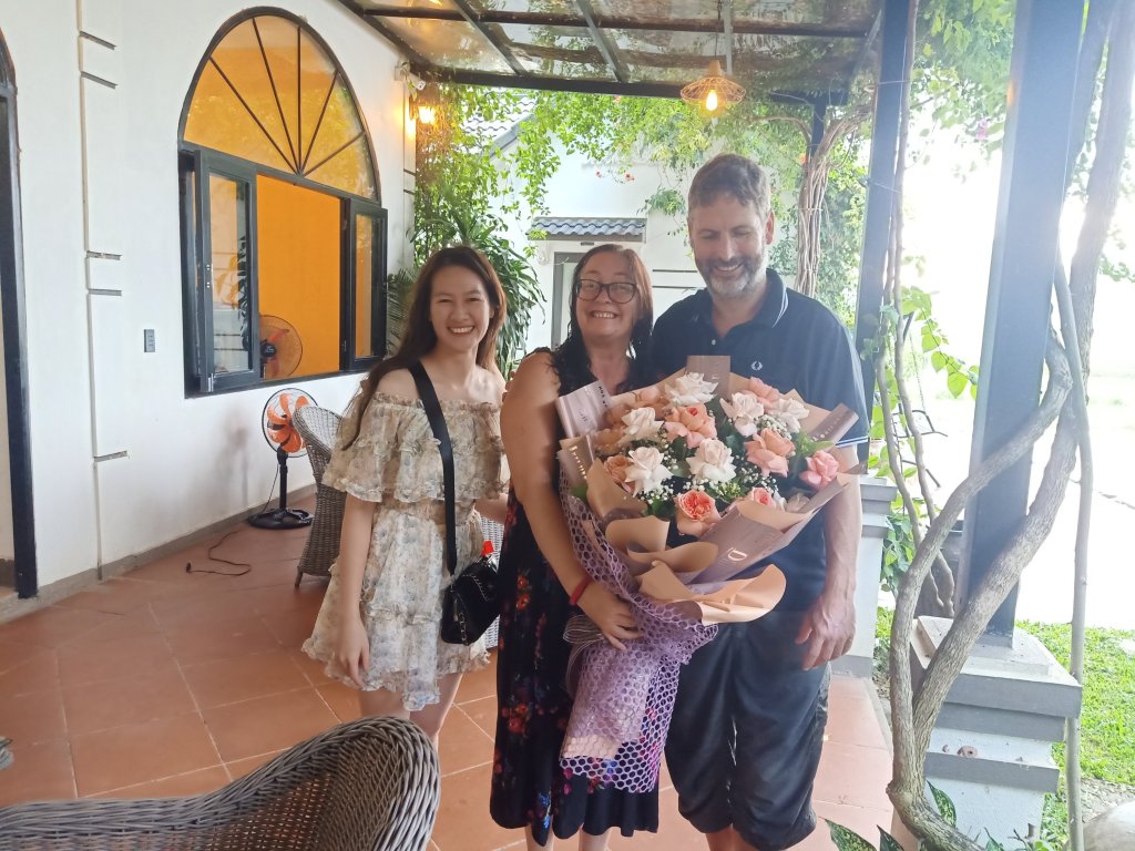I spent most of Sunday 14th August hungover, wishing we didn’t have our own 100th birthday party to attend at 4pm! Captain Caveman had worked out that, because I would be in Dalyan, Turkey, on my actual 50th birthday, and his 50th had been last month, that we should have a joint party in Phong Nha, Vietnam. This would be our first celebration of 100 years but the intention was to have at least one more in Turkey and possibly something in England if we got the chance to go back there this winter. Captain Caveman had arranged for our party today to be at Karst Villas, where Hung (the owner) would have cold beers and nibbles ready for everyone. All our friends in Vietnam had been invited and Captain Caveman had chosen a Sunday so that it gave Oxalis staff the best chance of being able to come. Throughout the day we got various messages from people who were unable to attend and, quite frankly, I fancied declining the invite too! There was no way I could drink after last night’s (and this morning’s) antics. As we set off, on Trigger, it looked like it might rain. We passed the Elements staff (including Duyet) who said they would see us at the party. We had got a few minutes down the road when a huge storm came and we had to take shelter at a stranger’s house. The lady got out her spare chairs and gave them to us to have a seat, we thought it would pass quickly but I think she knew it would be a while. We arrived at our 100th birthday party at least half an hour late but luckily there was only Harry and Linh there that I instantly recognised. Captain Caveman’s friend Dat and her family were there and we were presented with the most gorgeous bunch of flowers. Cuong and his family was also there before us and we were introduced. Harry and Linh introduced us to their colleague, Chuc, and we had our first beer, to be sociable. Some of Captain Caveman’s Oxalis colleagues arrived and we had to have more beer to do cheers with. Stu, Max and Jack arrived and Stu was absolutely wasted so he didn’t stay long. René stopped by for a few beers and then had to get home, while Caroline had still not surfaced from her room (at the Karst Villas). Andrew, Trang and their son came and people started to ask what we had done with Caroline. Bom and Quet arrived looking dapper and drinking only water (lucky them) and joined Mr Tu, Minh and his 2 young sons, who were so well behaved and polite. Last, but certainly not least, to arrive was Kat who had come from Hanoi. She came with a gift of the gluten free tiramisu sweet treats, which I love! Unfortunately Tatas, Chung, Uy, Phuong (all of them), had to work and one friend had the Corona virus so didn’t come. I also think the rain earlier had put a few people off coming. I’d planned on not drinking but it was proving impossible, Captain Caveman sure was taking the cold beers for the team by the time Benjamin and his caving budding, Carolina, arrived. He updated us that he had left yesterday’s pool party at midnight. He knew he had to be ready this morning for his trip but he’d had to come back this morning to get his shoes! Eventually Caroline surfaced with Vee but was unable to stomach a beer and we were ready to say goodbye by that time. After a few celebratory shots (thanks to Kat), we got a taxi home with Benjamin and dropped Carolina off on the way. This time we all went home to our own villas – I was desperate for my bed!