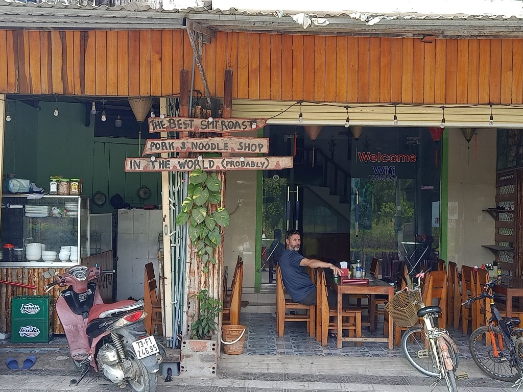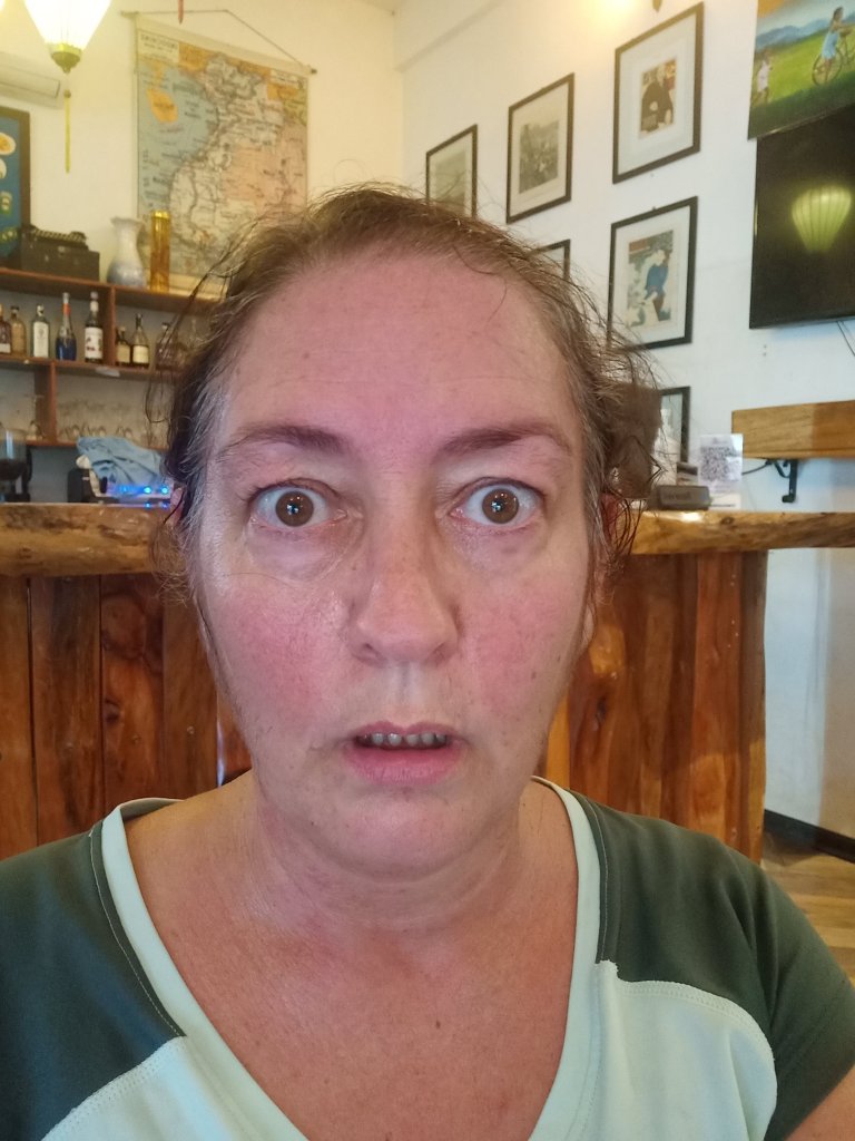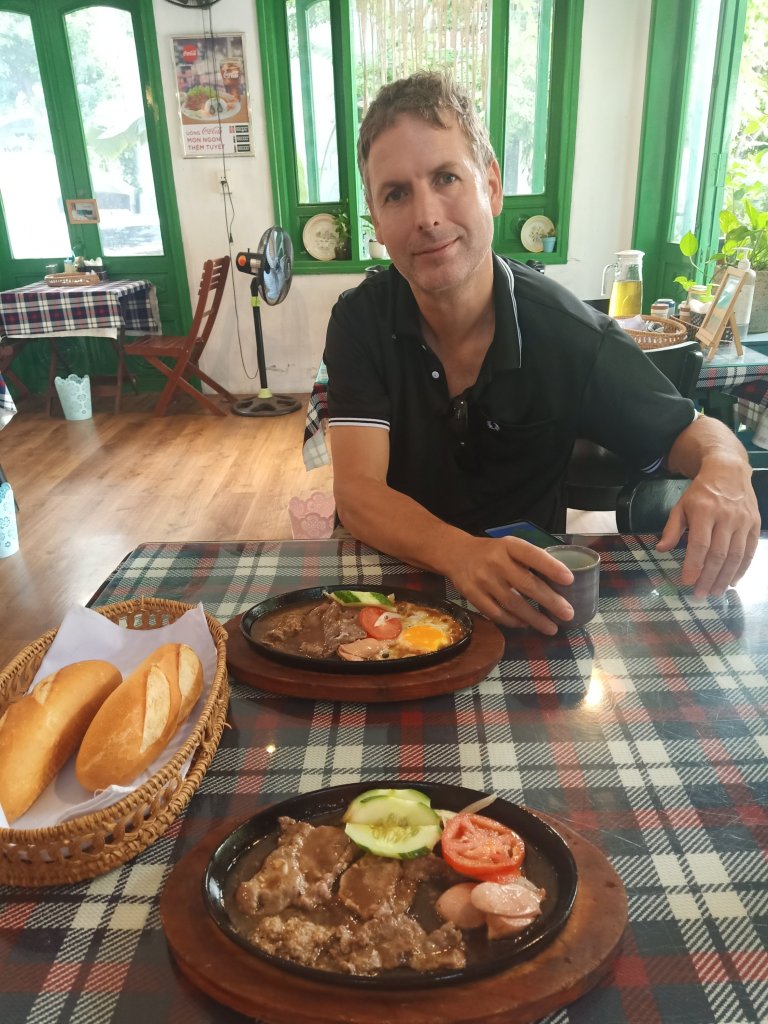 I had a woolly head when the alarm went off at 7am on Sunday 7th August and I wasn’t fit for anything! Captain Caveman had to persuade me to get up and get ready as we were off to Dong Hoi on a shopping trip. We haven’t had the shopping trips with the Phong Nha Farmstay this year, which I used to like as they rarely left so early! The weekly trips had stopped running during the pandemic and never restarted, I guess because there were no other monthly renters so it didn’t warrant just taking us. While Captain Caveman had been working so much he didn’t need to go as often and I made do with whatever we had in the freezer. Captain Caveman had booked an Oxalis car and driver and he was here early. Rain had been forecast so we hoped to get some shopping done, meet a friend and get back before any predicted stormy weather. We got our usual driver, Dung, who’s always nice and friendly but professional. He also keeps the car clean and has the AC on, so we had a comfortable drive to Dong Hoi. By 9am our Bo Ne from Mr Bull’s was ordered and we were sipping the free tea, I was feeling somewhat delicate. I had my steak breakfast without eggs and it actually sorted me out a bit, until I started with a bad stomach.