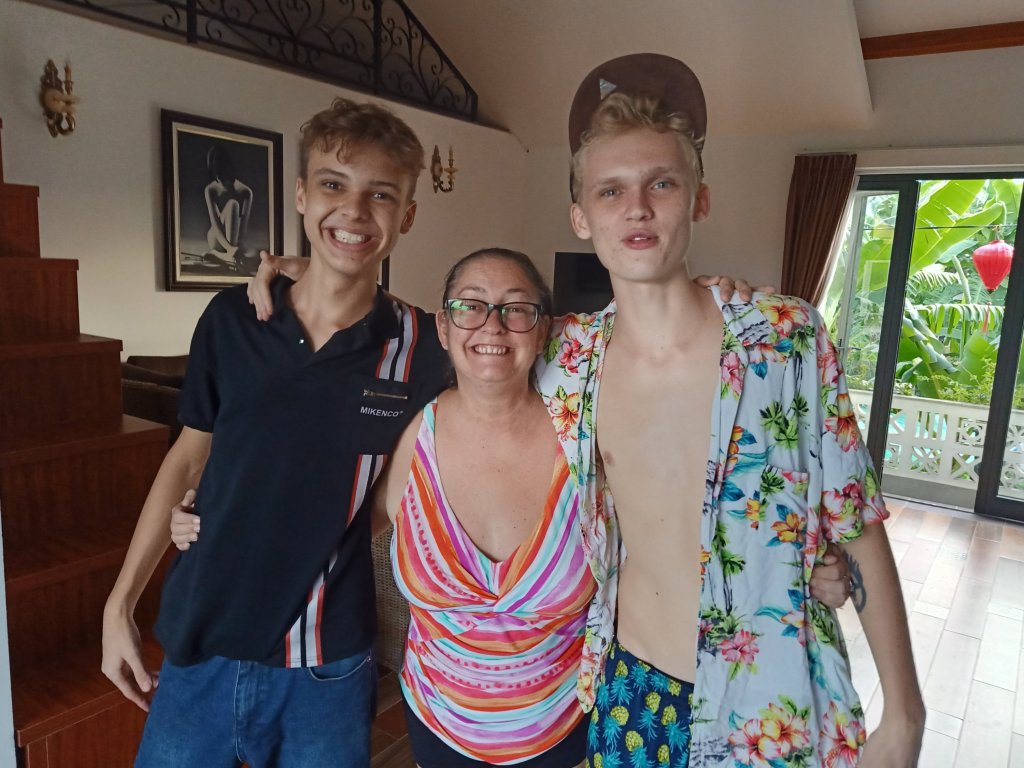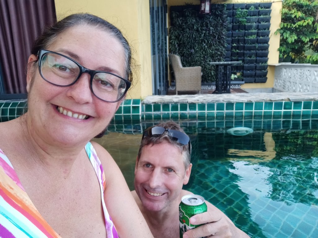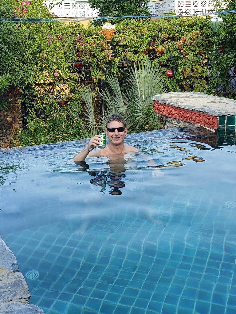 I still had 10 days left on my Vietnamese visa on Tuesday 16th August but there were certainly signs that my stay was now coming to an end. Captain Caveman went to Oxalis while I had my usual teacake loaf for breakfast, then he went to the Glass House to get me a suitcase and drove it back on his motorbike. I already had the suitcase, which I had borrowed from my parents, but Captain Caveman wanted me to utilise the whole of my 25kg allowance, so I needed a bigger case. He would bring back 2 cases, including my parents’ one as he had a bigger allowance than me. Captain Caveman had picked up the sausages from Viet Ha so he made me a 2nd breakfast. It was lovely too and I was impressed with the sausages. I also ordered some strawberries but they would be available to pick up tomorrow. Just before lunch time the cleaners came and stripped the spare bed down to everything except for the mattress protector and took all the remaining towels. I thought they were going to replace them but maybe because of the rain, and the Dong Hoi bedding woman saga, they didn’t have enough to cover both rooms. Captain Caveman had invited Stu and the boys round for beers, dinner and a dip in the pool so they arrived at 5pm. Caroline had already drove over and we had some pool beers. It was a fun evening for us and we carried on drinking and swimming, even after everyone had gone home and the spaghetti bolognese had been eaten.