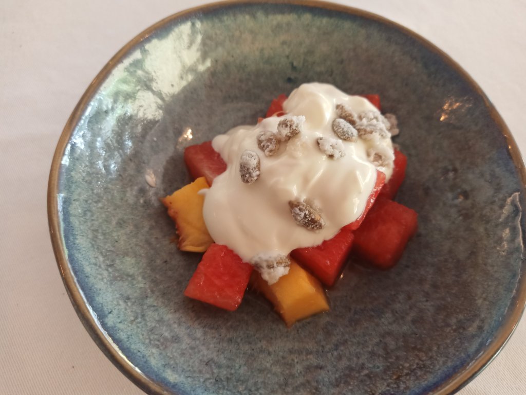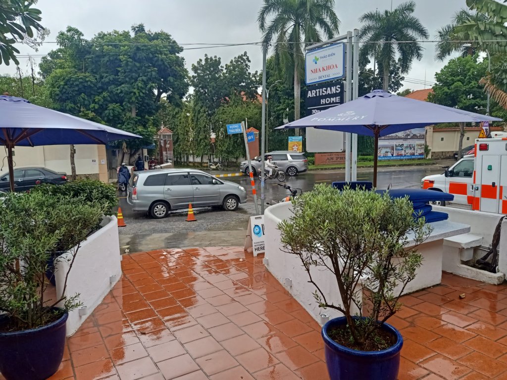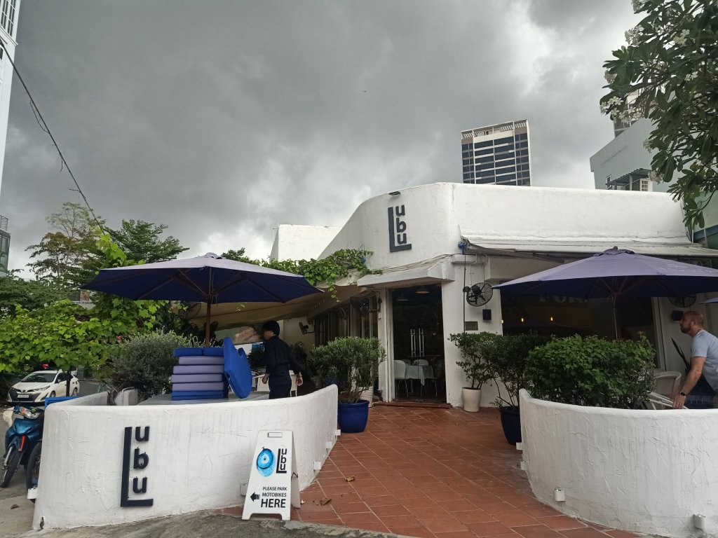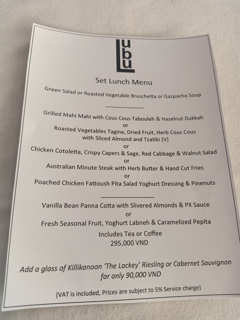 I met Beth at Lubu for lunch and was a little concerned about the weather. We had not gone ahead with going across town for croissants in case we got stuck but we were sure I could walk in rain from Lubu if the streets flooded. I put my shower shoes in my bag just in case that were to happen and I booked a car to the airport with the hotel for 4.15pm, I was taking no chances this time. The Lubu lunch special is so good that I had it again, for 295,000vnd (less than £12) it is fantastic. This time we added on a glass of wine to celebrate Beth and I’s reunion, and our leaving. I had the roasted vegetable bruschetta starter and the steak again, Beth had the green salad then the Mahi Mahi skewers followed by the panna cotta but I could only just manage the fruit and yoghurt for my dessert. After lunch the heavens opened and it looked like the afternoon rain might cause me an issue getting to the airport. I tried to get a Grab taxi from Lubu to The Common Inn (where my luggage remained) earlier than planned but struggled. After saying bye to Beth and Jay I only just made it back to the hotel by 4pm.