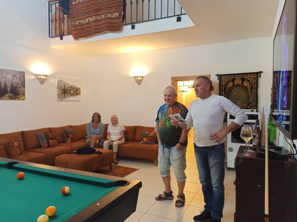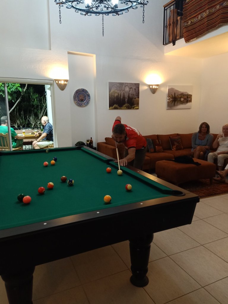 Captain Caveman and I don’t do Halloween so we were pleased to be invited to a non-Halloween party on Monday 31st October. Norman and Edna had slept on our bed at Jamie’s villa and weren’t even up and about by 8.45pm. They had walks and breakfast, making sure I was still checking Jamie’s list for feeding and medication requirements. Vanessa came over to Jamie’s villa, while Captain Caveman had gone Dogging, so that we could do our Turkish homework. We even did it outside on the front patio with a soda water, ice and lemon. For a late lunch I made jacket potatoes with cheese and a bit of sucuk (Turkish sausage) but without butter to make sure it wasn’t too many syns for Fat Club. We had more dog walking in the late afternoon before we got ready to go out. We were already running late to meet Vanessa, Matt, Ma & Pa outside Istanbul restaurant so when we did get there they had already gone on to Adam and Kath’s where the party was already in full swing. Kate was still on her alcohol free stint and doing amazingly well as she sipped water with pomegranate and orange pieces in. Mark was being very supportive by not offering her one of his beers. I thought I could do well to take a leaf out of Kate’s book, as I opened a bottle of Tılsım red wine and poured Captain Caveman and I a glass. I sat next to Linda and she had a glass, there were crisps and Doritos which I luckily couldn’t reach but I saw Captain Caveman shovelling them in like a kid who’d been forever denied treats. Also there, were Andy and Kay who I’d not seen for a bit so it was good to catch up. Jack & Sue and Nigel & Amanda were at the other end of the table with some people I didn’t know so I didn’t get to chat to them. Adam and Kath had put a delightful spread of food on and it was definitely difficult to stick to the diet as I ate ham in a breadcake with some salad items, including olives which are not syn free. I was spared the fab looking roast potatoes as they had chillies on and I did have some crisps. Linda got a second bottle of wine out for the 3 of us to share, it was one I’d not tried before and I liked it. Matt decided to organise a pool tournament and it turned in to a right laugh. My Dad doesn’t usually play and, because of his bad eyesight, he wasn’t up for playing but it wasn’t an option – our names were down. We had a few rounds of Killer, which I like best and Dad wasn’t the worst player. Captain Caveman and I actually left at a reasonable hour as we wanted to get back for the dogs. On our way ‘home’ we walked near to the new Jazz Bar in the square next to Migros which was very lively. Norman and Edna looked like they hadn’t moved from the sofa when we got ‘home’ so I’m sure we could have stayed out longer. We left before my parents, Mark & Kate and Vanessa & Matt who were still giving the ball a good kick.